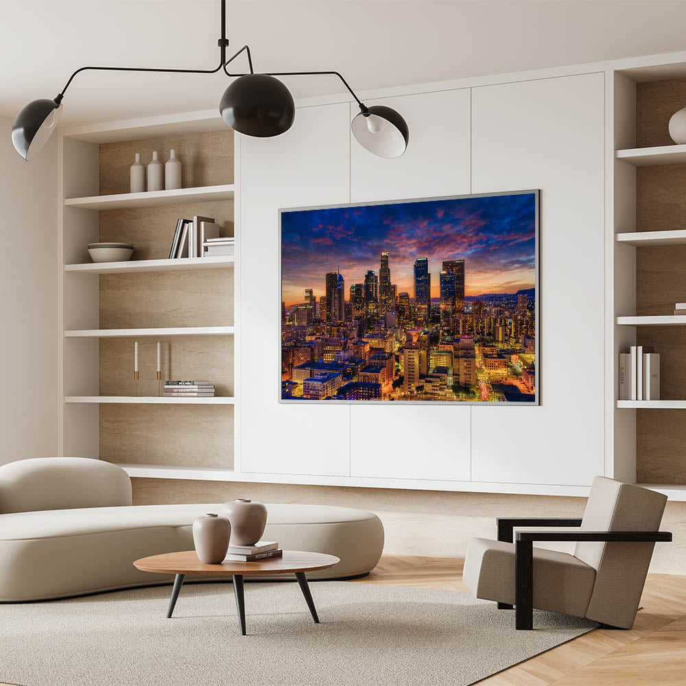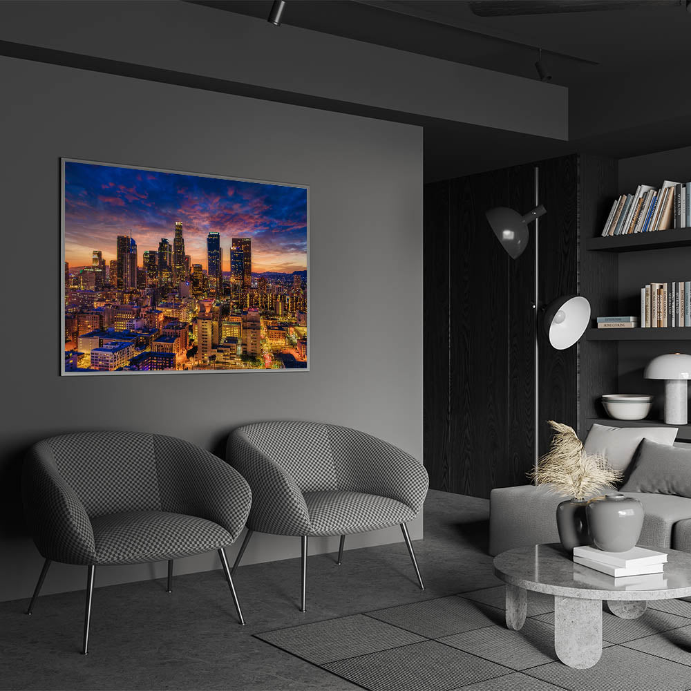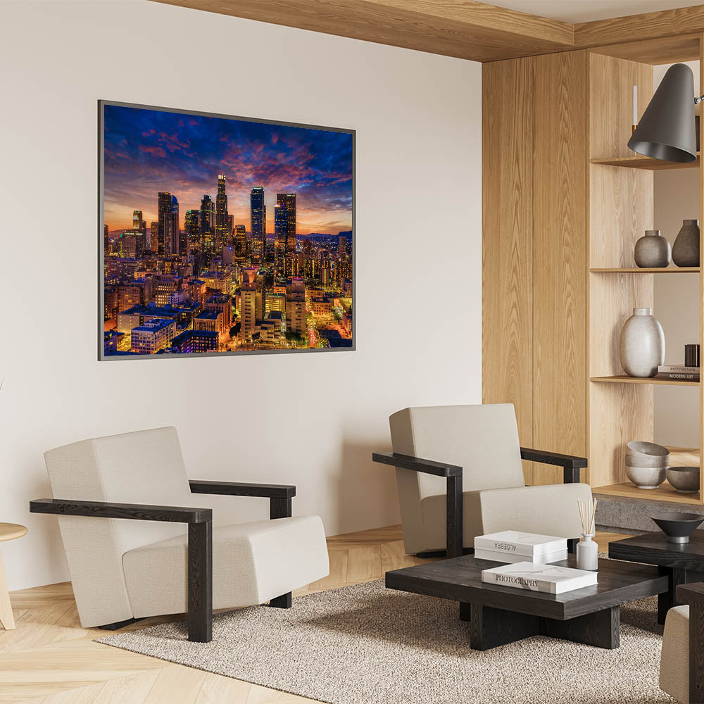Transform your space with this dynamic cityscape of downtown Los Angeles at dusk. The colorful sunset and shimmering city lights create a perfect blend of urban energy and natural beauty, making it a stunning statement piece for any room. Ideal for fans of modern cityscapes and those who love the vibrant atmosphere of LA.