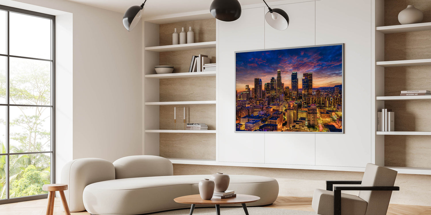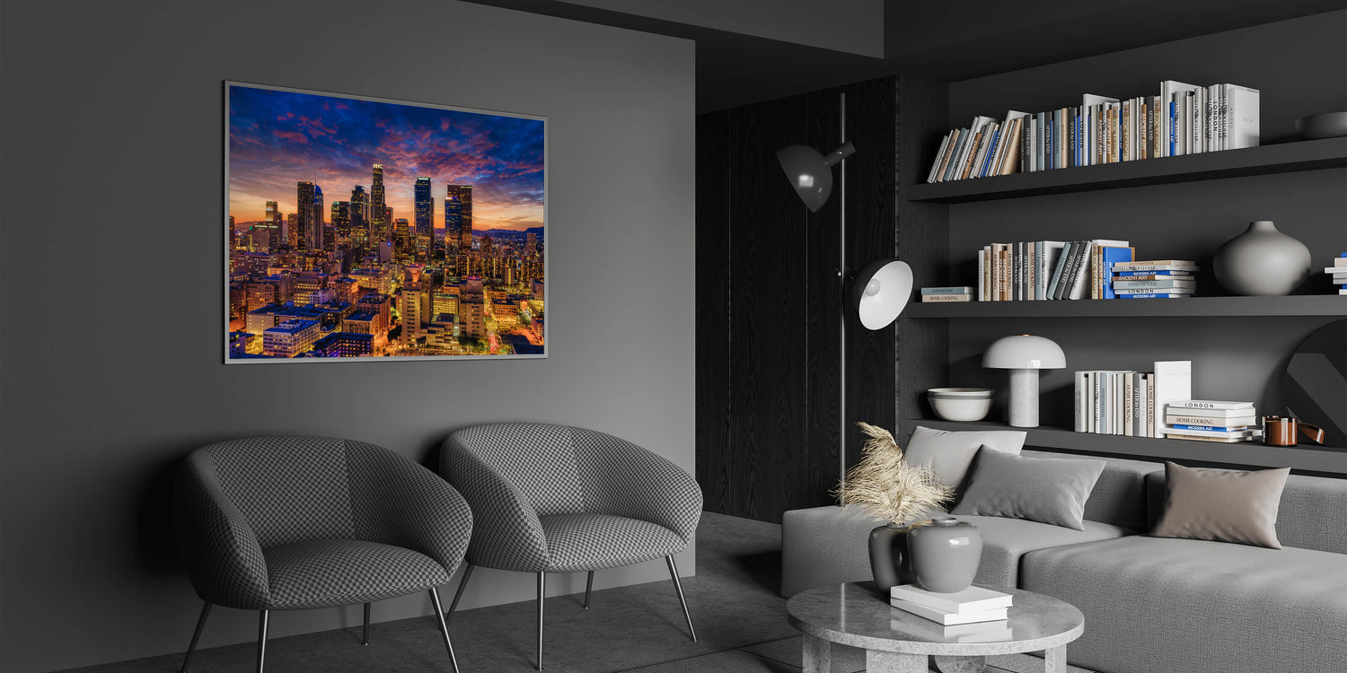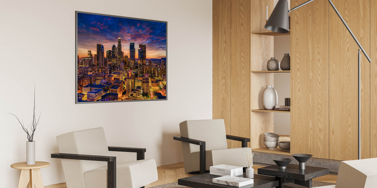 Transform your space with this dynamic cityscape of downtown Los Angeles at dusk. The colorful sunset and shimmering city lights create a perfect blend of urban energy and natural beauty, making it a stunning statement piece for any room. Ideal for fans of modern cityscapes and those who love the vibrant atmosphere of LA.