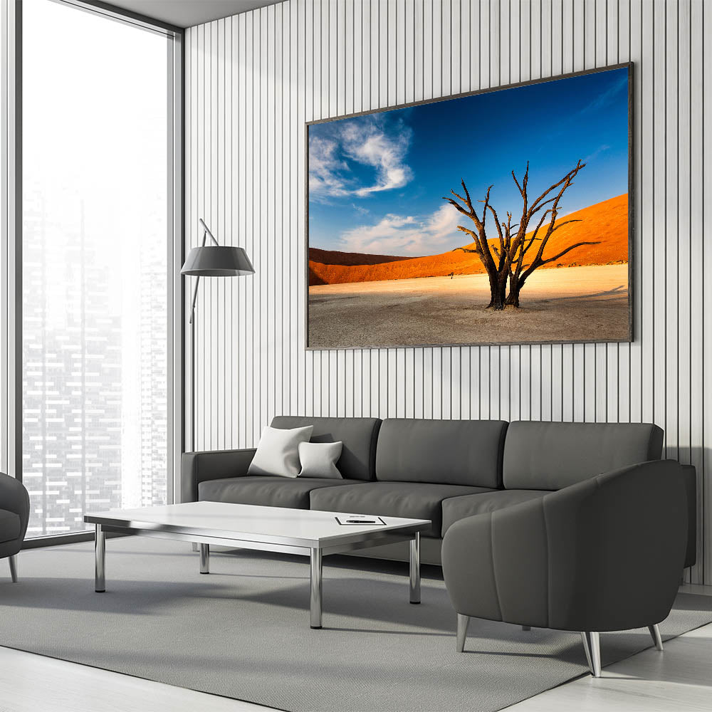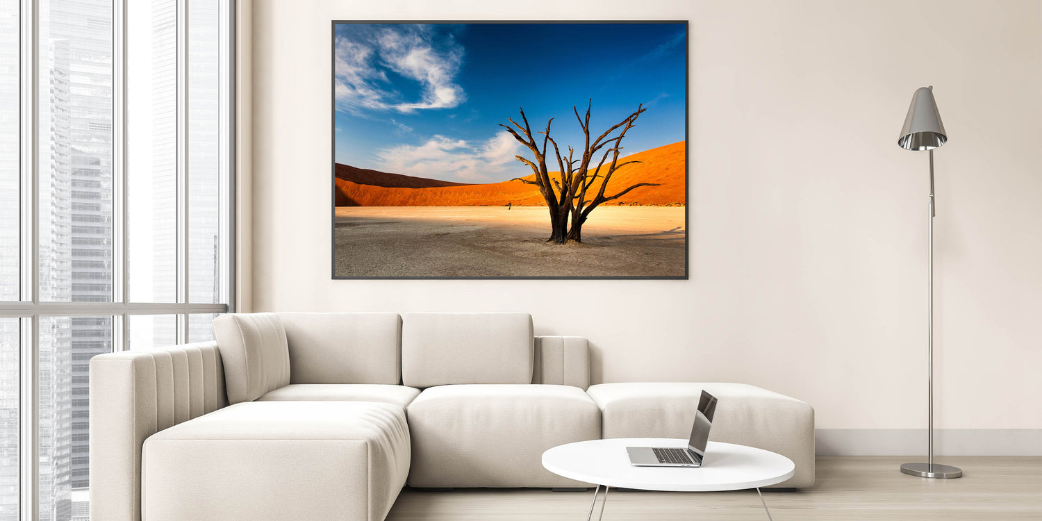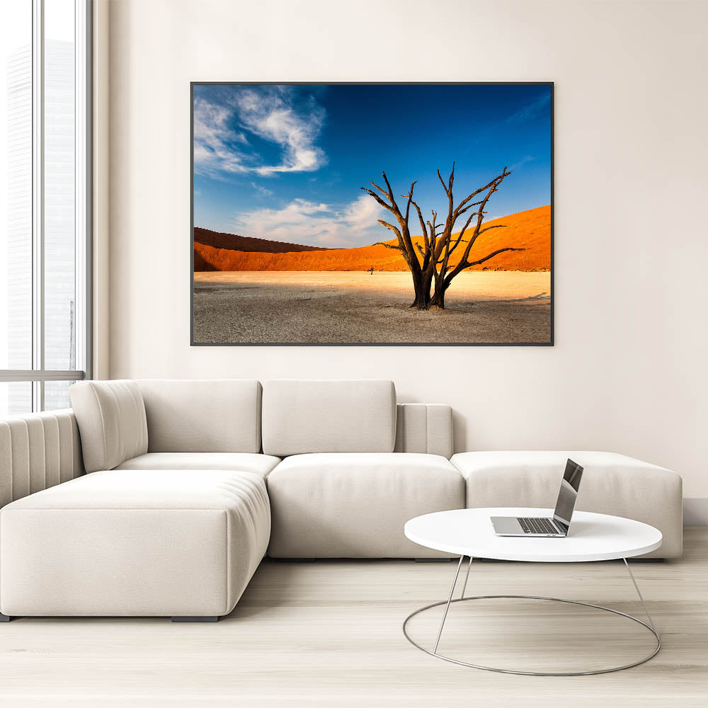 Immerse yourself in the stark beauty of Namibia with this captivating wall art, featuring the skeletal remains of a tree standing tall against the backdrop of vivid orange dunes and a clear blue sky. This Namibian landscape photography captures the raw and dramatic scenery of Africa’s deserts, making it an ideal piece for those looking to add a touch of nature's untamed beauty to their living or working space.