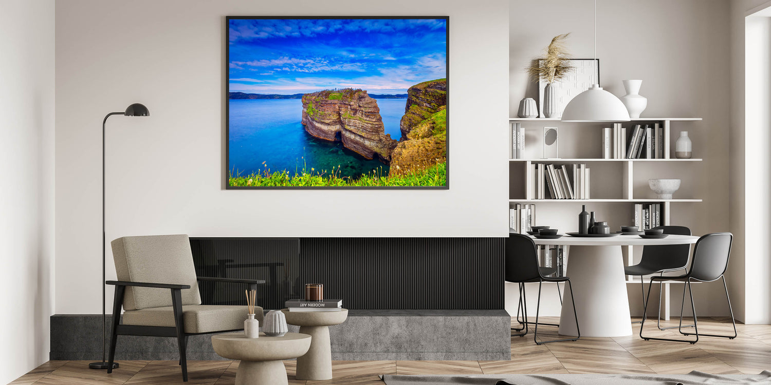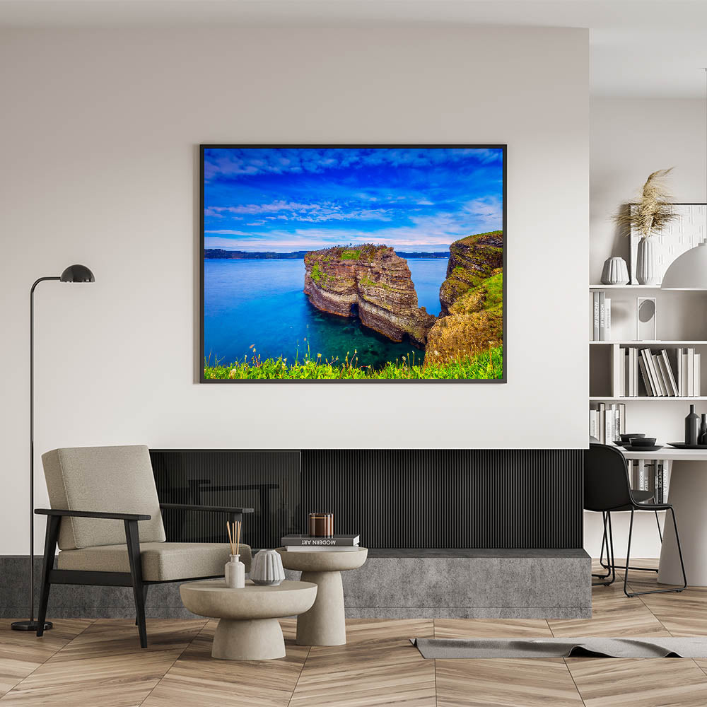 Explore the breathtaking cliffs of Newfoundland with this captivating coastal wall art. The scene showcases dramatic rock formations surrounded by the pristine blue waters of the Atlantic Ocean, perfectly highlighting the rugged beauty of Canada's east coast. This artwork is an ideal addition for anyone looking to bring a piece of Newfoundland’s natural landscape into their home or office.