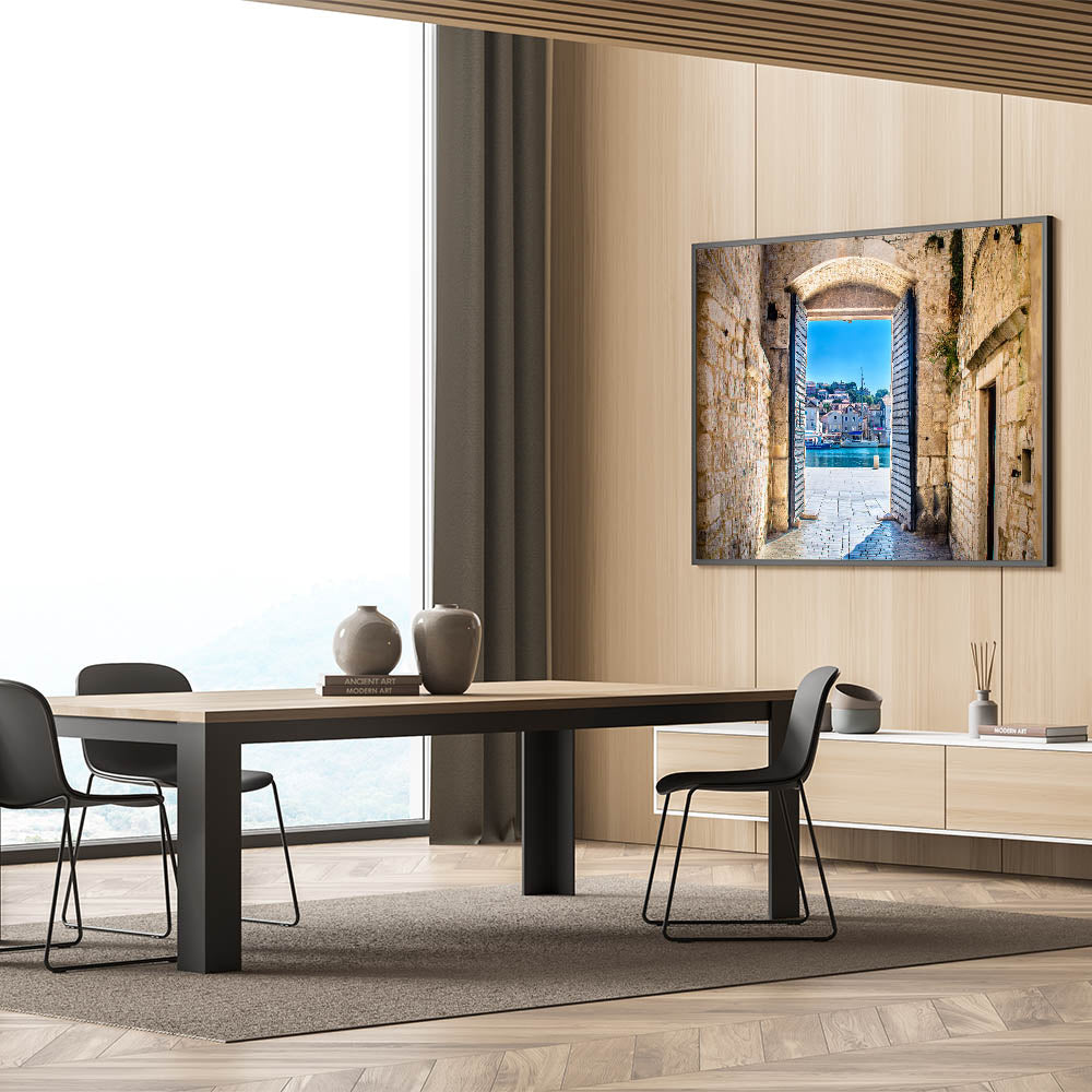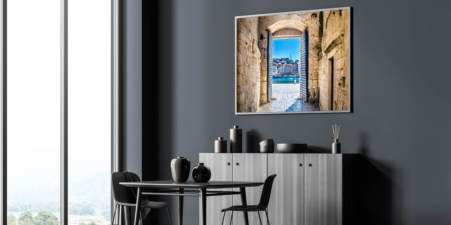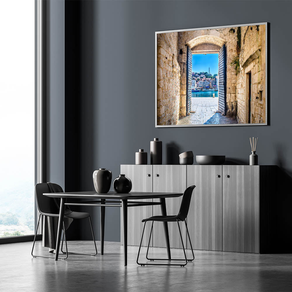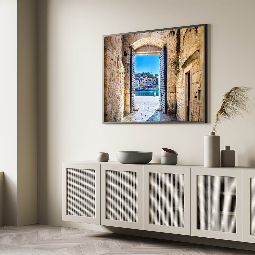 Unveil the beauty of Dubrovnik through our "Historic Harbor Archway View Print," a stunning depiction that frames the vibrant harbor through an ancient stone arch, capturing the essence of this iconic Croatian city.