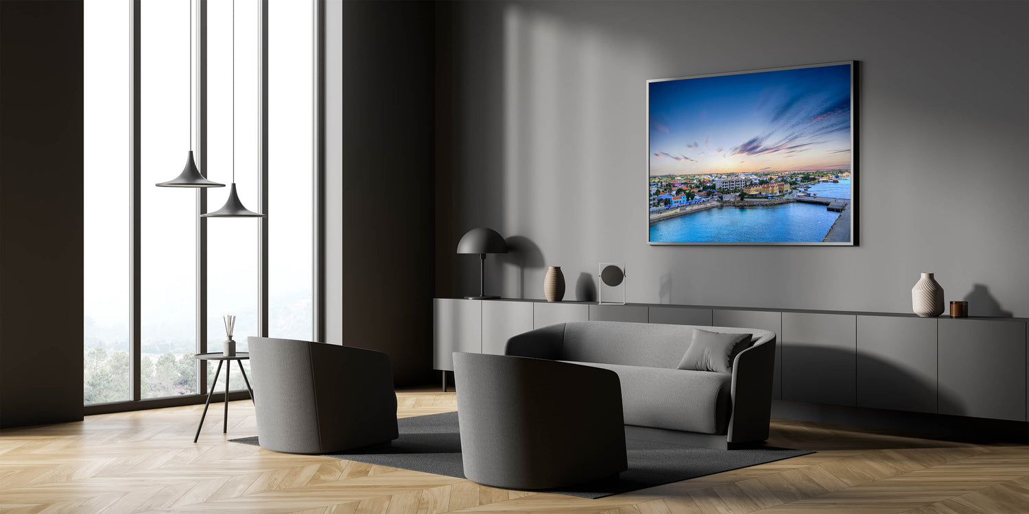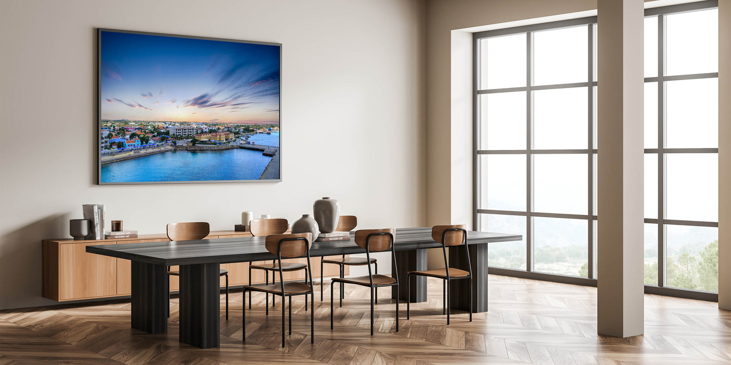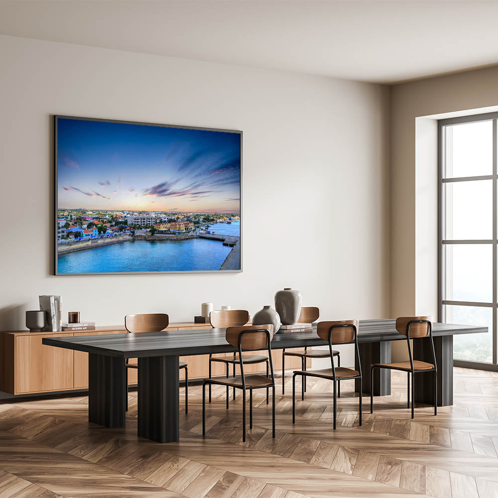 This vibrant aerial view of Aruba’s coastal town captures the essence of the island's lively and colorful architecture. Set against the backdrop of a serene ocean and a soft, pastel sky, this piece brings the charm of the Dutch Caribbean straight into your home. The colorful houses, peaceful harbor, and gently streaked clouds in the sky evoke a sense of warmth and tranquility, making this artwork a perfect addition to any room in need of a cheerful, island-inspired atmosphere.