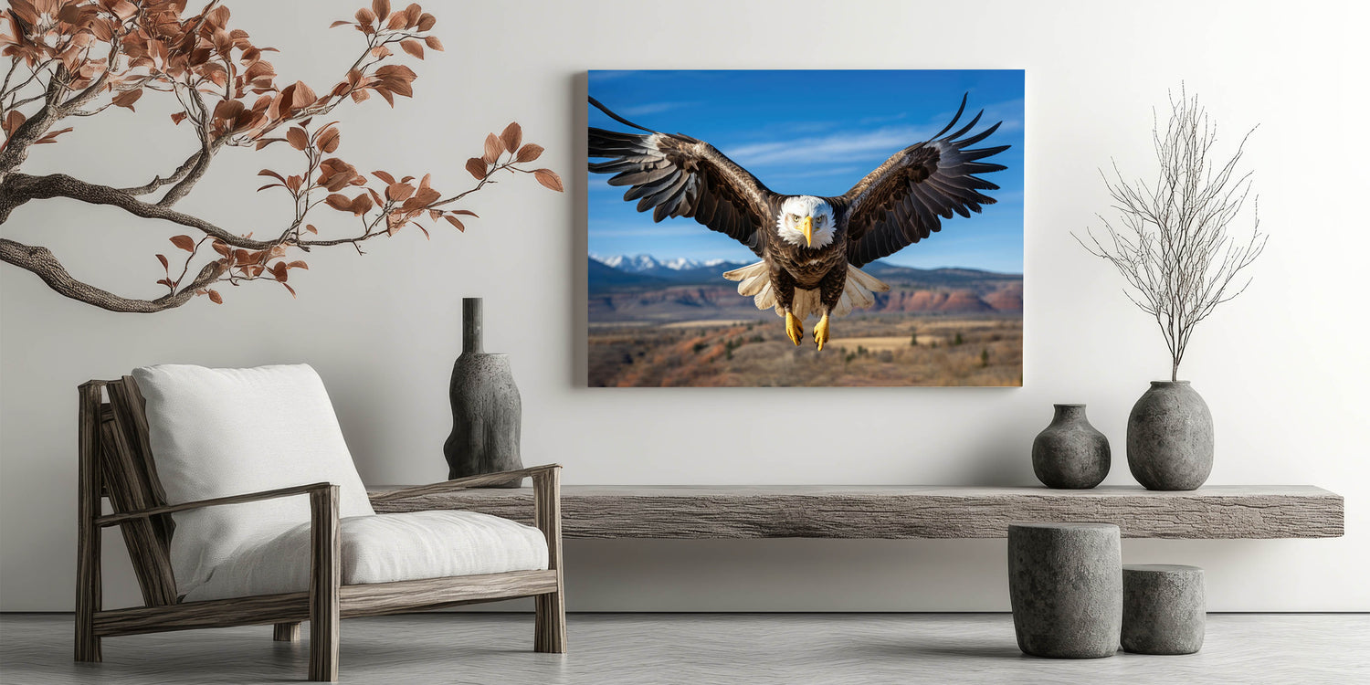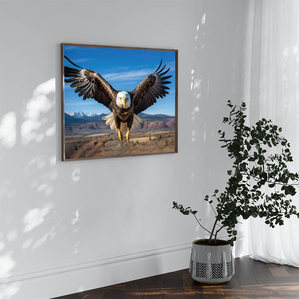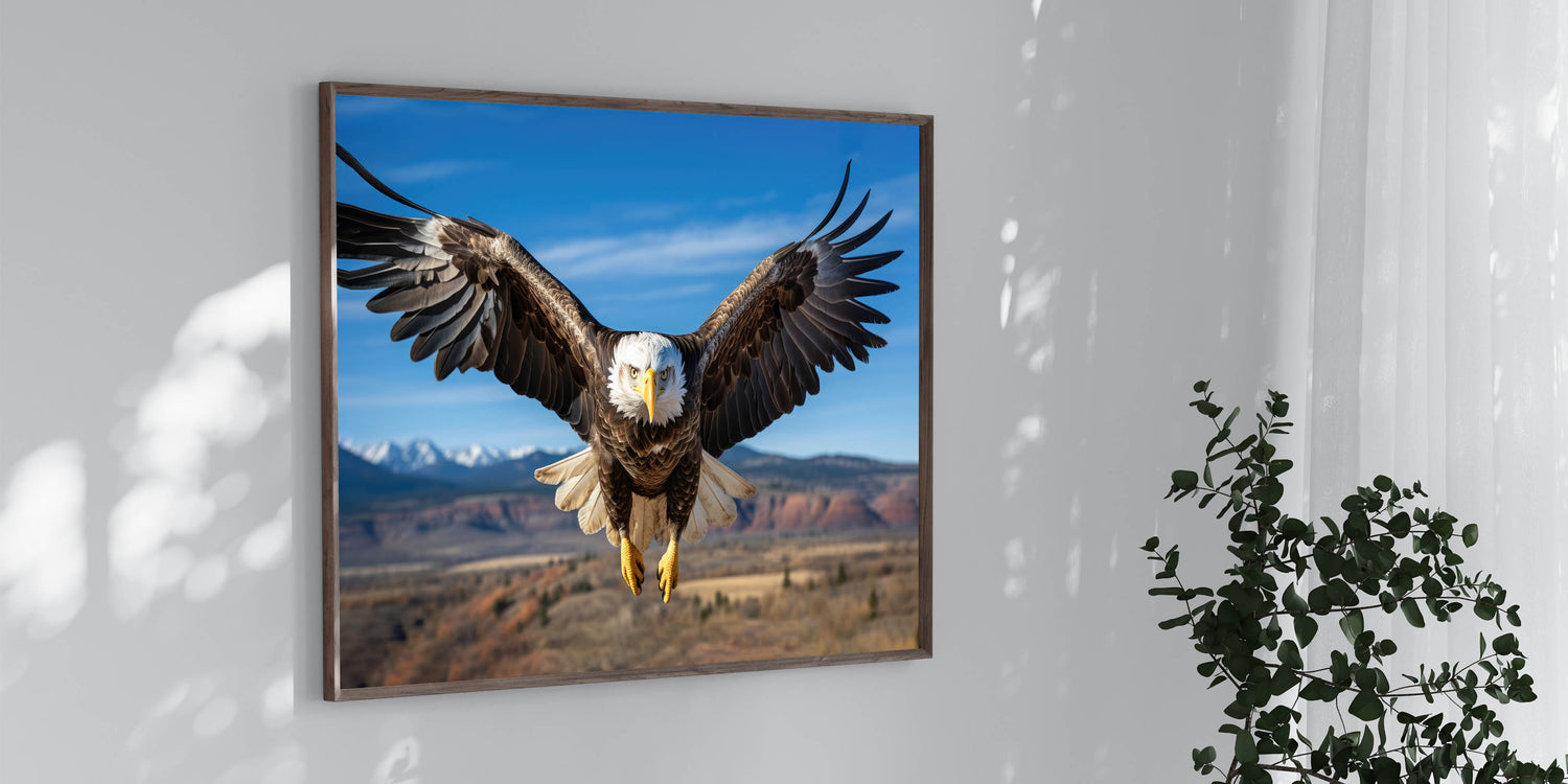This stunning birds of prey wall art is perfect for those who appreciate the wild beauty of nature. The high-quality bald eagle photograph serves as an inspiring focal point in any living room, office, or study, adding a touch of nature's grandeur to your home.