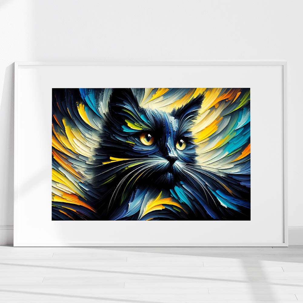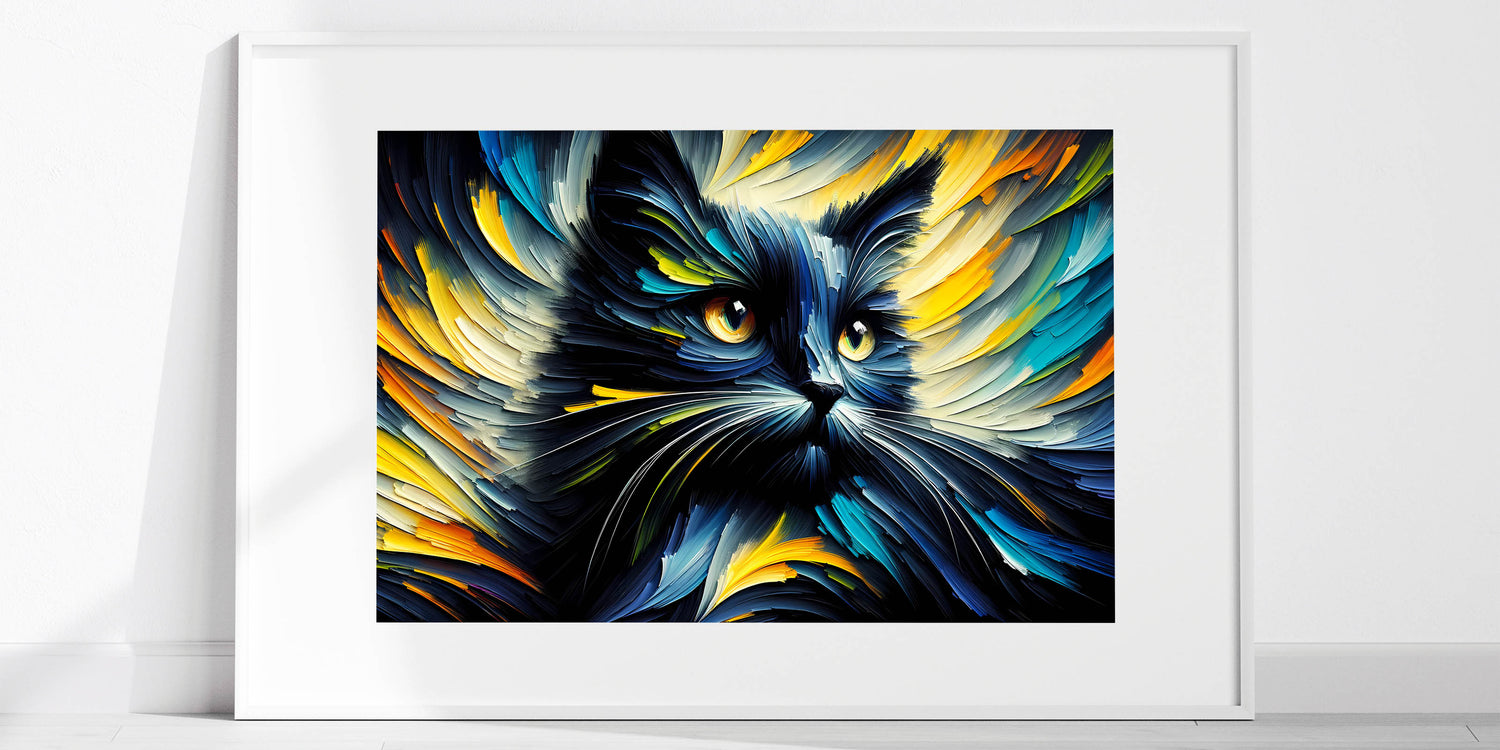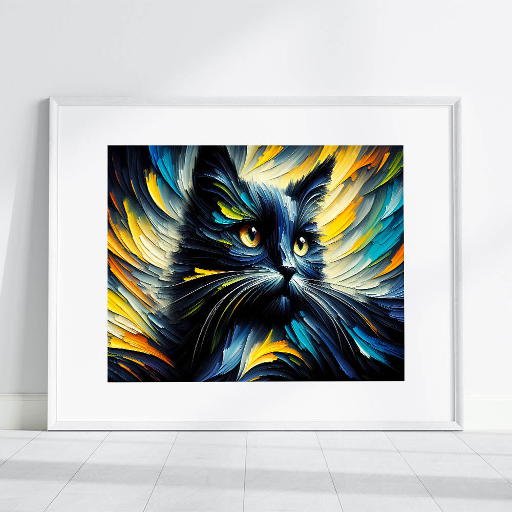 Transform your space with this dynamic and vibrant cat wall art, featuring an explosion of colors and movement. This artwork captures the energy and intensity of a cat in an abstract, expressive style, making it a perfect statement piece for modern and contemporary interiors. The swirling strokes of blues, yellows, and oranges create a mesmerizing effect that will draw the eye and spark the imagination. Whether you're decorating a living room, bedroom, or office, this cat print will add a touch of boldness and creativity to your decor.