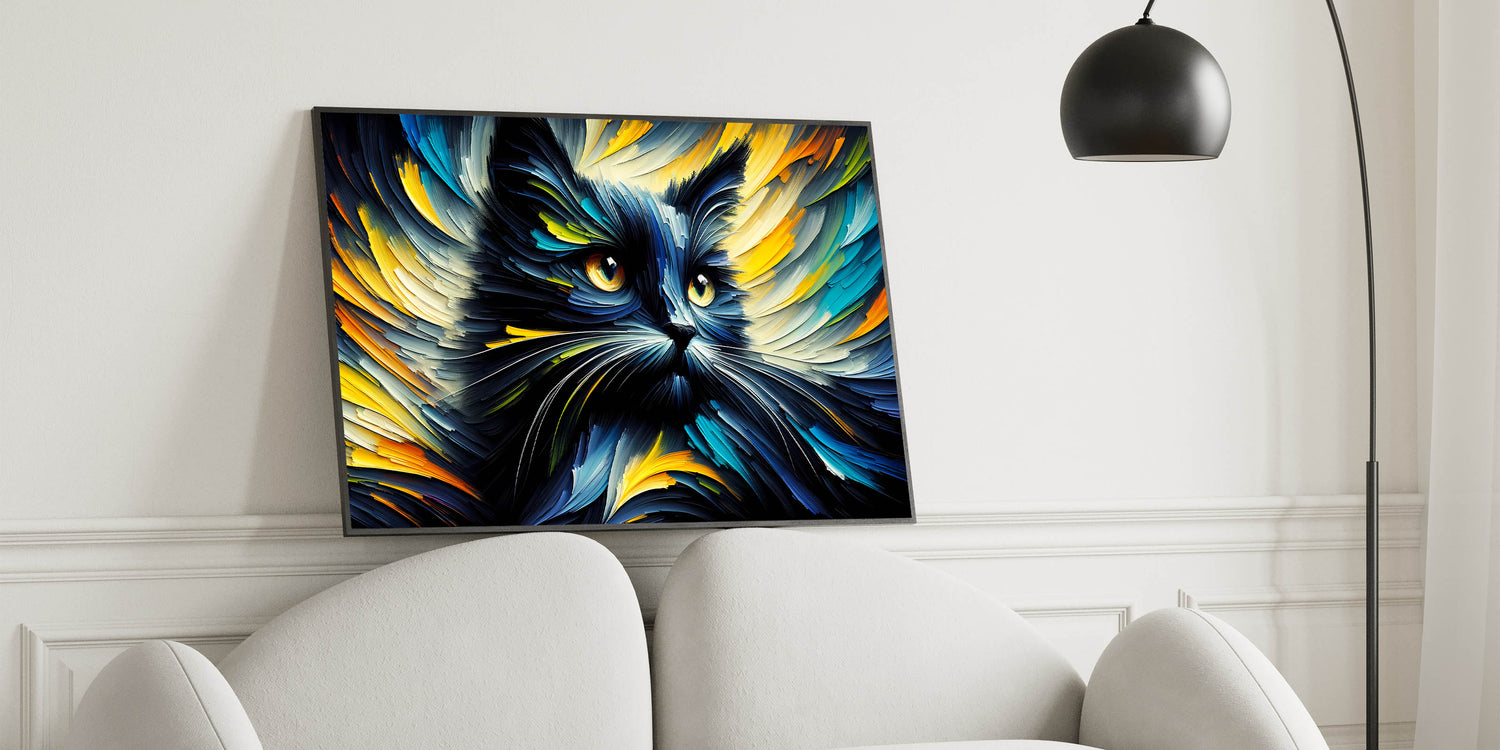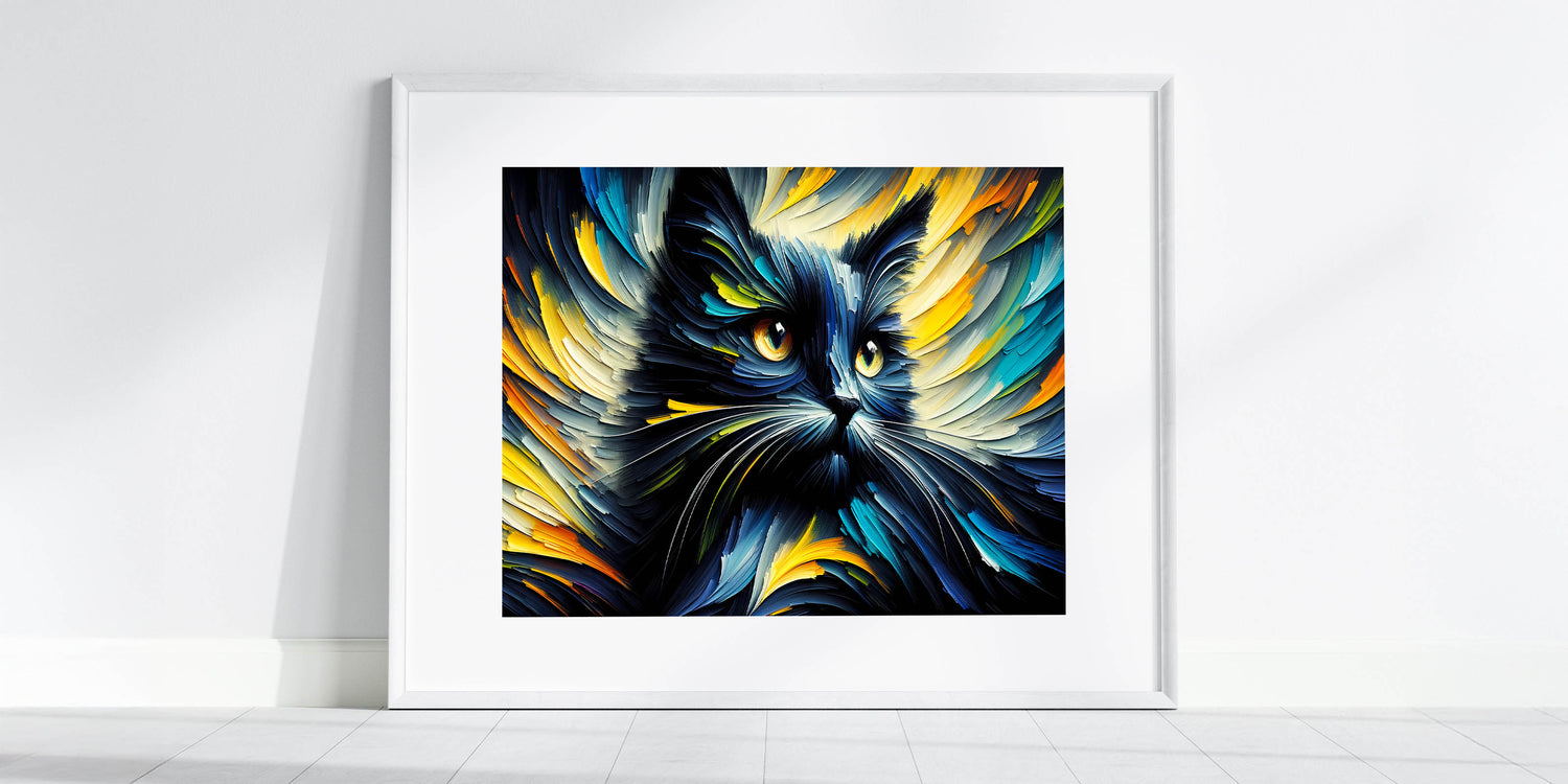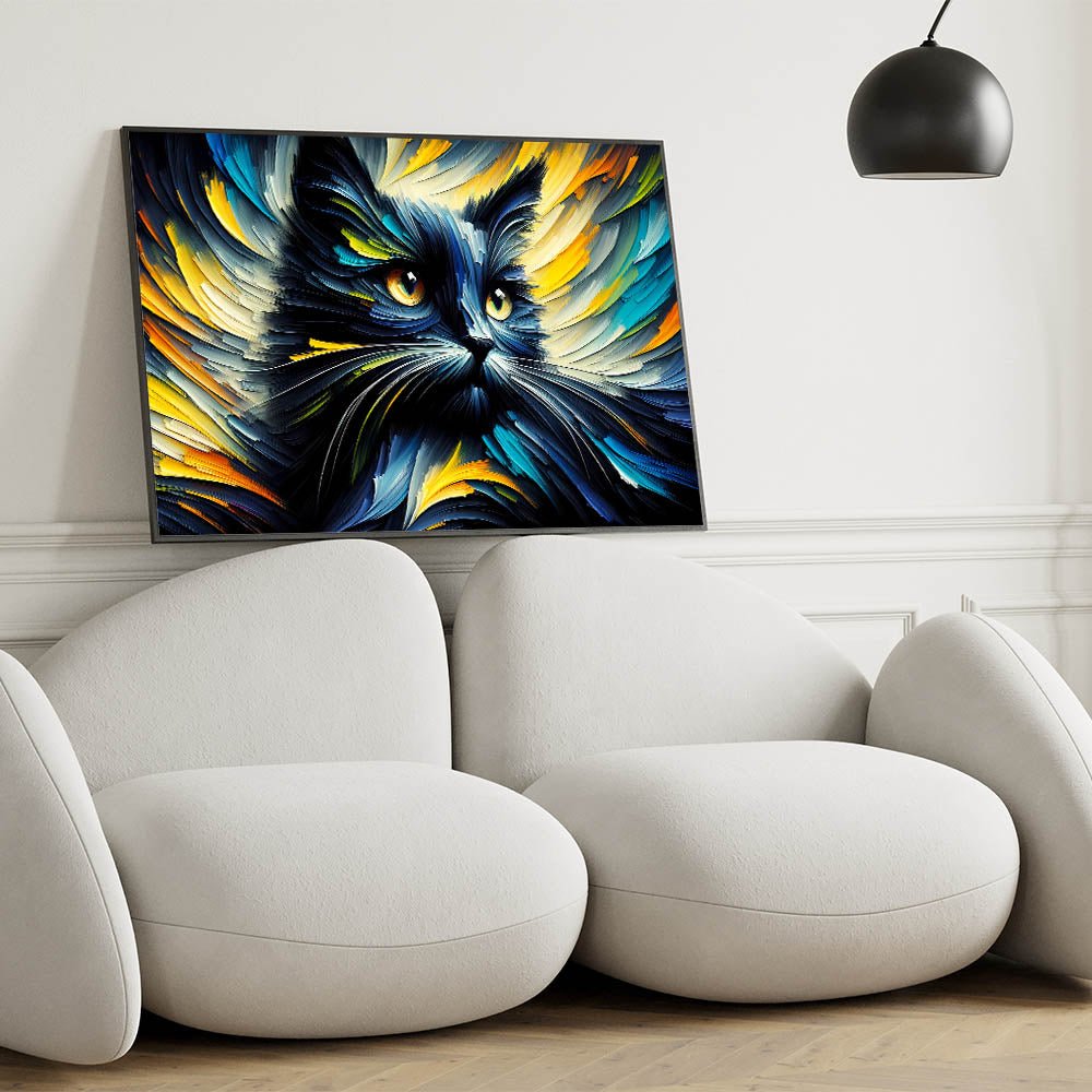 Transform your space with this dynamic and vibrant cat wall art, featuring an explosion of colors and movement. This artwork captures the energy and intensity of a cat in an abstract, expressive style, making it a perfect statement piece for modern and contemporary interiors. The swirling strokes of blues, yellows, and oranges create a mesmerizing effect that will draw the eye and spark the imagination. Whether you're decorating a living room, bedroom, or office, this cat print will add a touch of boldness and creativity to your decor.