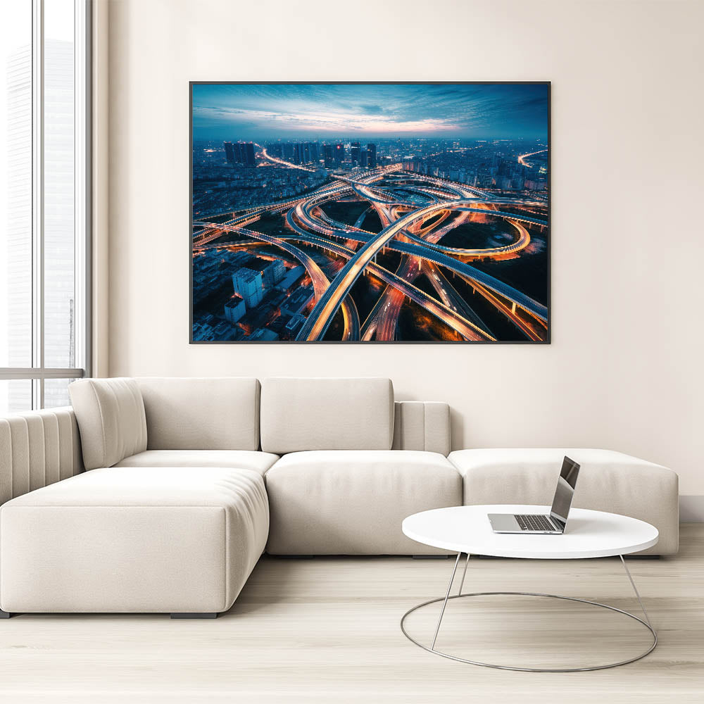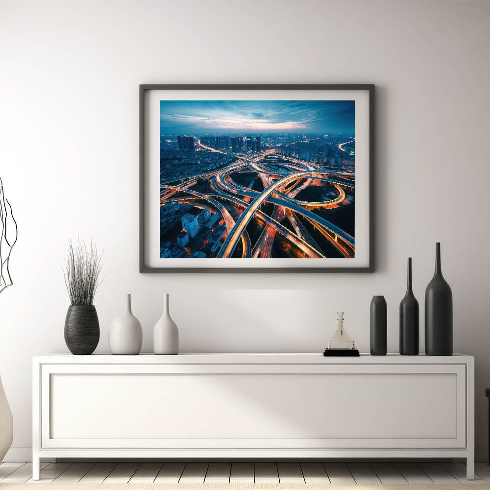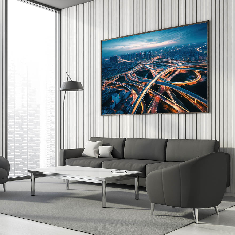 Capture the energy and complexity of urban life with this dynamic city highway wall art. The image portrays a stunning aerial view of a network of illuminated overpasses and highways, weaving through the cityscape as dusk settles in. The interplay of light trails from moving vehicles creates a mesmerizing pattern, symbolizing the constant flow and movement of city life. This artwork is perfect for those who appreciate the vibrancy of urban landscapes and the beauty found in the intricacies of modern infrastructure.