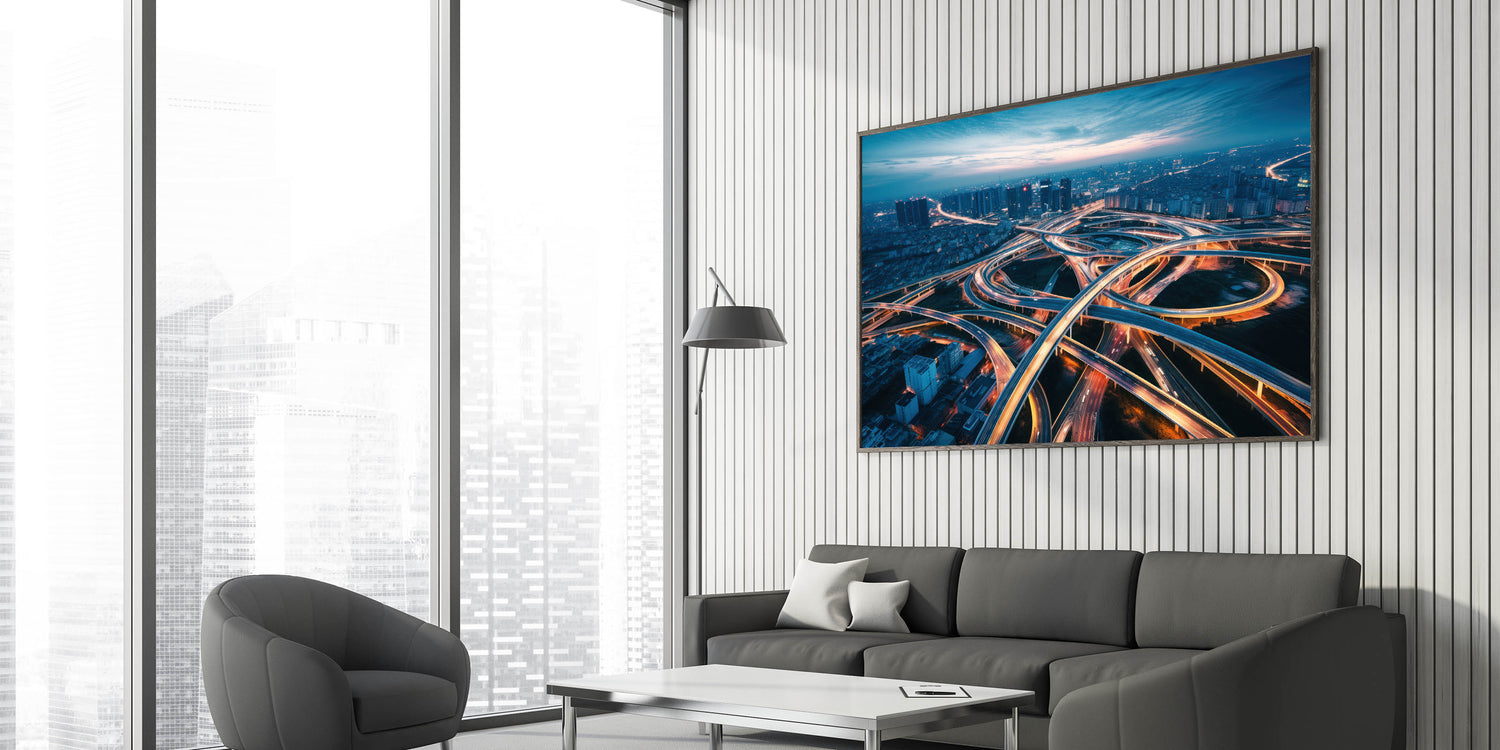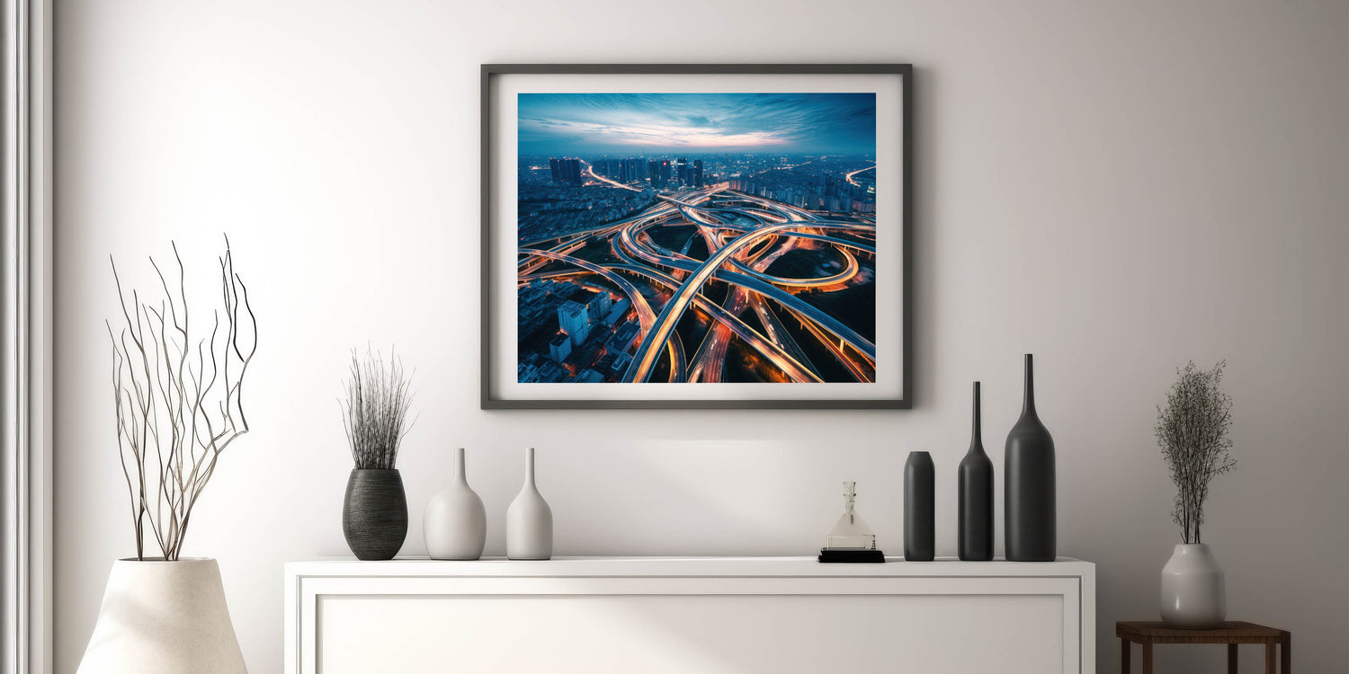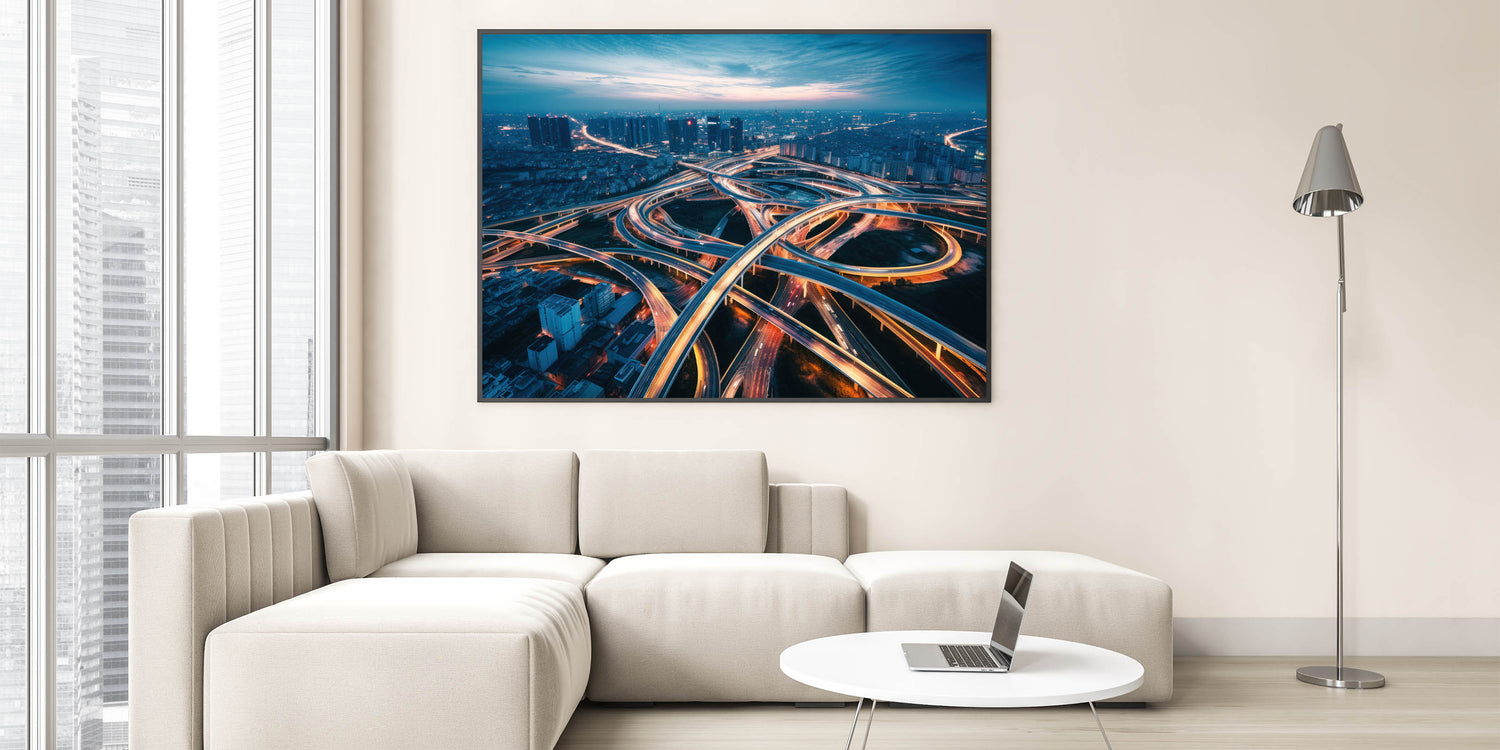 Capture the energy and complexity of urban life with this dynamic city highway wall art. The image portrays a stunning aerial view of a network of illuminated overpasses and highways, weaving through the cityscape as dusk settles in. The interplay of light trails from moving vehicles creates a mesmerizing pattern, symbolizing the constant flow and movement of city life. This artwork is perfect for those who appreciate the vibrancy of urban landscapes and the beauty found in the intricacies of modern infrastructure.
