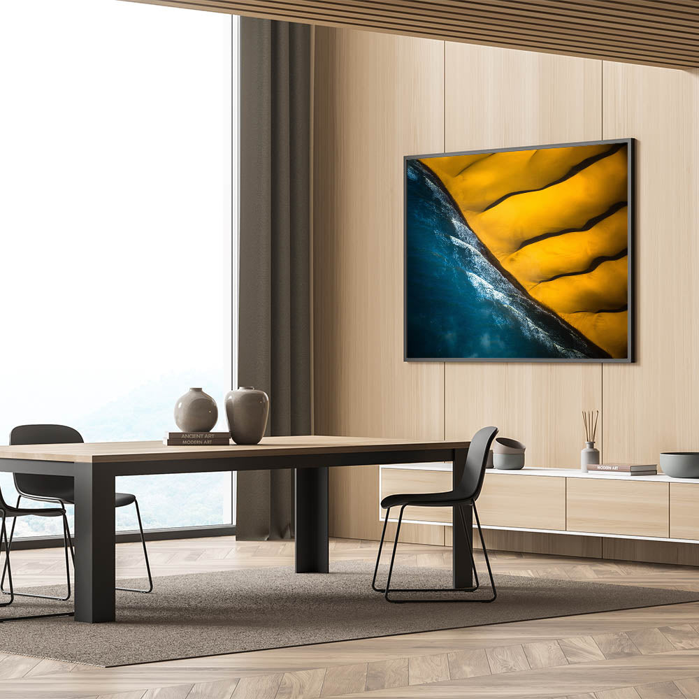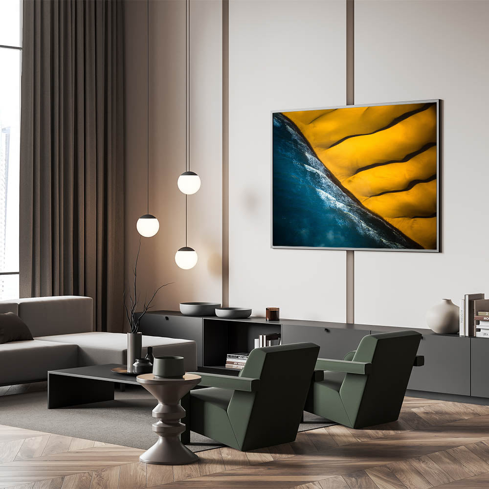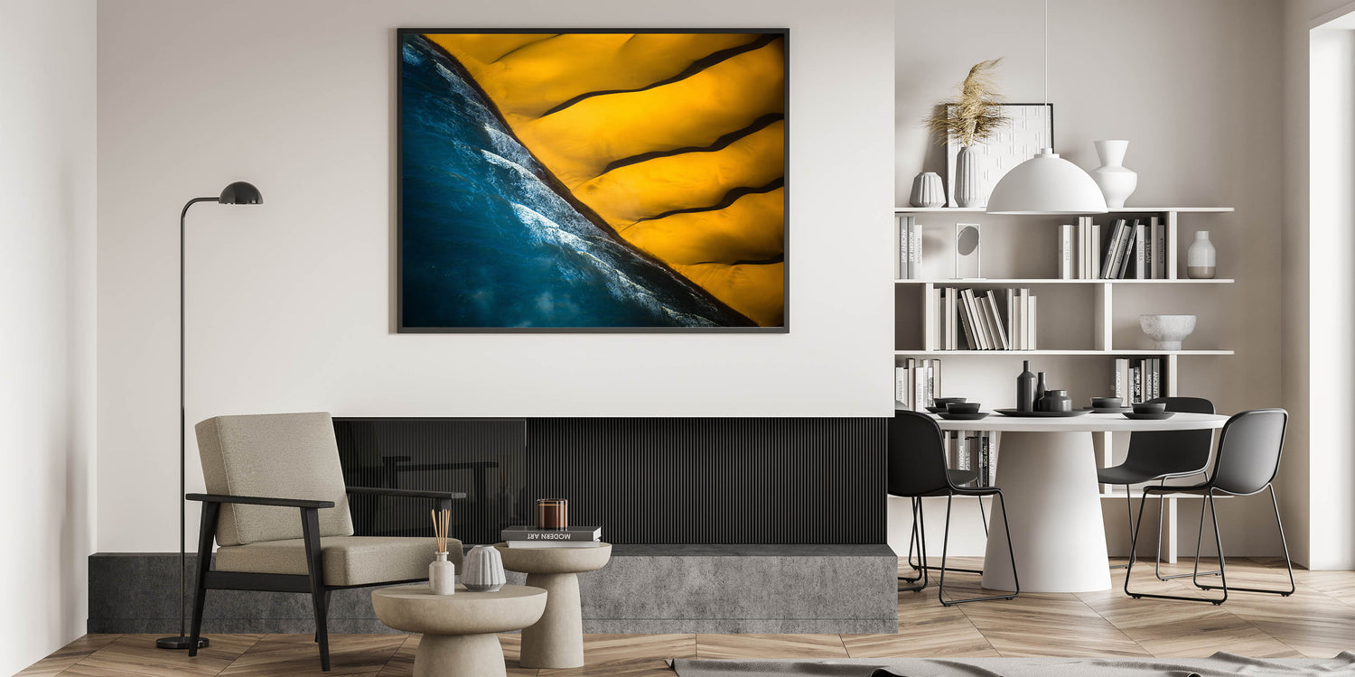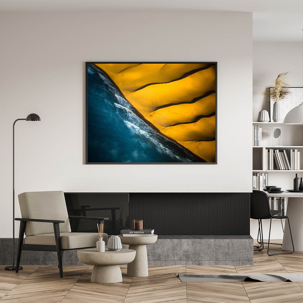 Discover the dynamic interplay between land and sea with this striking wall art, featuring the sweeping curves of Namibia's desert dunes meeting the powerful waves of the Atlantic Ocean. Captured from an aerial perspective, this abstract piece of Namibian landscape photography showcases the bold contrasts and harmonious flow between the vibrant golden sands and the deep blue waters, making it an exceptional addition to any modern or nature-inspired decor.