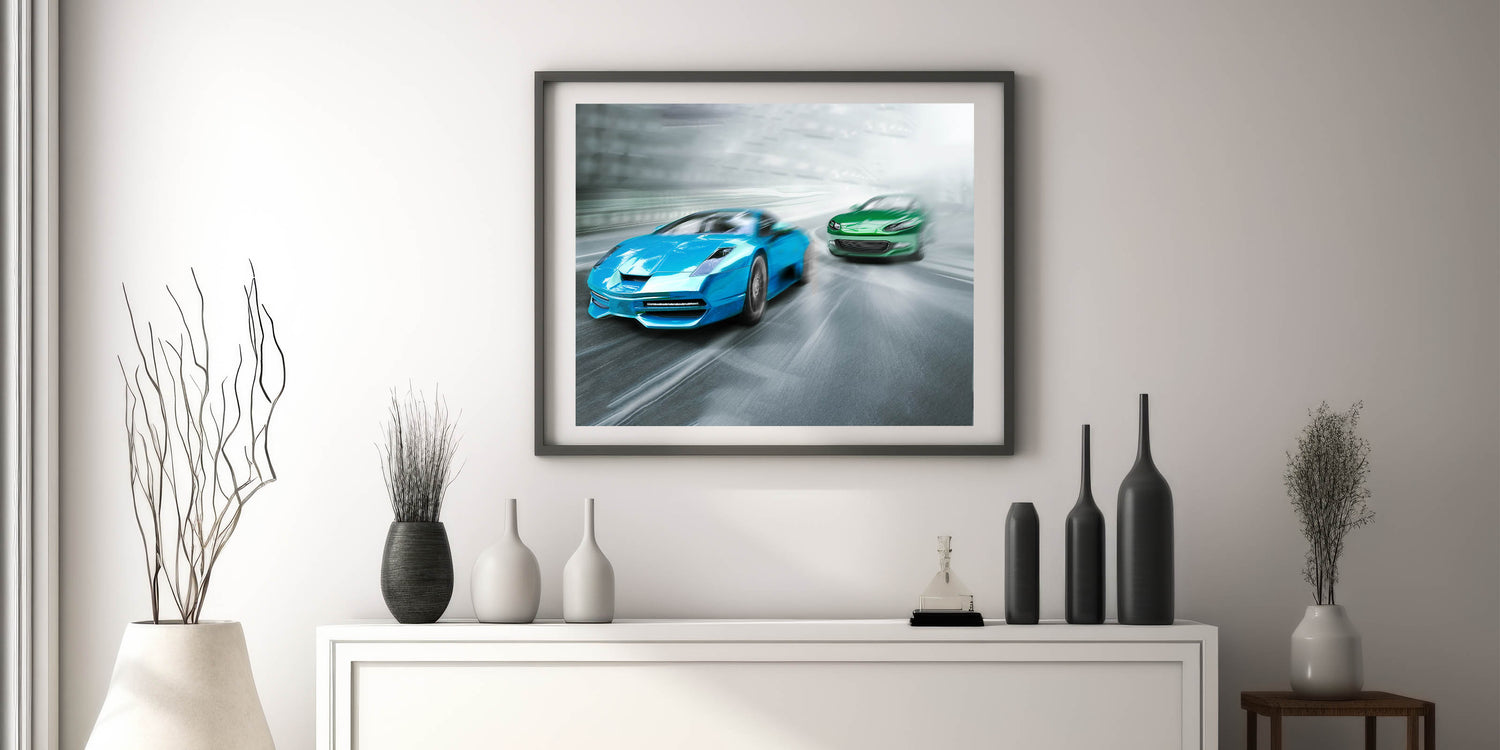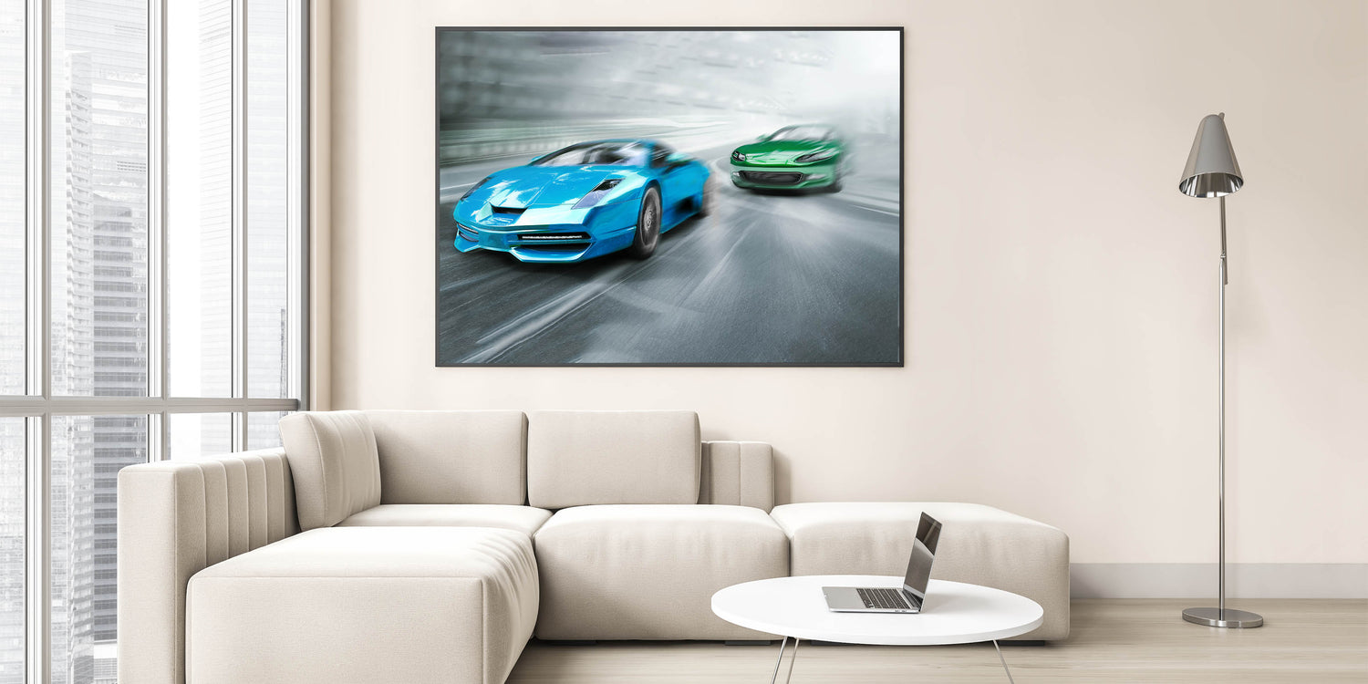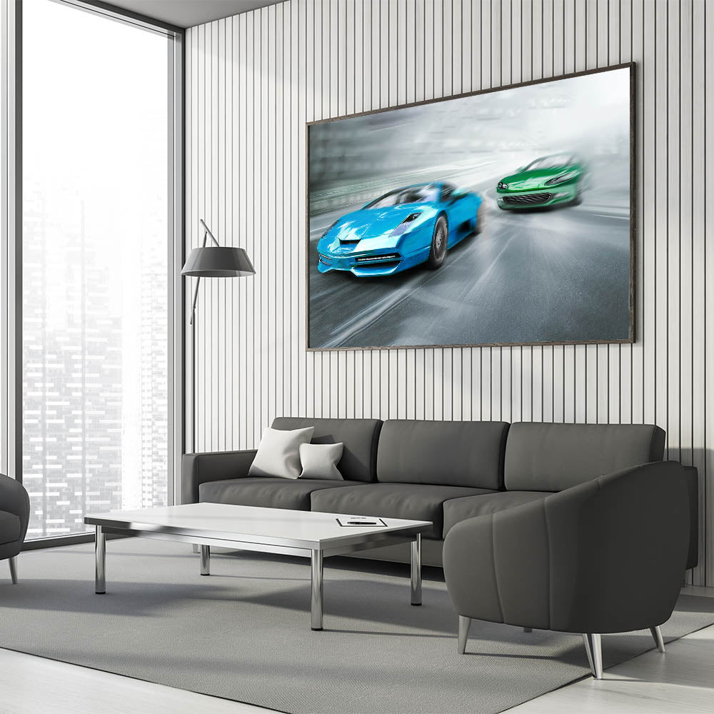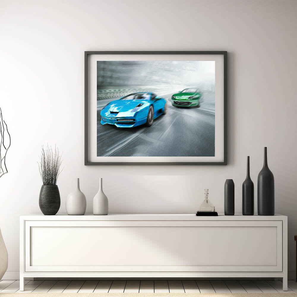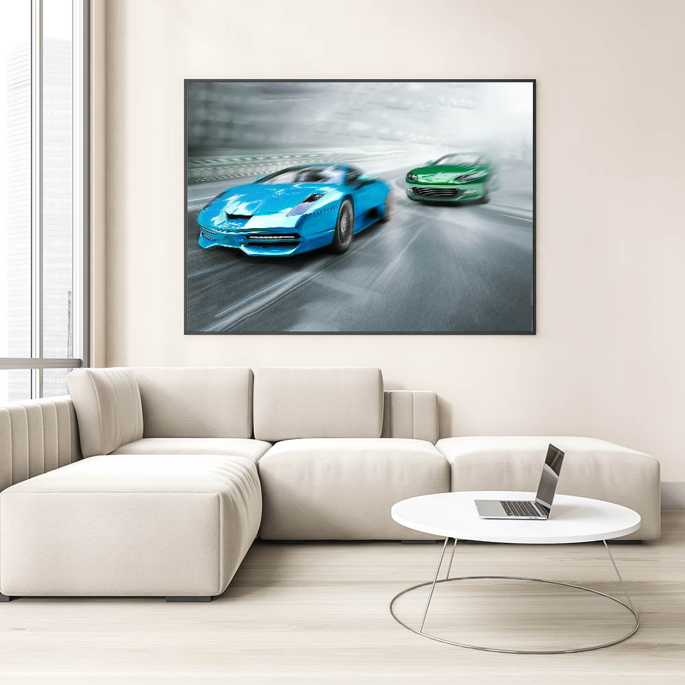 Bring the adrenaline and excitement of the race track into your home with this dynamic race car wall art. Featuring two sleek, high-speed cars in vibrant blue and green, this artwork perfectly captures the thrill of motorsport. The blurred background emphasizes the speed and motion, making it a stunning focal point for any space. Whether you're a car enthusiast or simply looking for modern, eye-catching decor, this racing car canvas print is sure to impress.