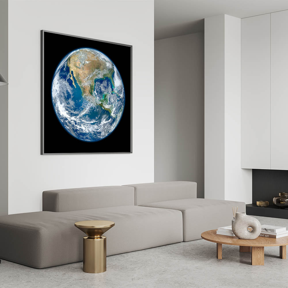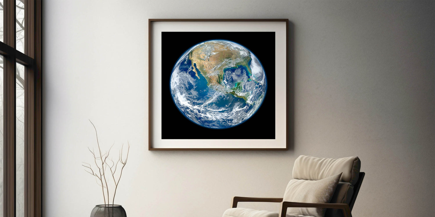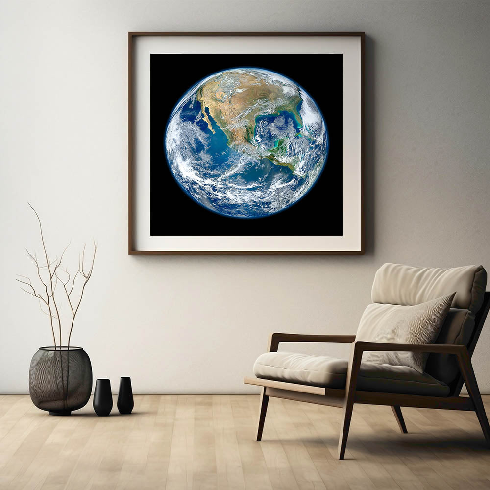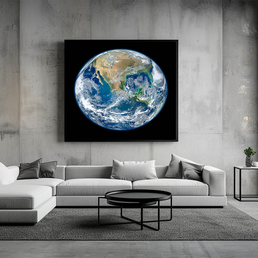 This captivating wall art features an extraordinary view of Earth from the lunar surface, showcasing the beauty of our planet in vivid detail. The high-resolution image captures the vast oceans, intricate cloud patterns, and the rugged terrain of Africa and South America. The moon's shadowy foreground contrasts beautifully against the glowing Earth, making it an ideal decor piece for space enthusiasts, nature lovers, or anyone looking to add a global perspective to their room.