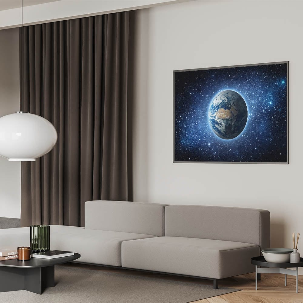 This captivating image of Earth and the stars brings a sense of wonder and inspiration to any room. Let the beauty of our planet and the vastness of space enrich your space with this timeless piece of decor.