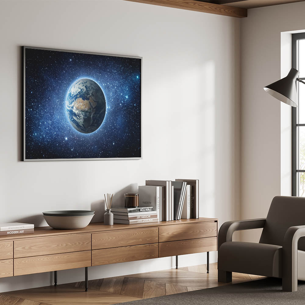 Capture the wonder of the cosmos with this stunning wall art featuring Earth illuminated by a sea of stars. This high-resolution artwork showcases our planet in all its glory, with the vibrant blues, greens, and browns of Earth set against the infinite expanse of space. Perfect for space enthusiasts and nature lovers, this piece offers a mesmerizing view of Earth floating within a field of stars, providing a striking addition to any living space, office, or study.