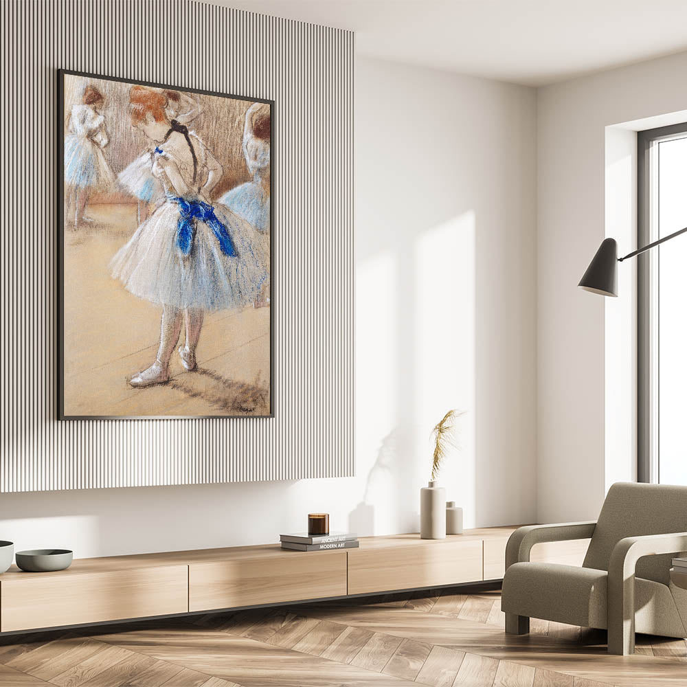 This famous Edgar Degas painting captures a beautifully intimate moment in the life of a ballet dancer, highlighting the poise and grace of the art form. The soft, delicate pastel tones evoke the quiet focus of dancers preparing behind the scenes. As part of our Impressionist art collection, this reproduction showcases Degas' mastery in portraying movement, elegance, and the subtle beauty of everyday ballet life.