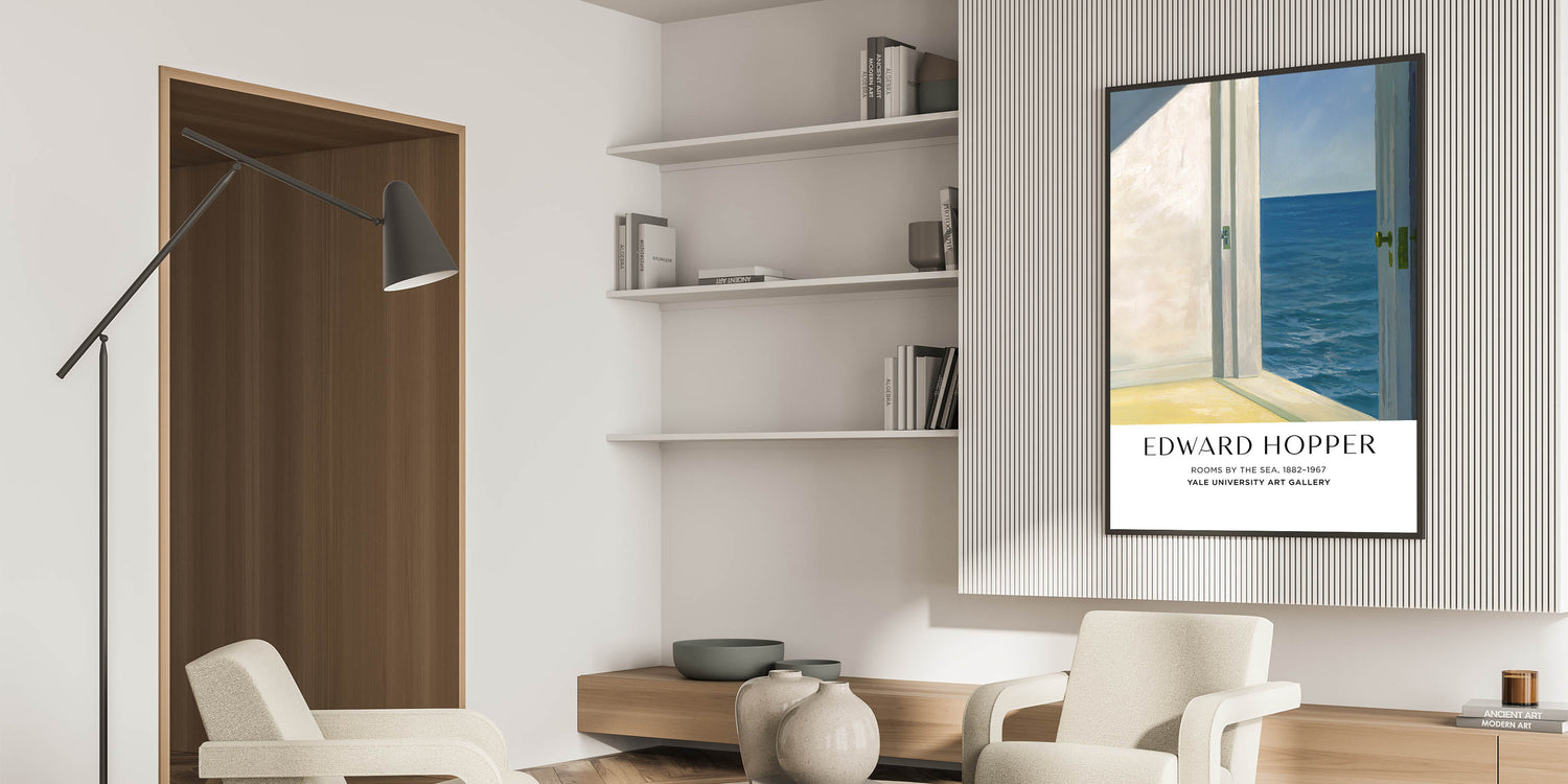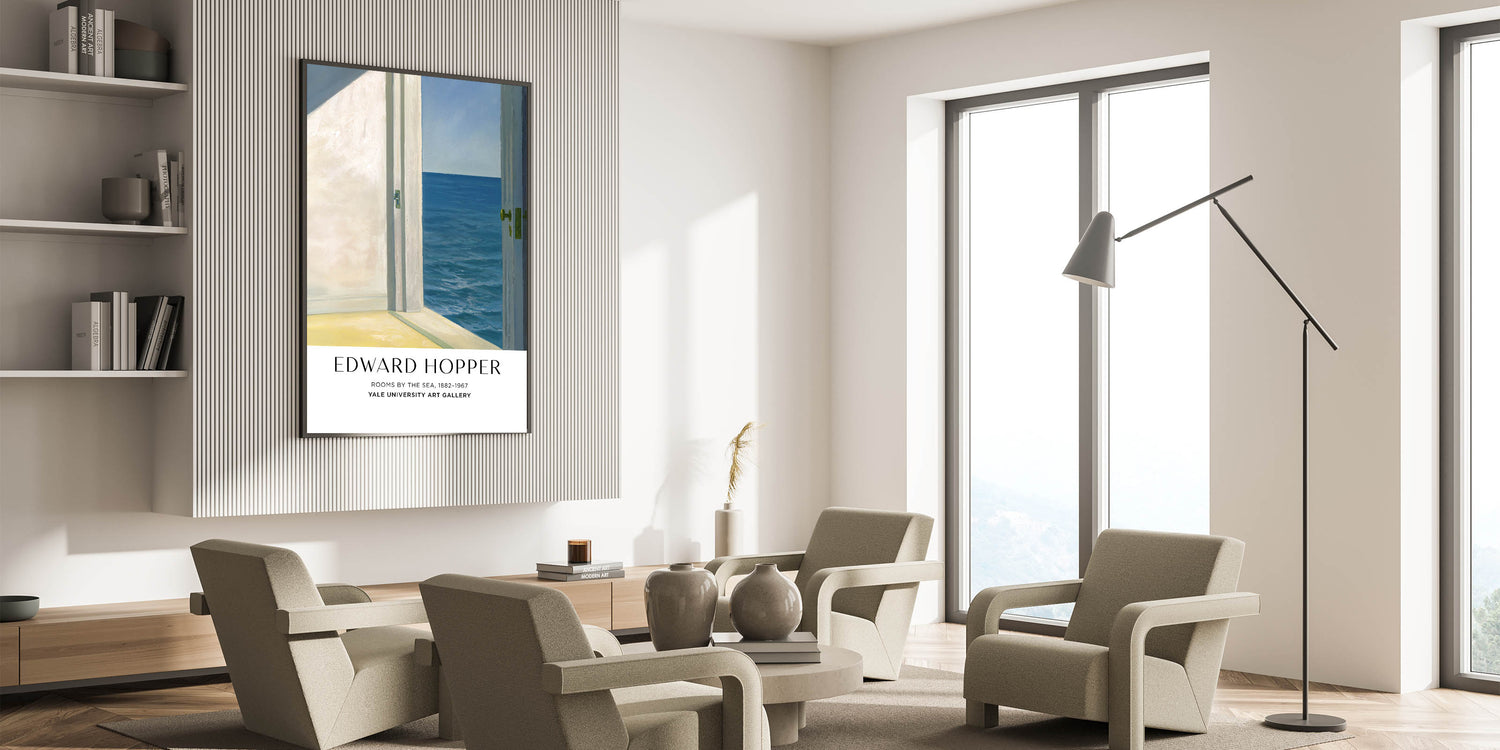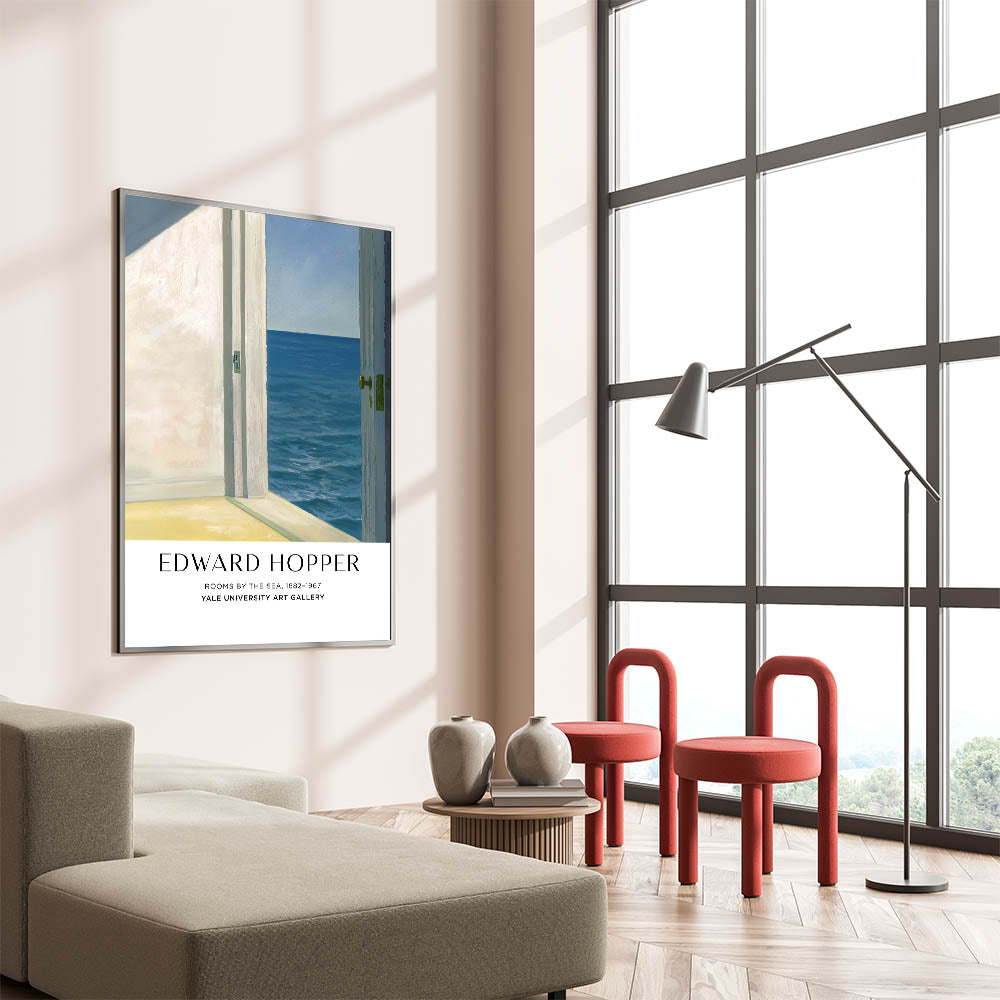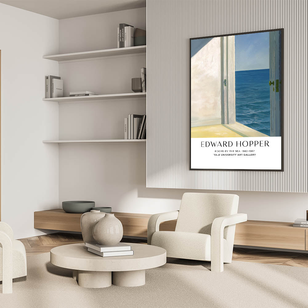 Bring the serene beauty of the sea into your home with Edward Hopper's "Rooms by the Sea, 1882-1967." This iconic painting captures the calm of an open door overlooking the ocean, blending Hopper’s signature style of realism with the peacefulness of nature. The bright sunlight illuminates the minimalist interior, creating a perfect balance between light and shadow.