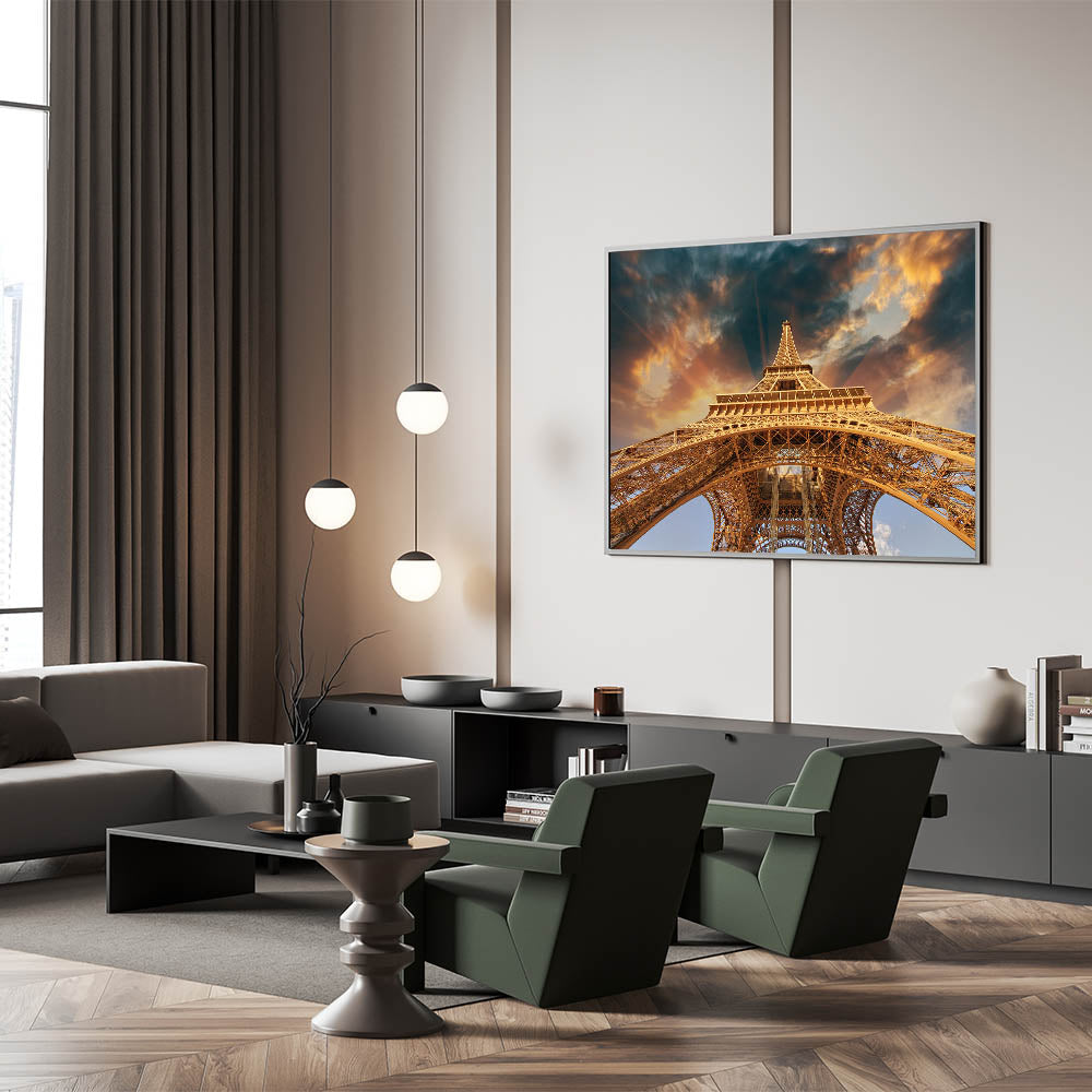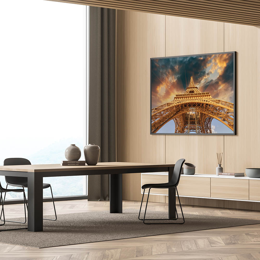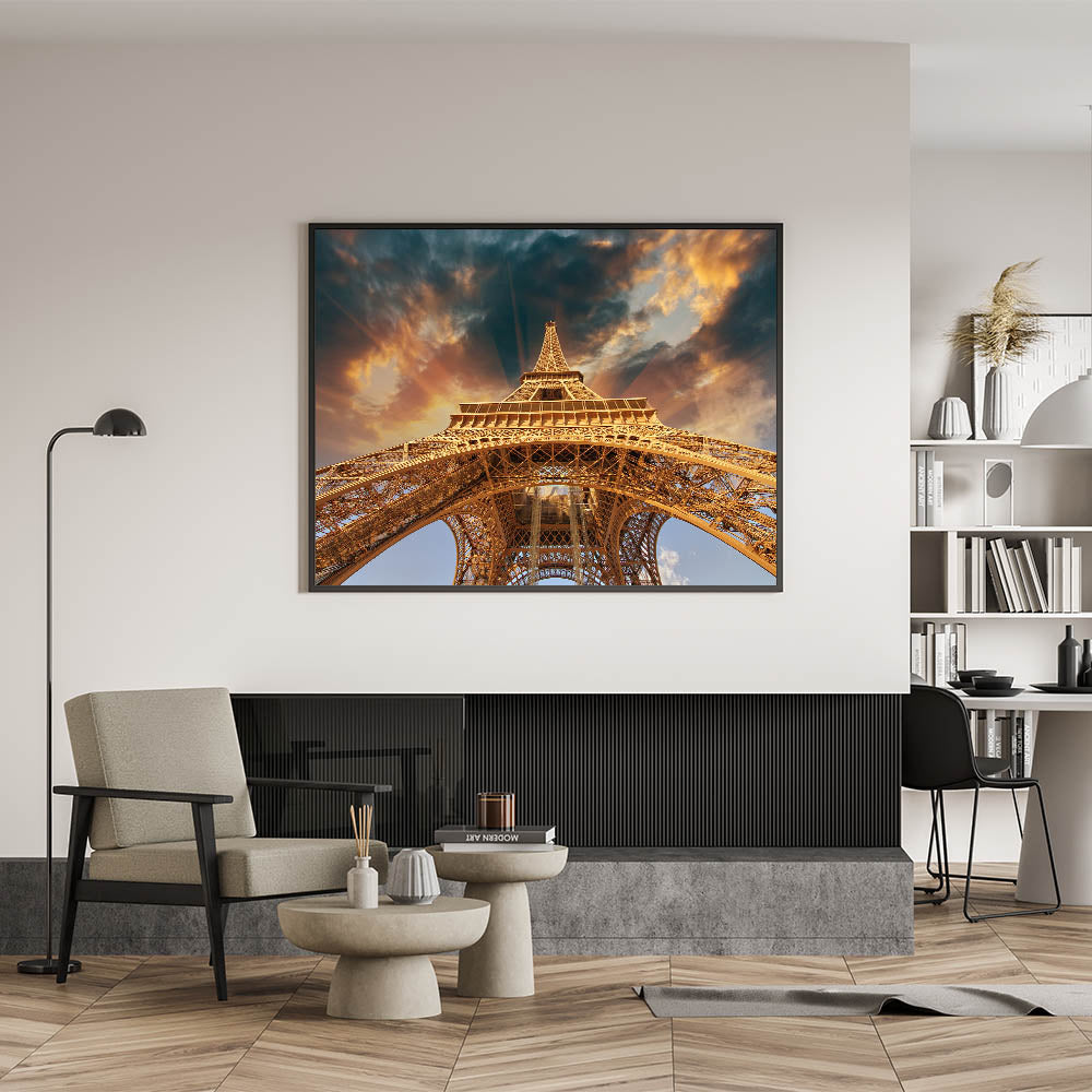 Bring the grandeur of the Eiffel Tower into your home with this stunning Paris wall art. This dramatic upward view of the Eiffel Tower, framed by a breathtaking sky, showcases the architectural marvel in all its glory. The warm golden hues of the structure contrast beautifully with the dramatic clouds, making this Paris cityscape artwork a true statement piece. Whether you're looking for high-quality Paris prints or a bold addition to your collection of romantic Paris art, this canvas delivers both elegance and impact.