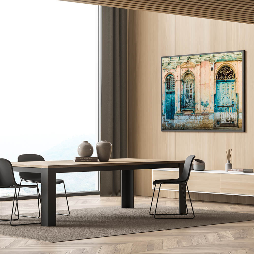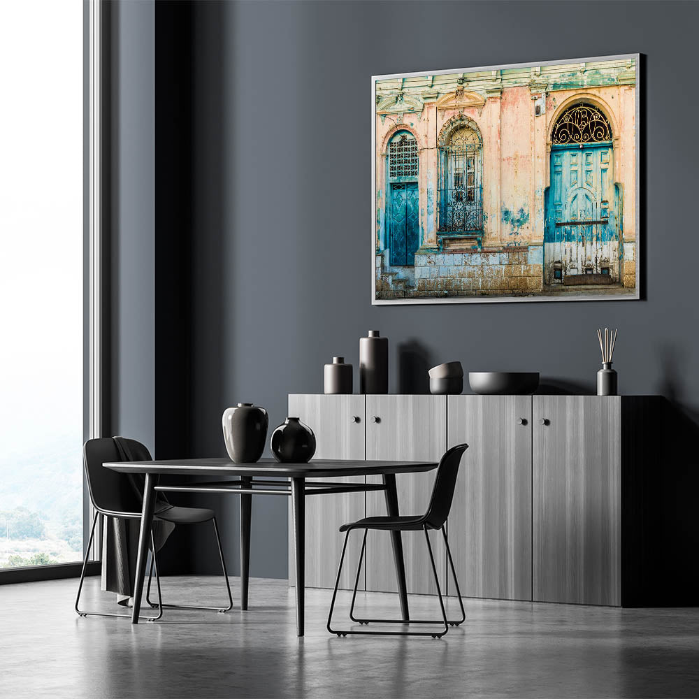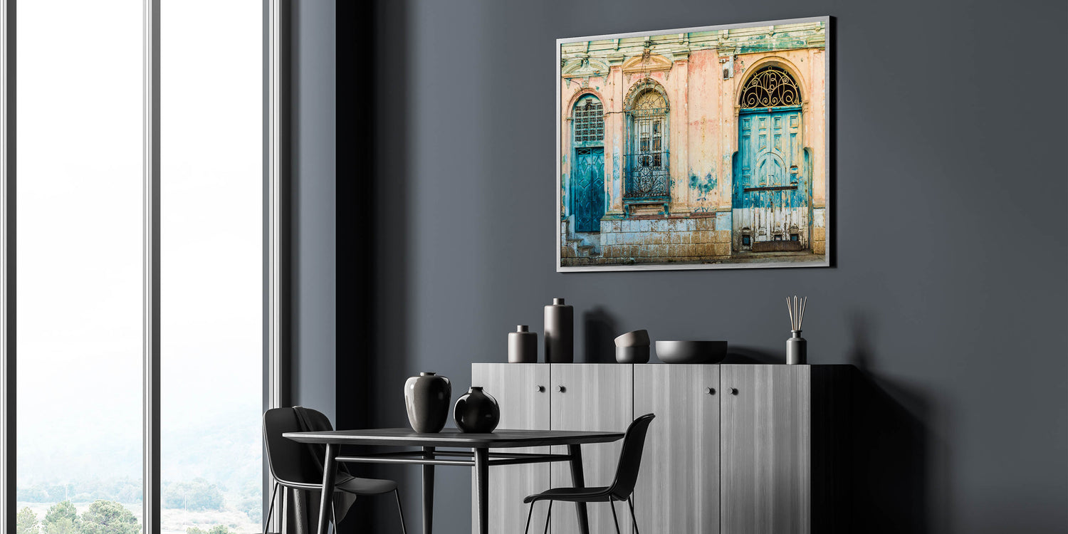 Discover the evocative beauty of El Salvador with our "El Salvador Landscape Prints - Mayan Ruins Art". This artwork captures a striking scene of weathered colonial doors in faded blue and teal, framed by distressed pink walls, evoking the timeless spirit of El Salvador's rich history.