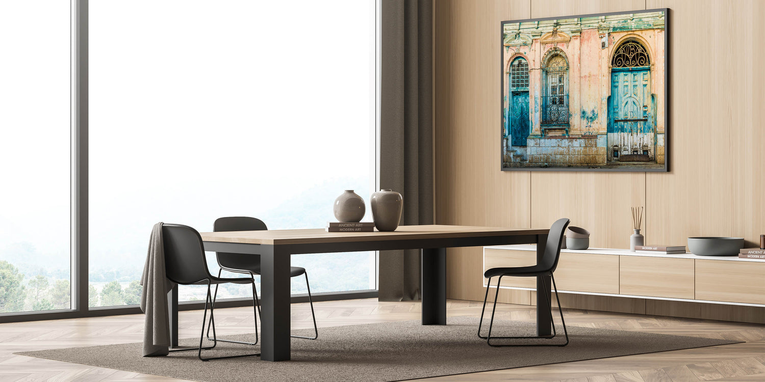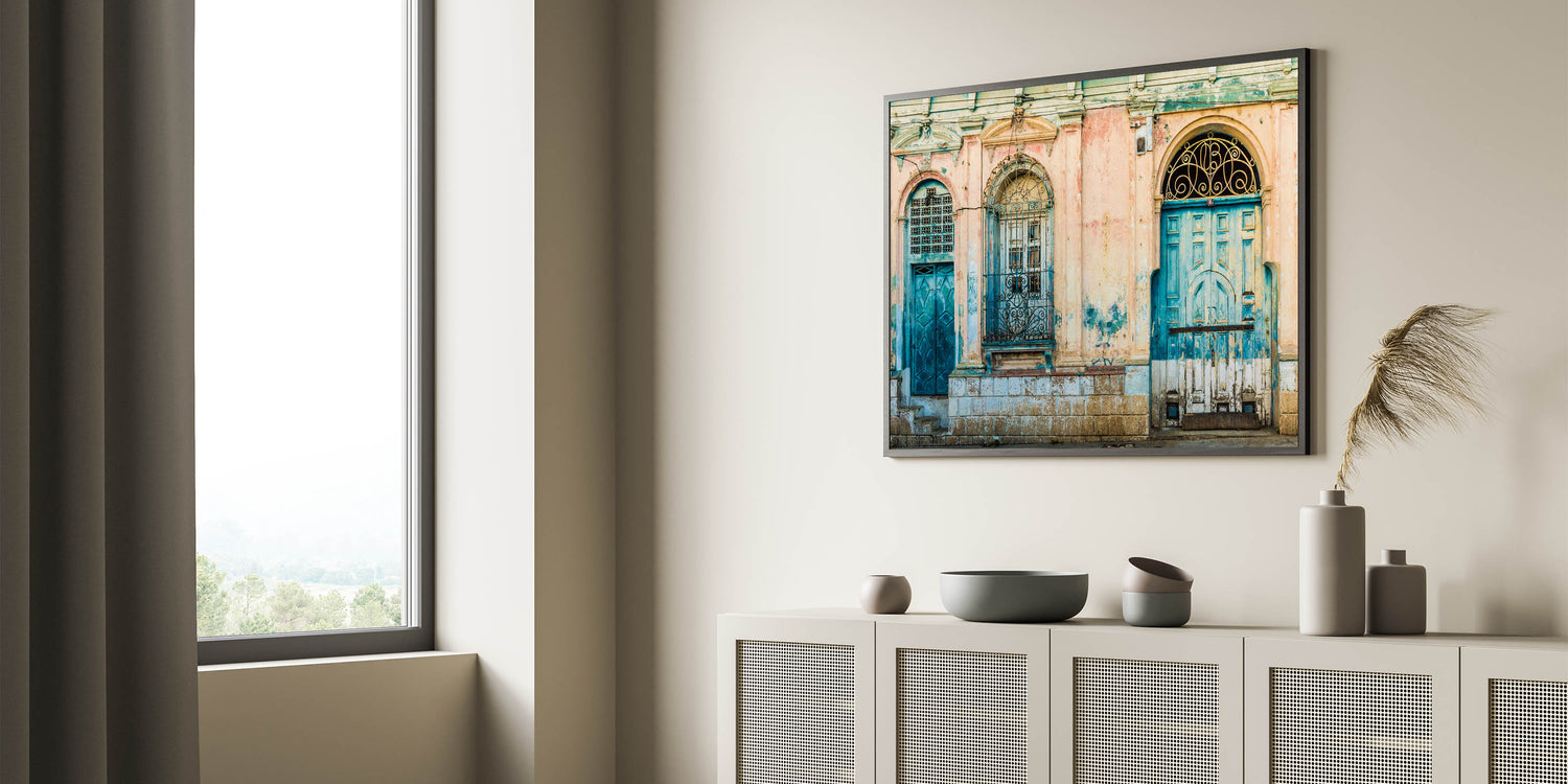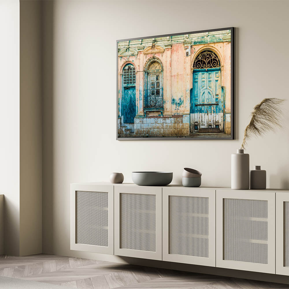 Discover the evocative beauty of El Salvador with our "El Salvador Landscape Prints - Mayan Ruins Art". This artwork captures a striking scene of weathered colonial doors in faded blue and teal, framed by distressed pink walls, evoking the timeless spirit of El Salvador's rich history.