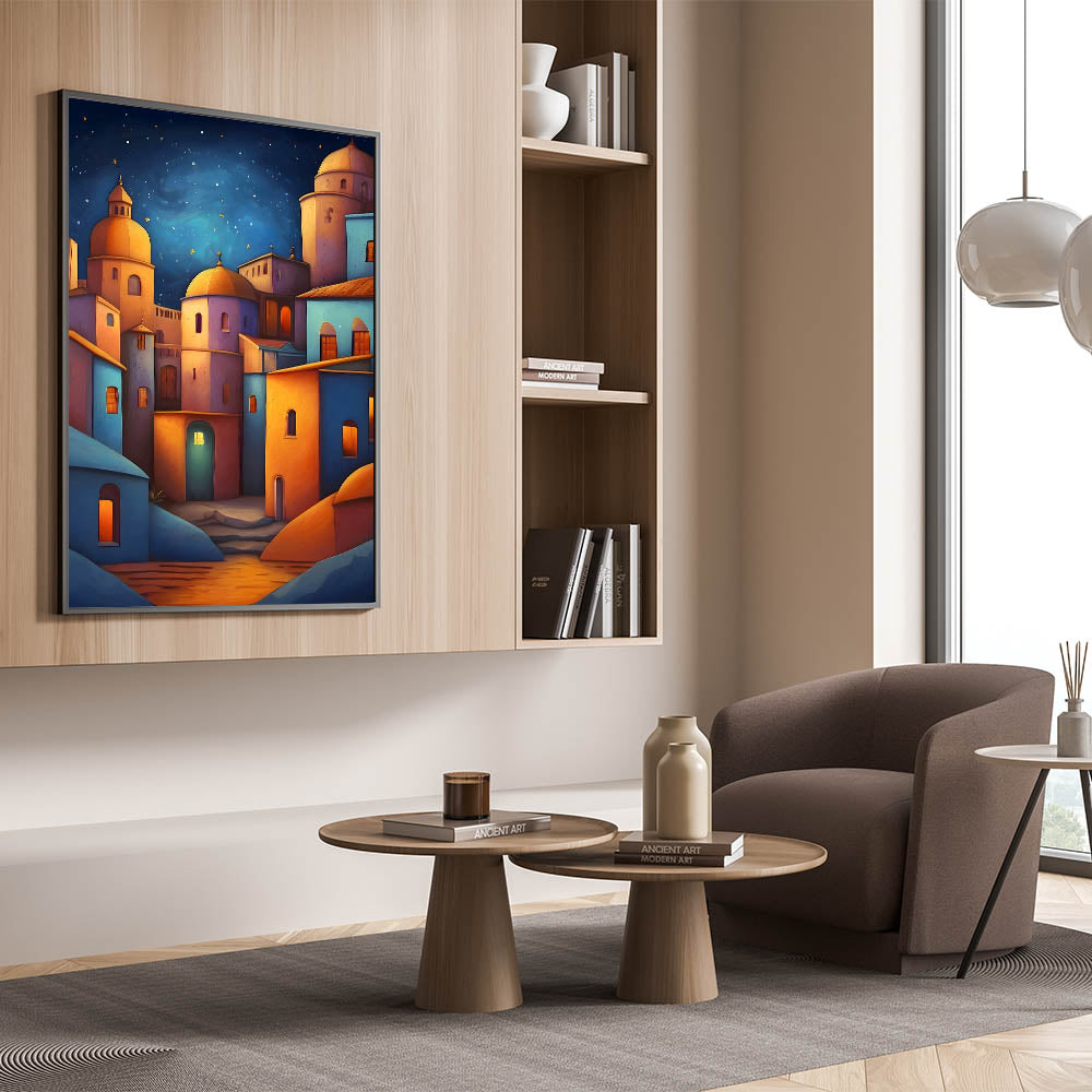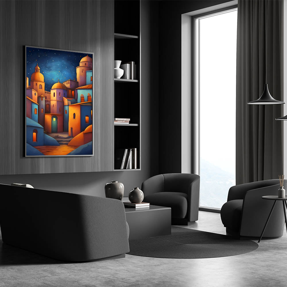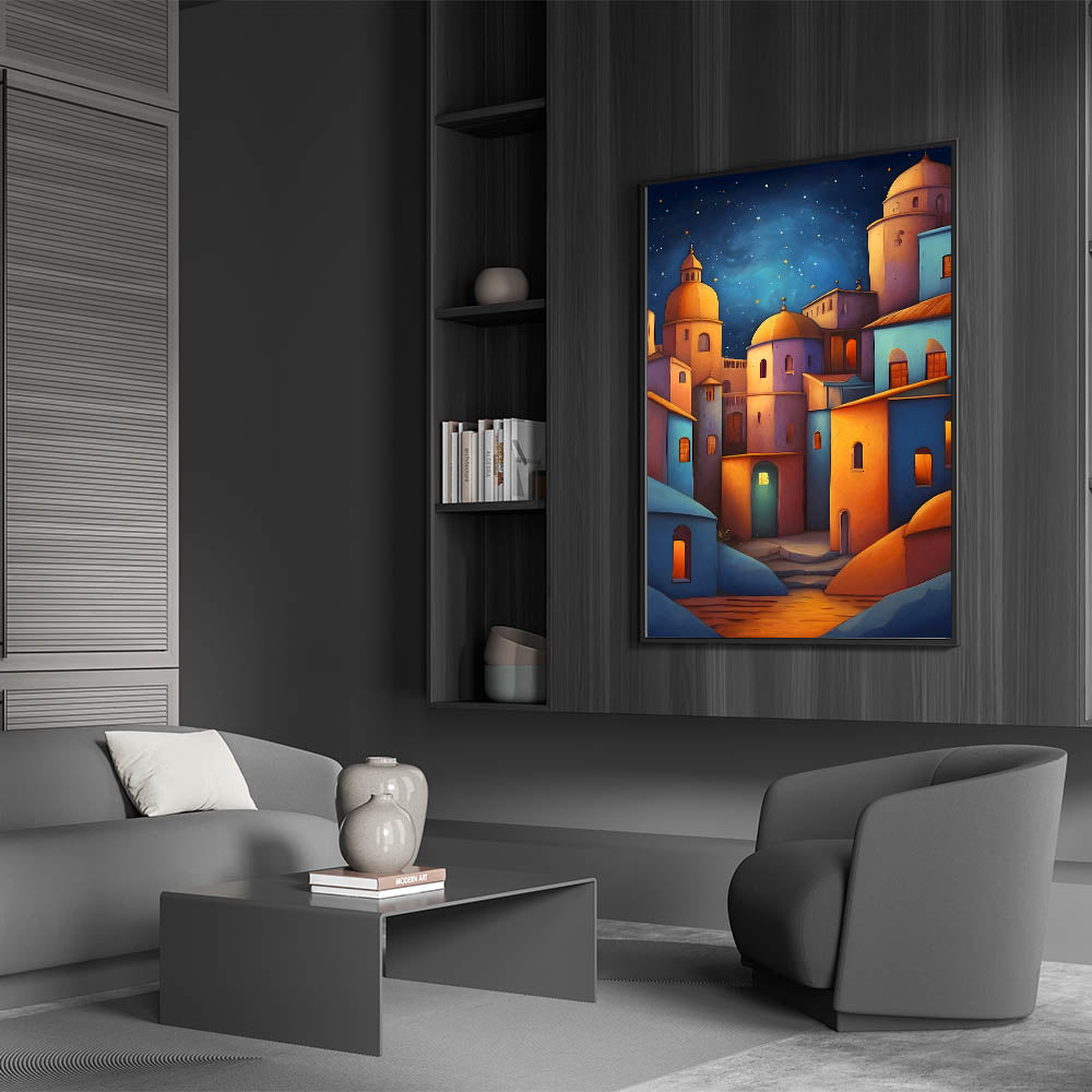 Experience the enchanting charm of a Salvadoran town under a starlit sky with our "Starlit Salvadoran Town Art." This piece beautifully renders the magical atmosphere of a quaint town, with its colorful buildings bathed in the soft glow of starlight, creating a serene and inviting scene.