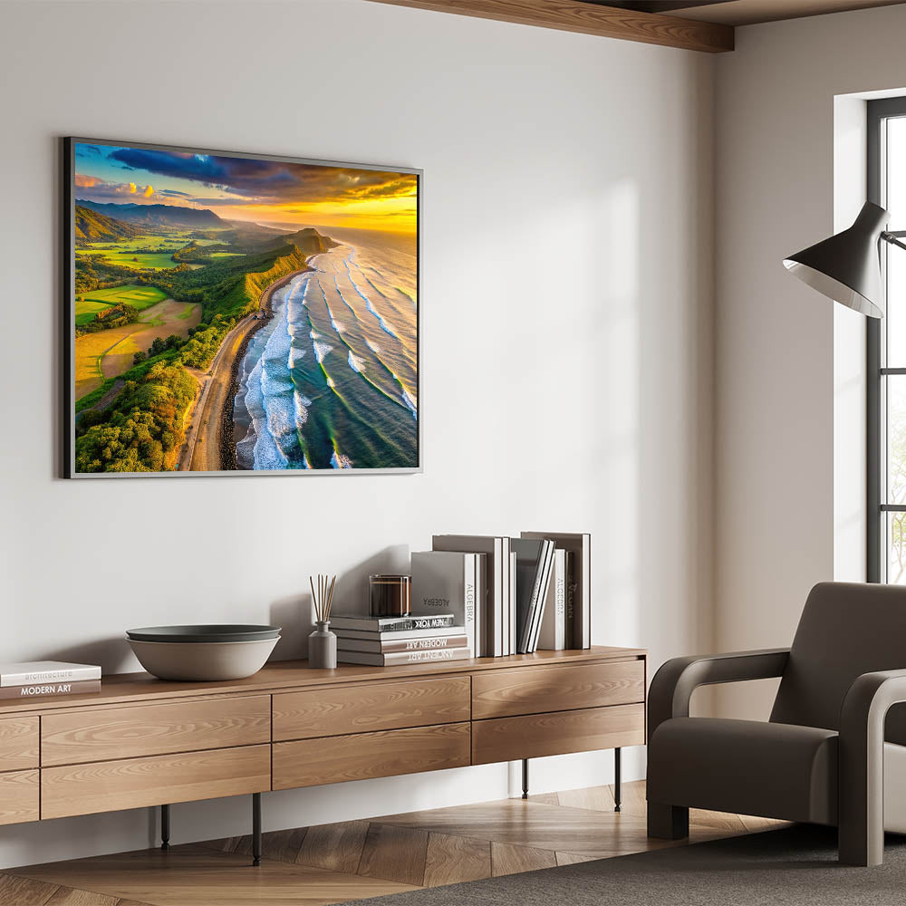 Captivate the essence of El Salvador's breathtaking coastline with our "Coastal Sunrise Canvas." This piece features a panoramic view of lush green fields transitioning into a vibrant, sun-kissed shoreline, illuminated by the early morning sun. The powerful imagery brings the serene beauty of El Salvador's natural landscapes right into your living space.