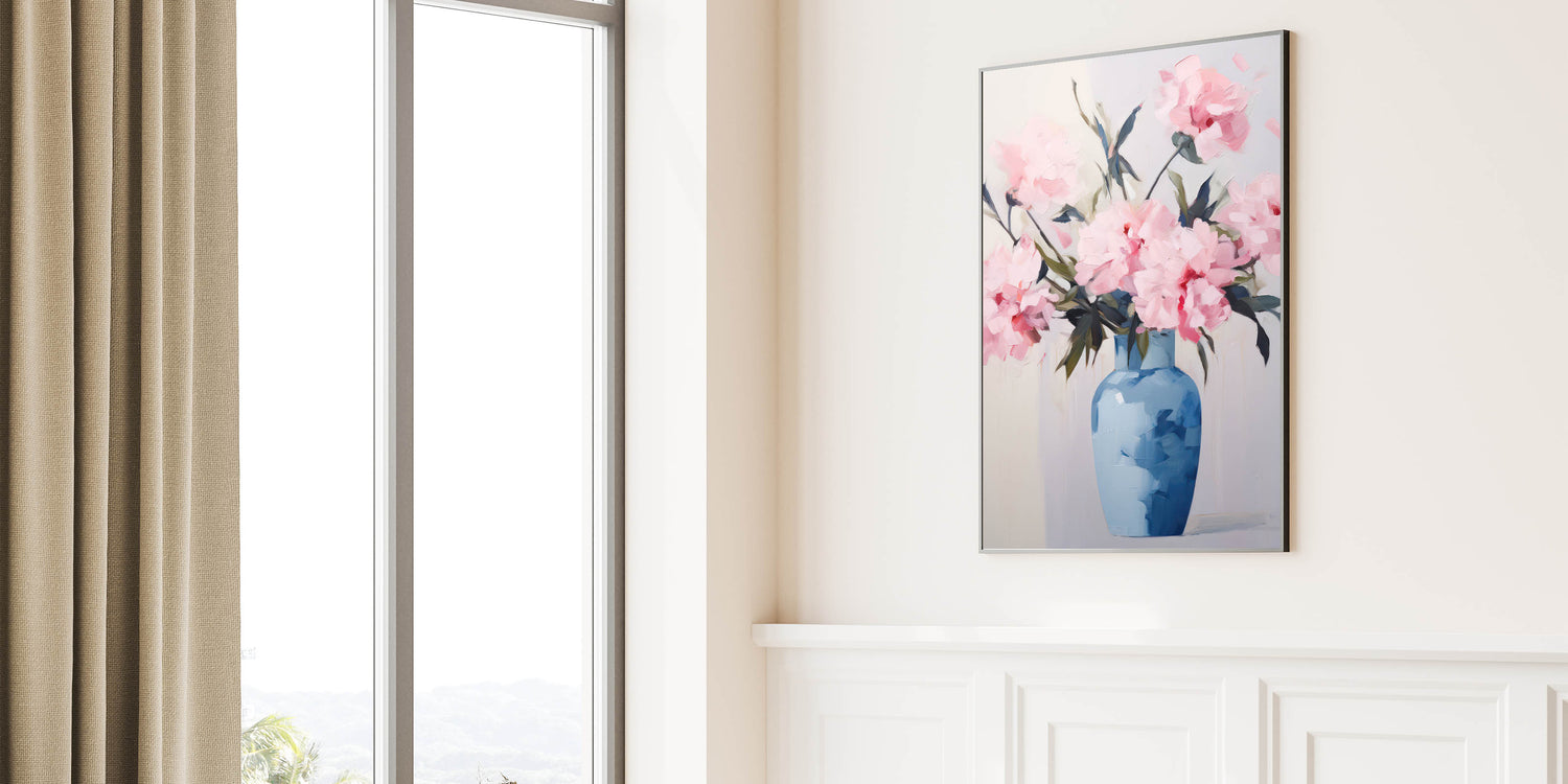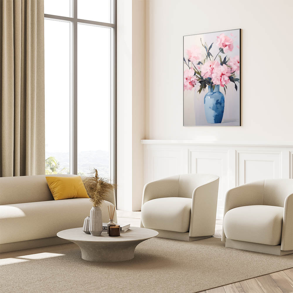 - Features soft pink florals and a bold blue vase for a stunning contrast