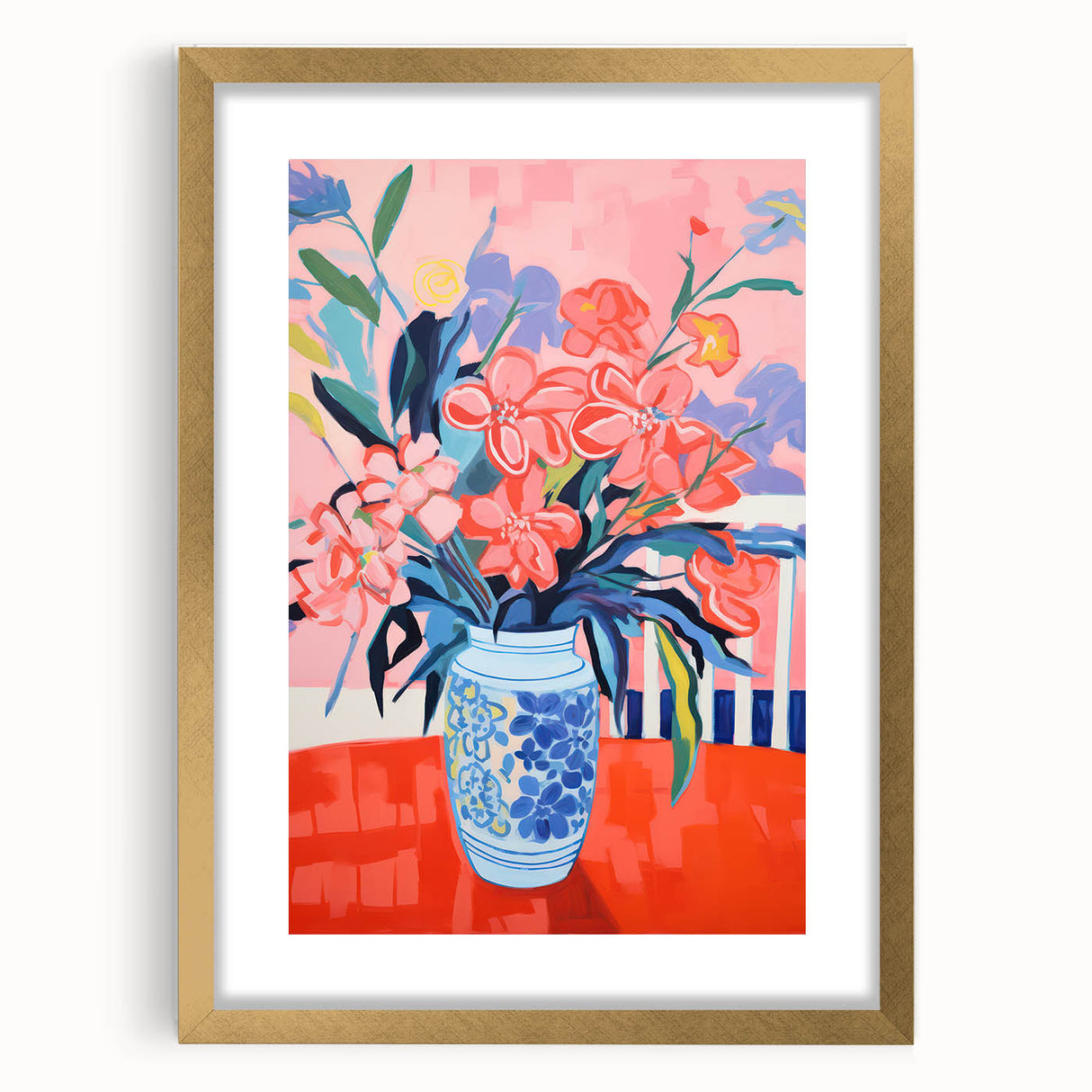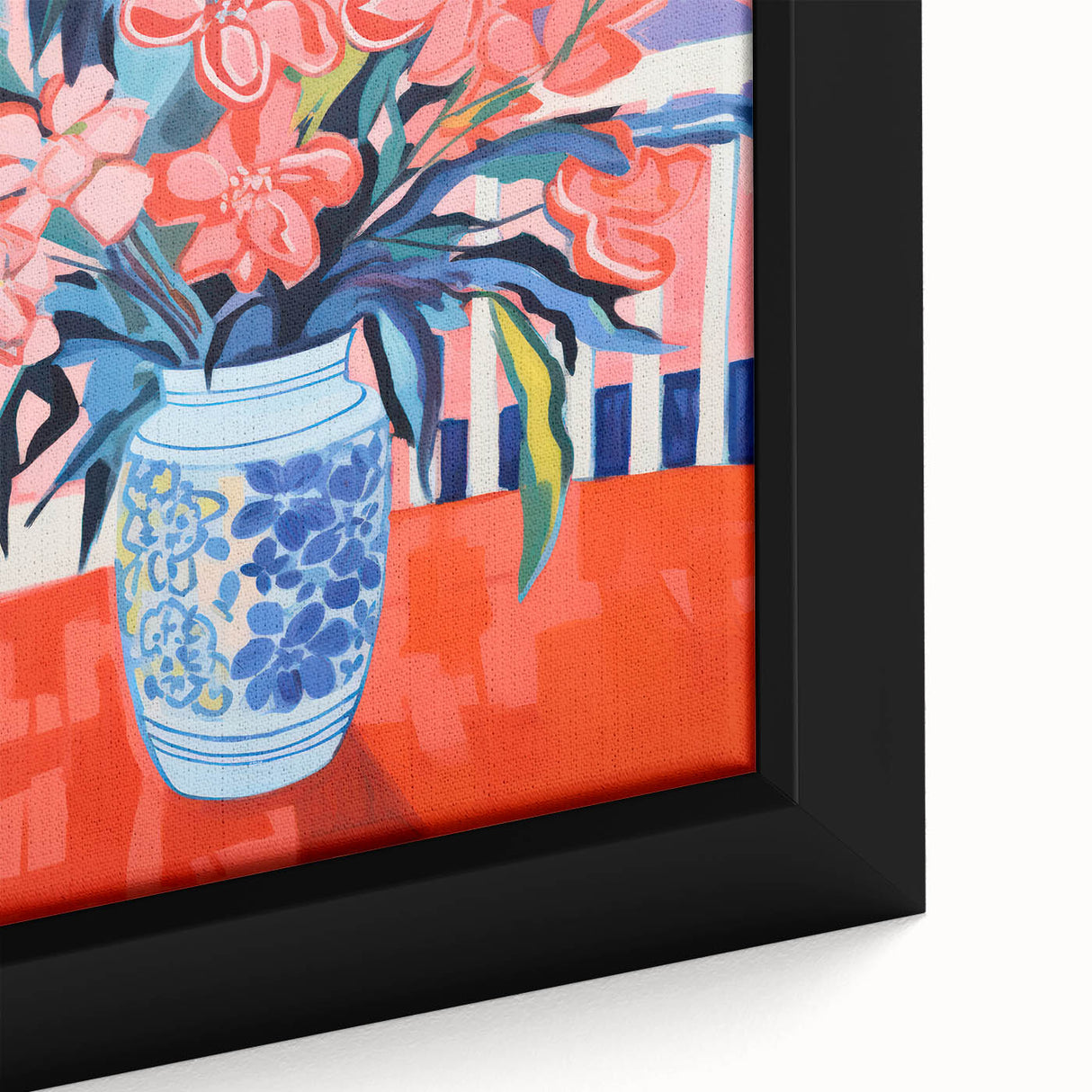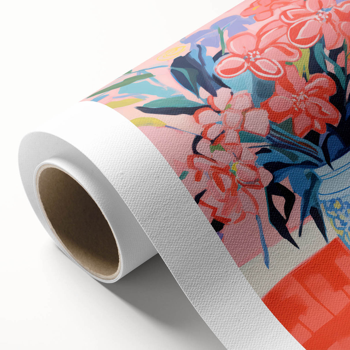 Infuse your space with energy and color through this electric wall art featuring a vibrant floral arrangement. The bold pink and red flowers stand out against the soft blush background, while the blue and teal leaves add a dynamic contrast. The classic blue floral vase provides a touch of tradition, blending beautifully with the modern composition. This electric art canvas is a perfect choice for anyone seeking to enhance their space with an eye-catching and lively piece of decor.