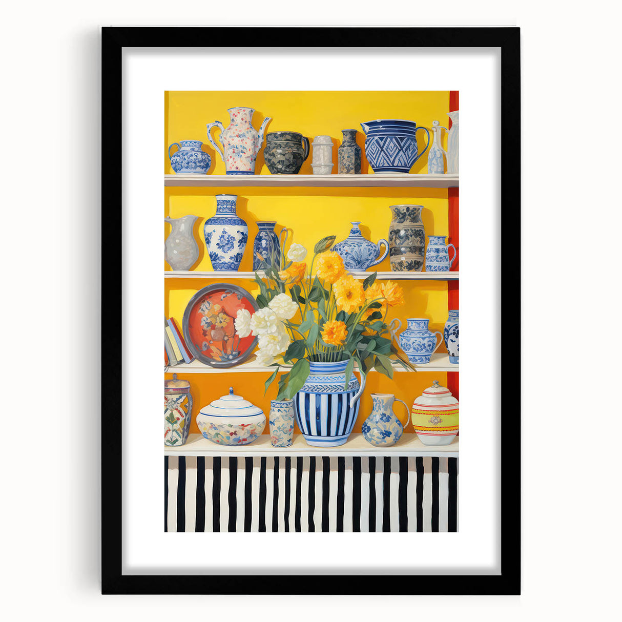 - Features vibrant floral arrangements in detailed vases, set against a rich yellow backdrop
