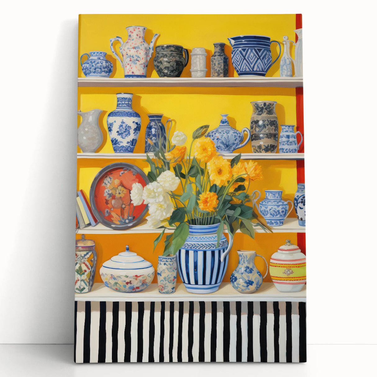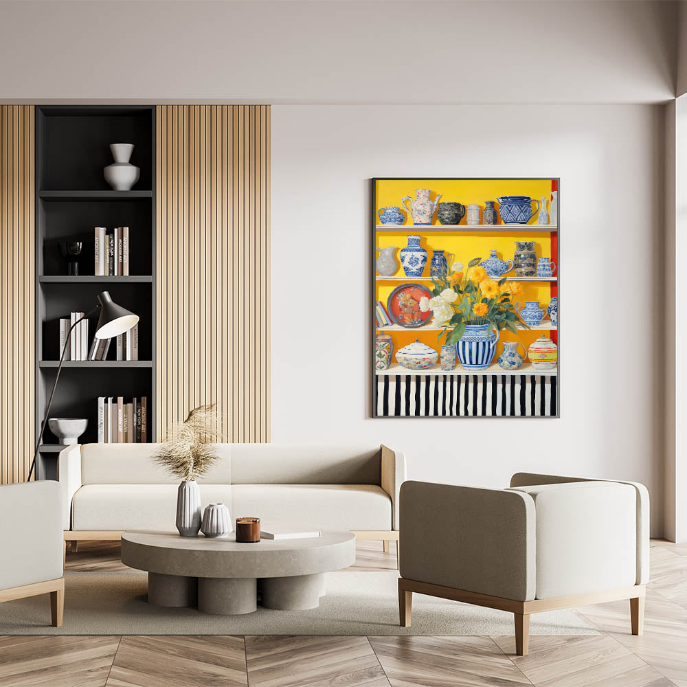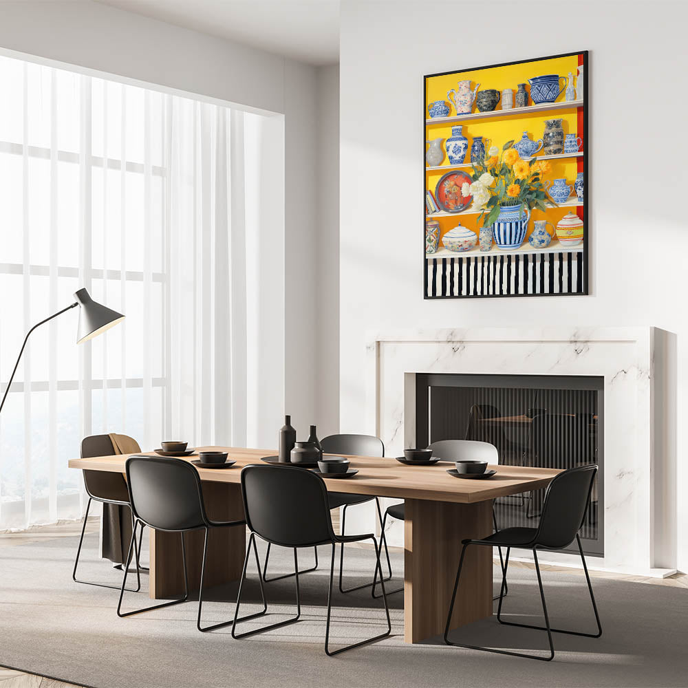 Enhance your space with this striking electric wall art featuring a lively still life composition of ornate vases and vibrant flowers. The vibrant electric painting showcases intricate blue-and-white vases contrasted with bold yellow and red hues, creating a stunning visual effect. This artwork adds a bright and elegant touch to kitchens, dining areas, or living rooms, perfectly blending modern aesthetics with timeless beauty.