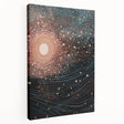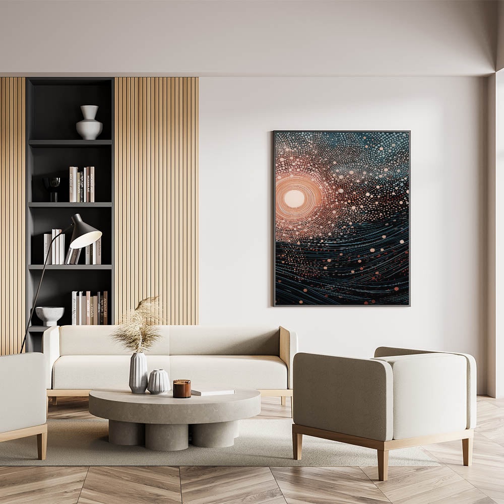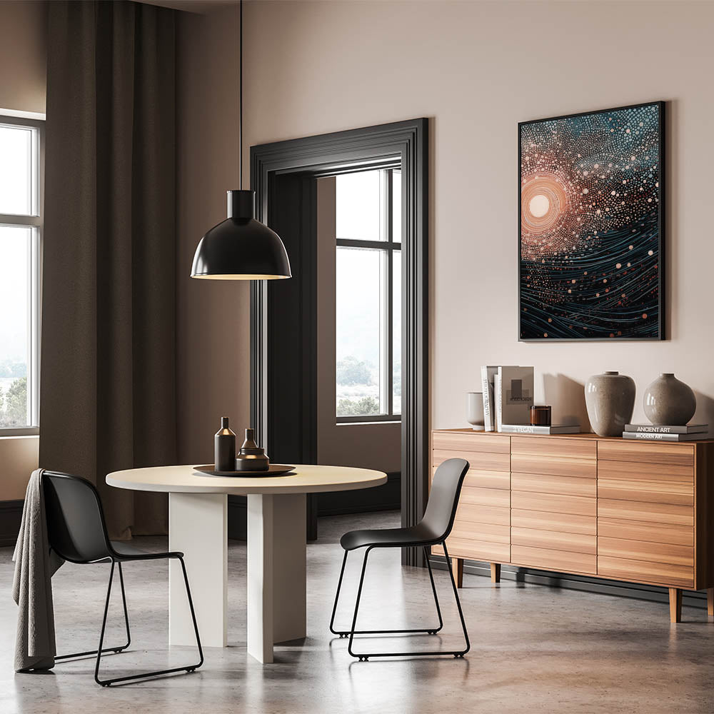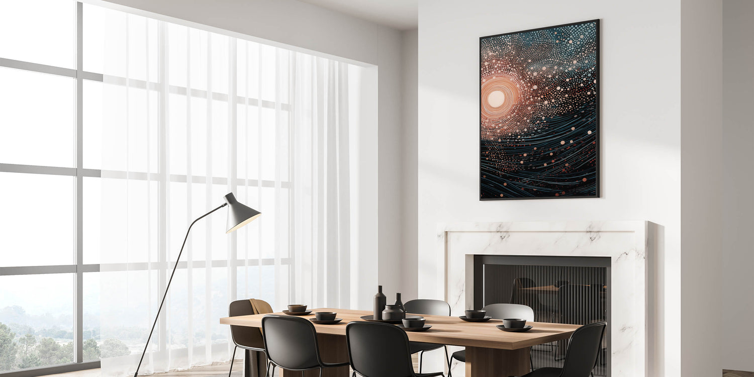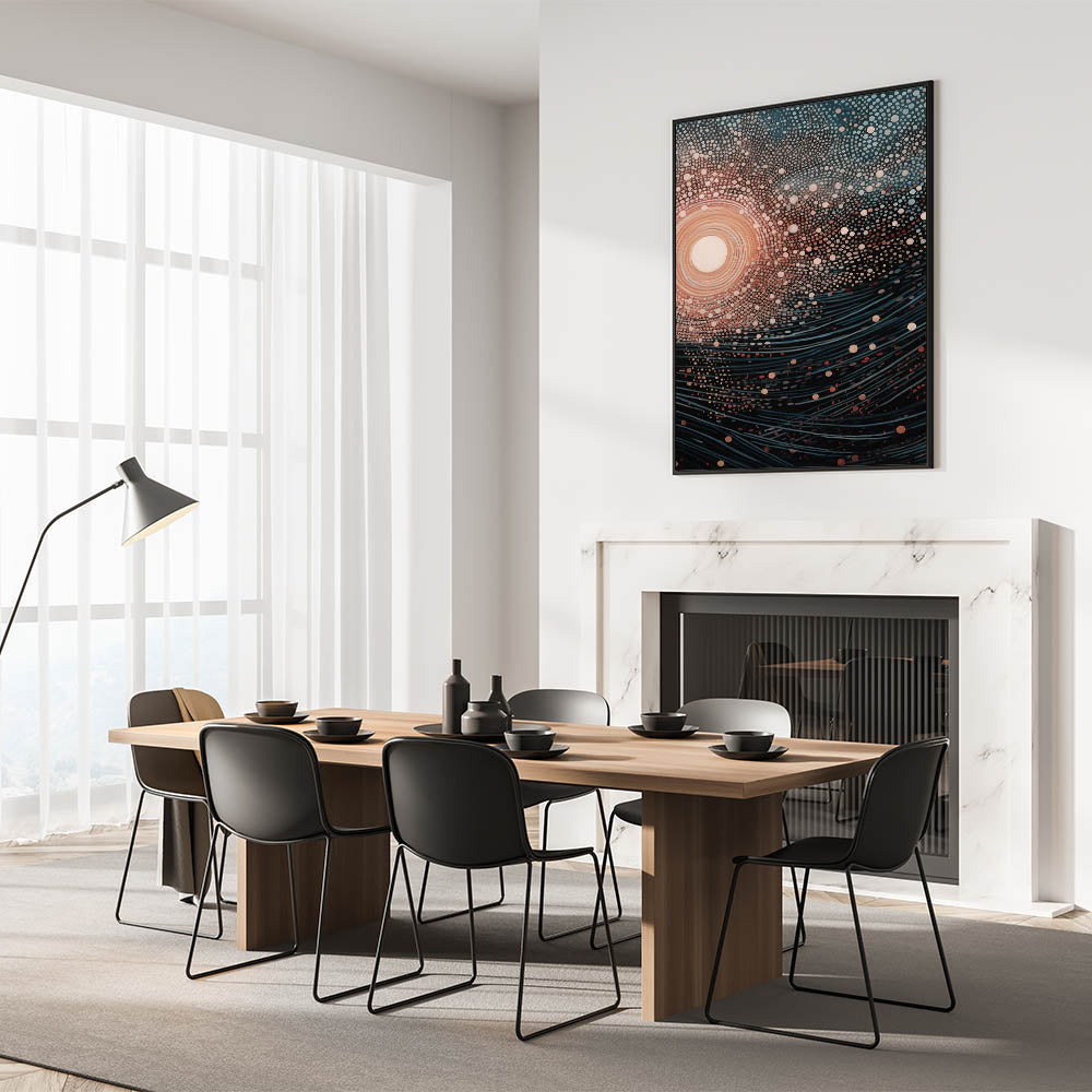 Add a touch of mystery and wonder to your decor with this stunning electric wall art, featuring an abstract depiction of cosmic light and flowing waves. The intricate arrangement of dots and lines creates a mesmerizing pattern that evokes the beauty of the universe, with swirling waves pulling you into the design. The contrast between the warm central light and the cool blues and blacks gives this vibrant art print a balanced, hypnotic quality.