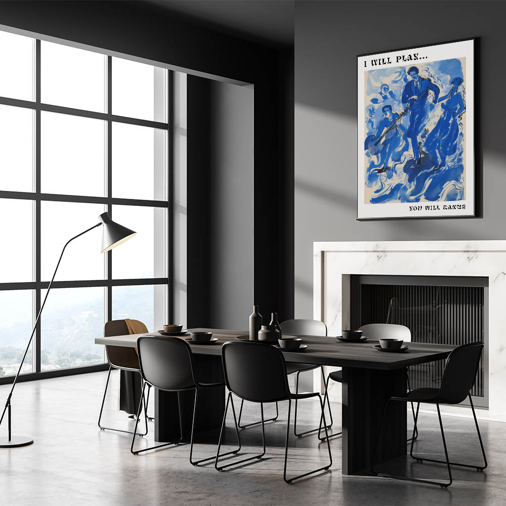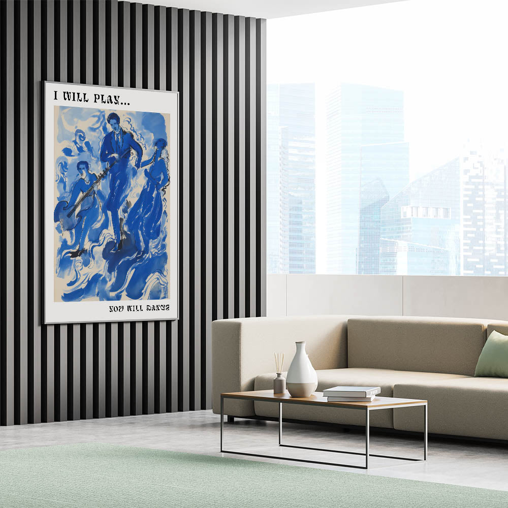 Celebrate the rhythm and movement of music with this electric wall art, featuring a trio of jazz musicians rendered in bold shades of blue. The fluid brushstrokes and vibrant color give this piece a sense of energy and spontaneity, making it a perfect addition to any music lover’s space. The words “I Will Play… You Will Dance” add a playful, interactive element, inviting viewers to experience the spirit of live music right on their walls. This electric art canvas captures both the emotion and movement of jazz, bringing a bold, artistic flair to modern spaces.
