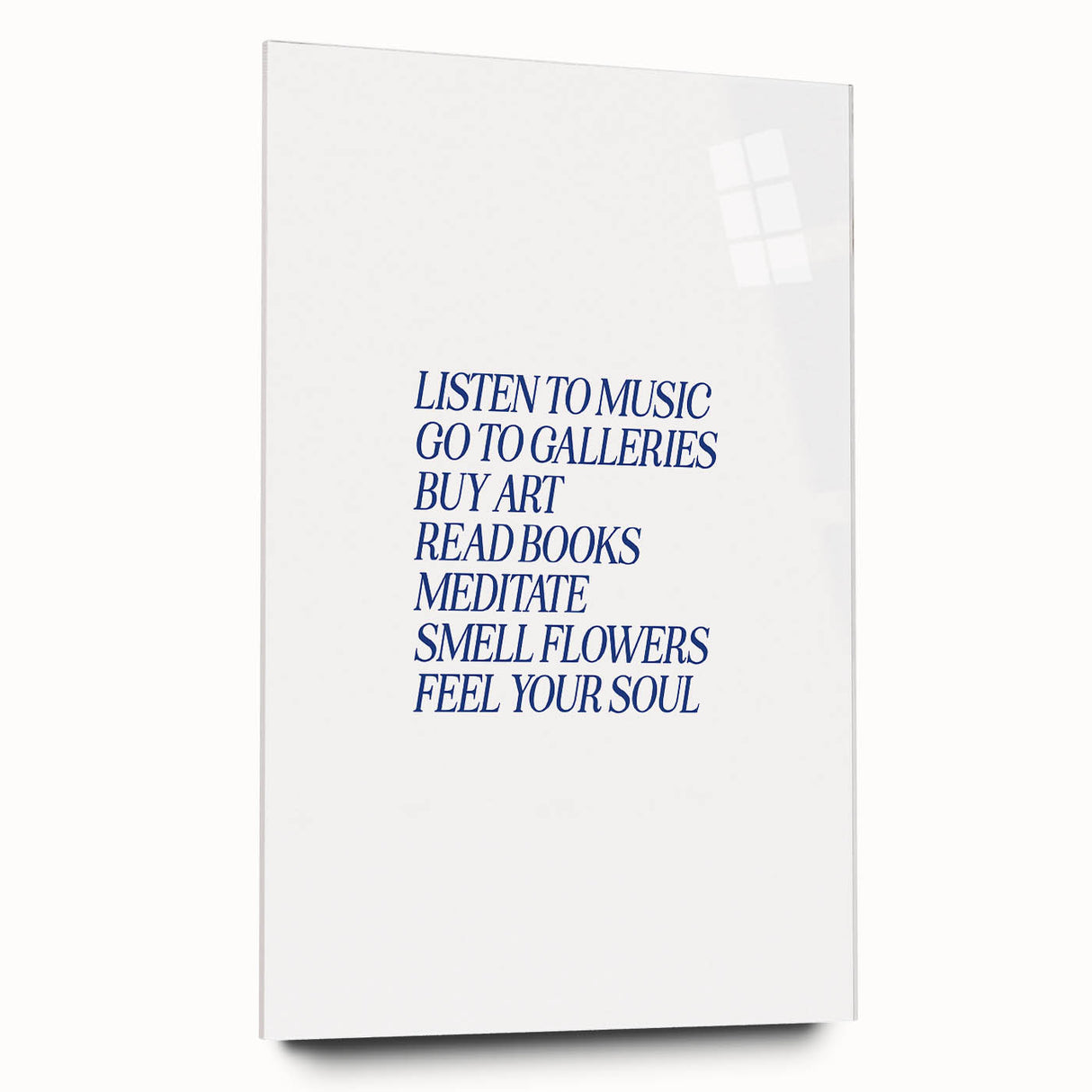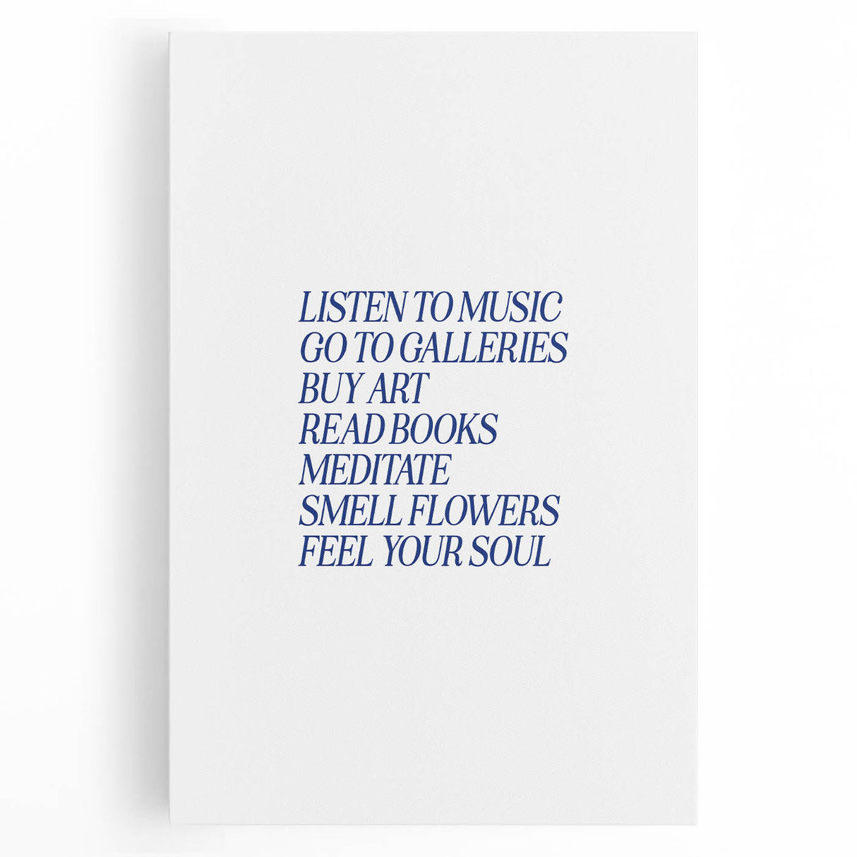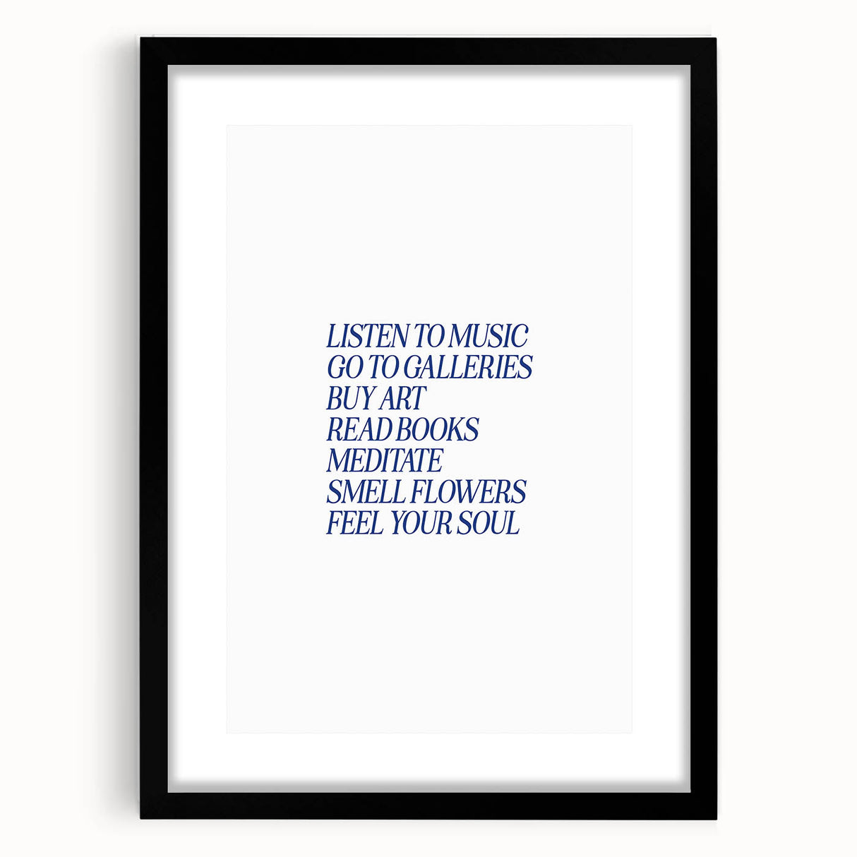 Inspire mindfulness and creativity with this electric wall art featuring the motivational text: "LISTEN TO MUSIC, GO TO GALLERIES, BUY ART..." and more. The clean, minimalist typography in calming navy blue adds a touch of elegance and serenity to any room. Perfect for those who value a life filled with art, music, and meaningful moments, this vibrant art print offers both style and inspiration for any modern space.