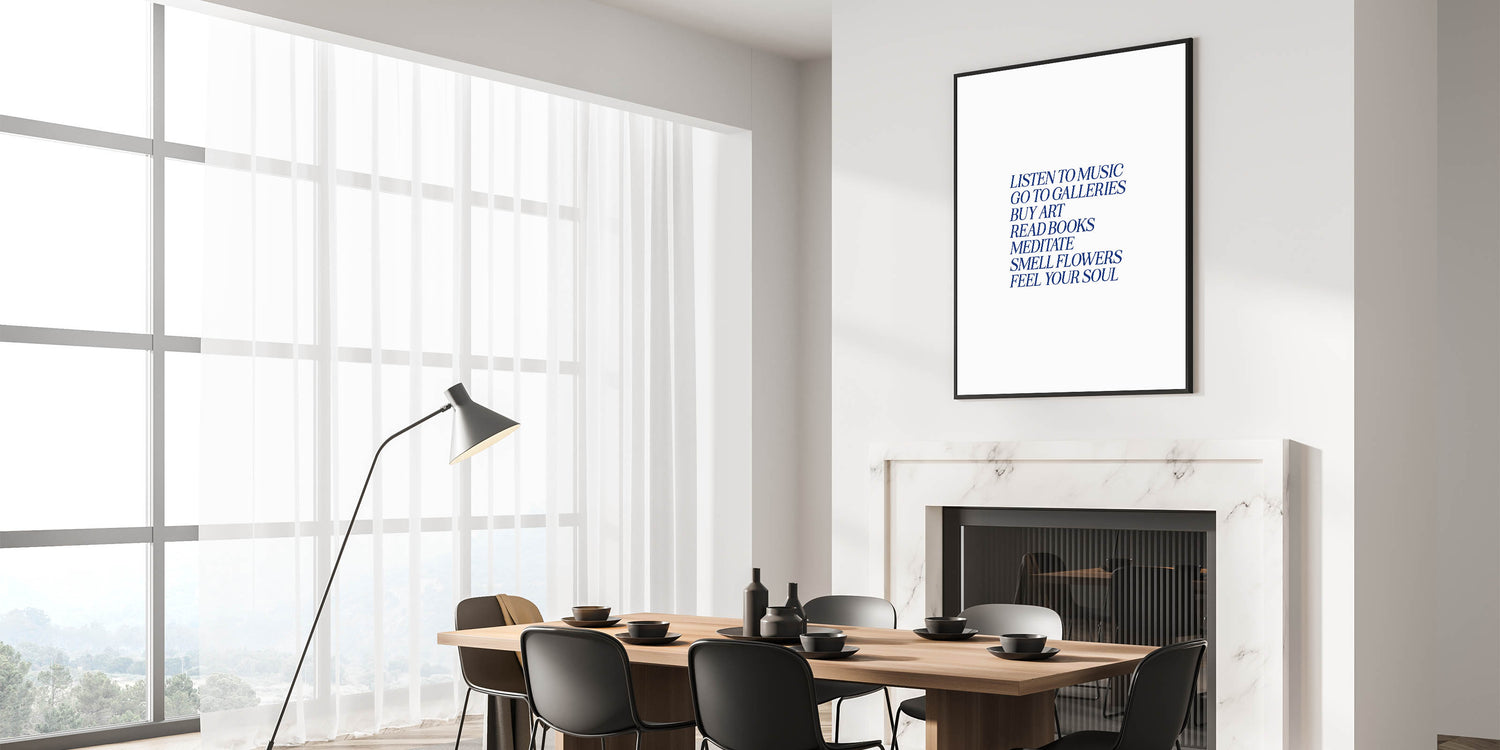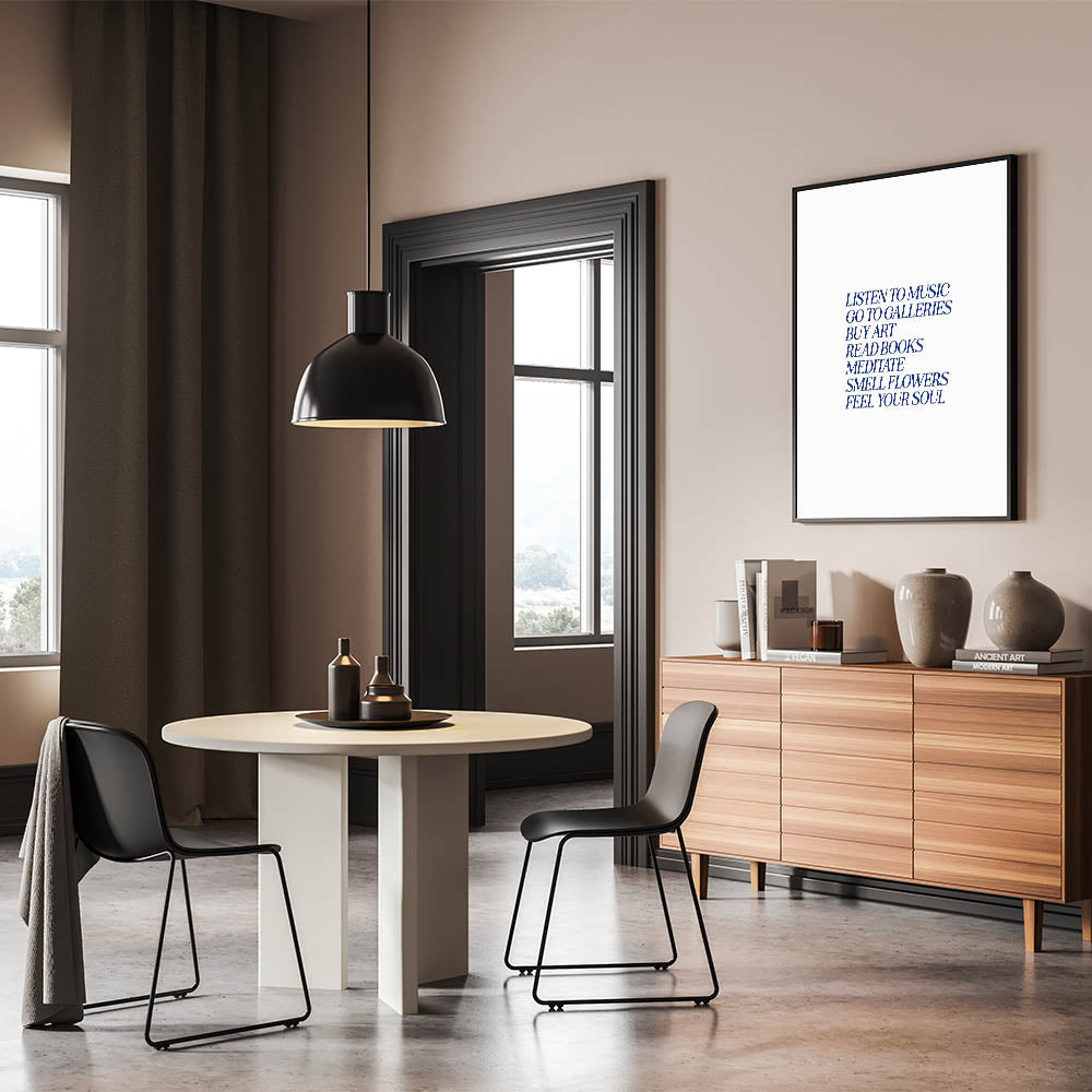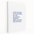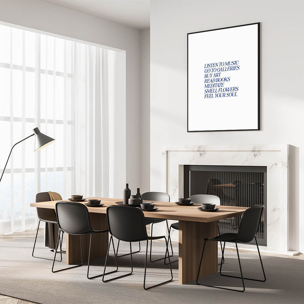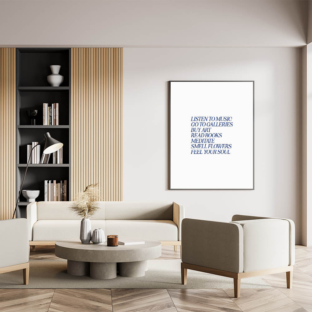Inspire mindfulness and creativity with this electric wall art featuring the motivational text: "LISTEN TO MUSIC, GO TO GALLERIES, BUY ART..." and more. The clean, minimalist typography in calming navy blue adds a touch of elegance and serenity to any room. Perfect for those who value a life filled with art, music, and meaningful moments, this vibrant art print offers both style and inspiration for any modern space.
