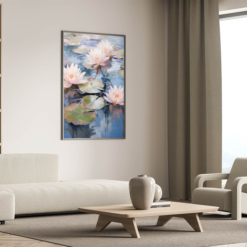 Embrace the serene beauty of nature with this Electric Water Lily Wall Art, showcasing a tranquil pond adorned with delicate water lilies in soft pastel tones. The calming blend of blues, greens, and light pinks creates a peaceful atmosphere, making it an ideal centerpiece for interiors seeking vibrant electric decor inspired by the elegance of nature. This artwork captures the reflection of the water, the gentle ripples, and the ethereal beauty of the lilies, making it perfect for bringing a sense of calm and sophistication to your space.