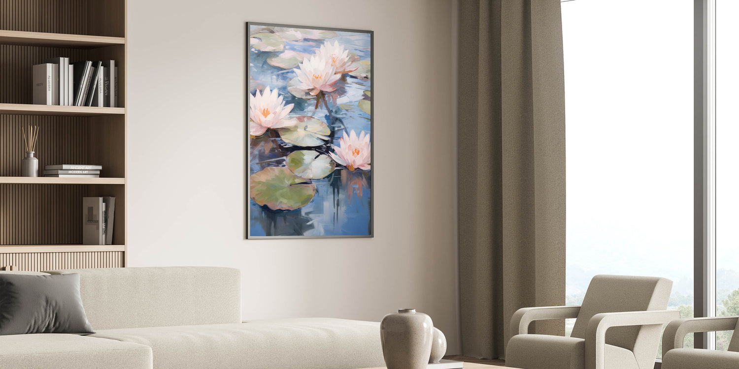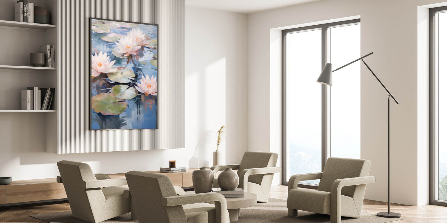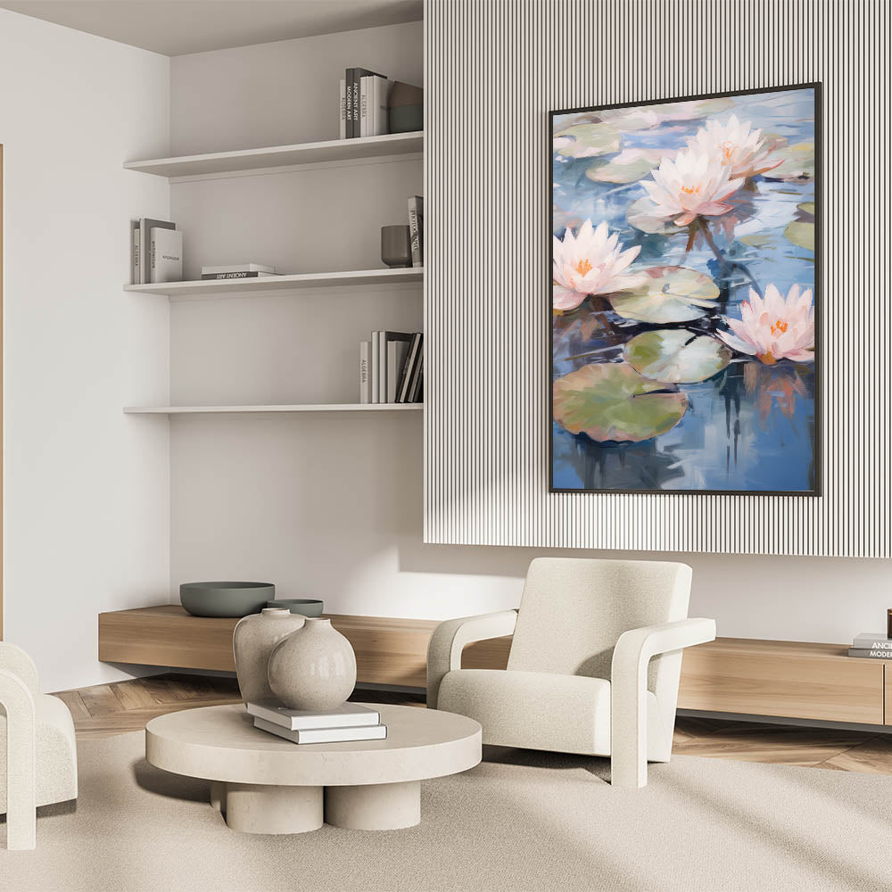 Transform your space with this bold electric artwork, designed to bring the peaceful beauty of water lilies into your home, creating a serene and stylish environment.
