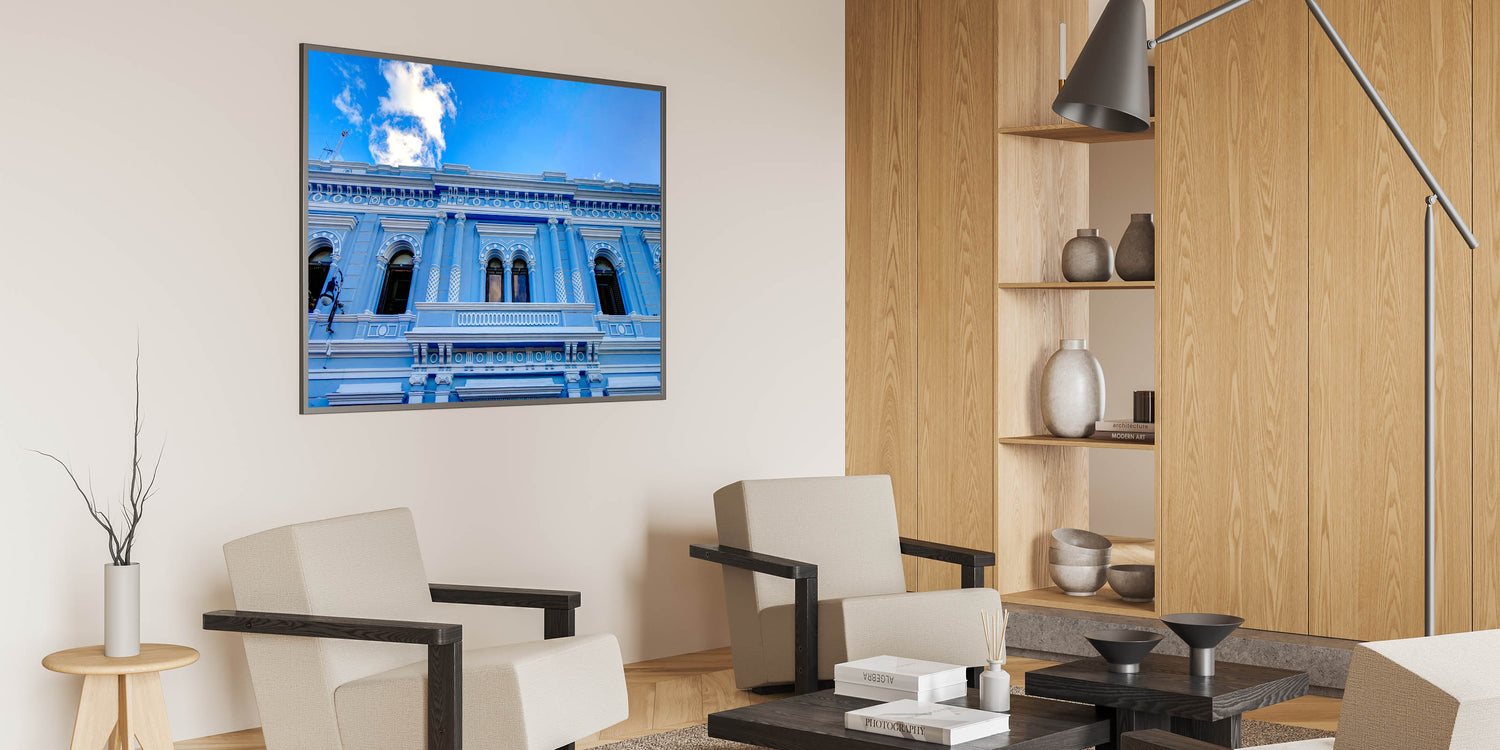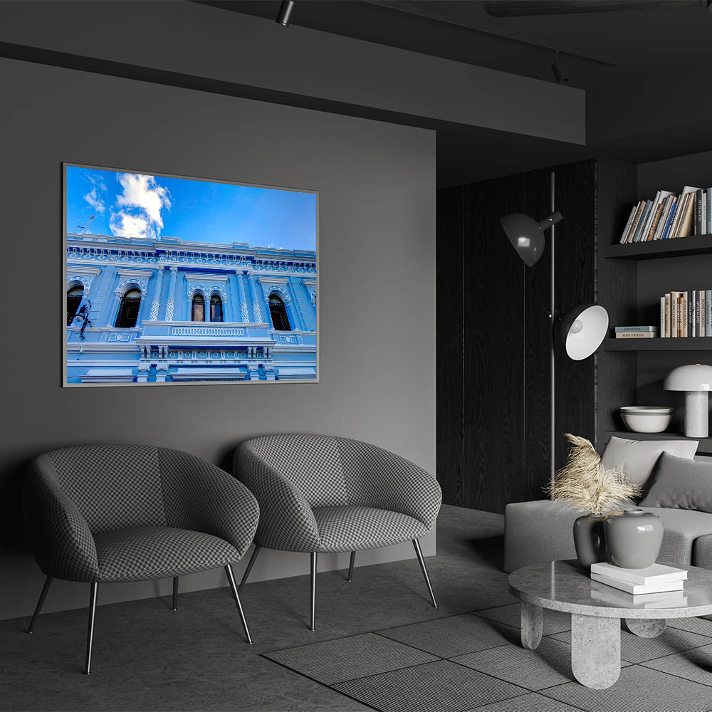 This striking wall art captures the intricate beauty of Yucatan’s elegant architecture, featuring a stunning blue facade against a bright sky. The detailed columns and arches showcase the region’s rich architectural heritage, making this piece perfect for anyone who appreciates Mexican cultural art and Yucatan travel photography. The vivid blue tones and ornate details make this Yucatan canvas art an excellent choice for adding a touch of elegance and history to your home or office.