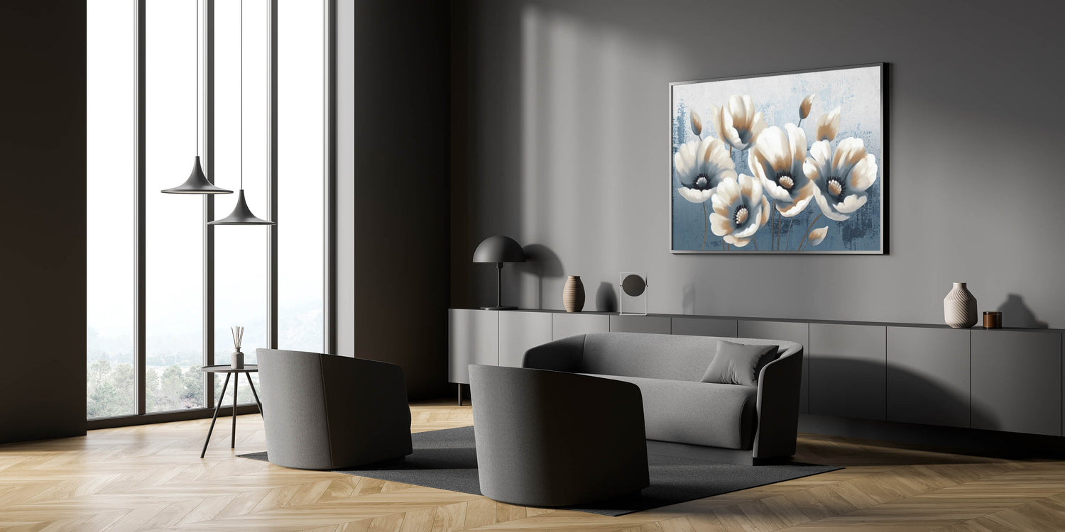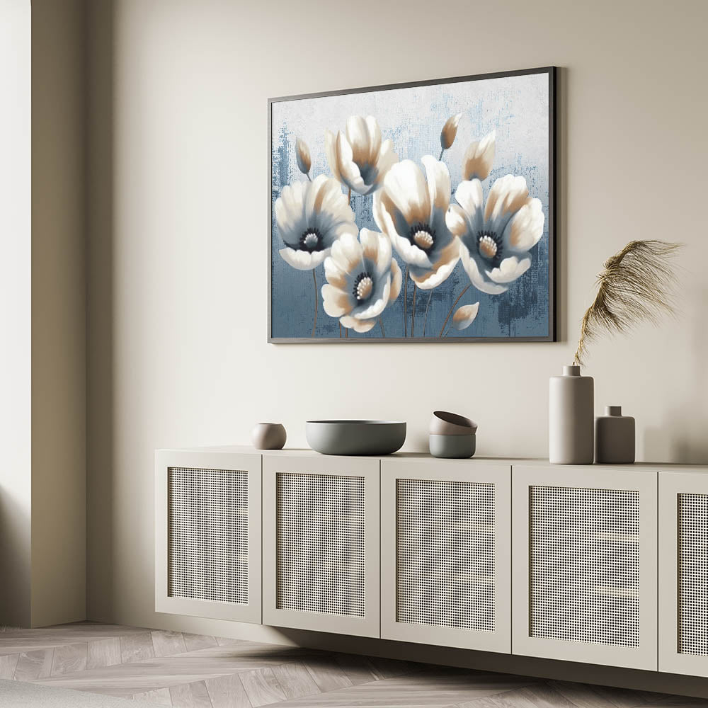 Enhance your living space with this elegant floral abstract artwork, where delicate blossoms are beautifully rendered in soft neutral and blue tones. The design features a cluster of blooming flowers with intricate detailing, set against a textured background that adds depth and dimension to the piece. This artwork is perfect for bringing a touch of sophistication and tranquility to any room.
