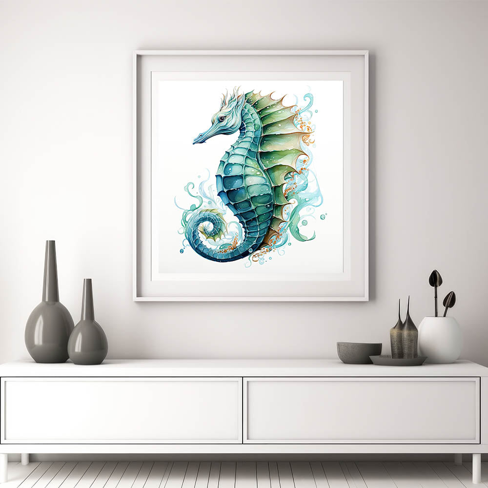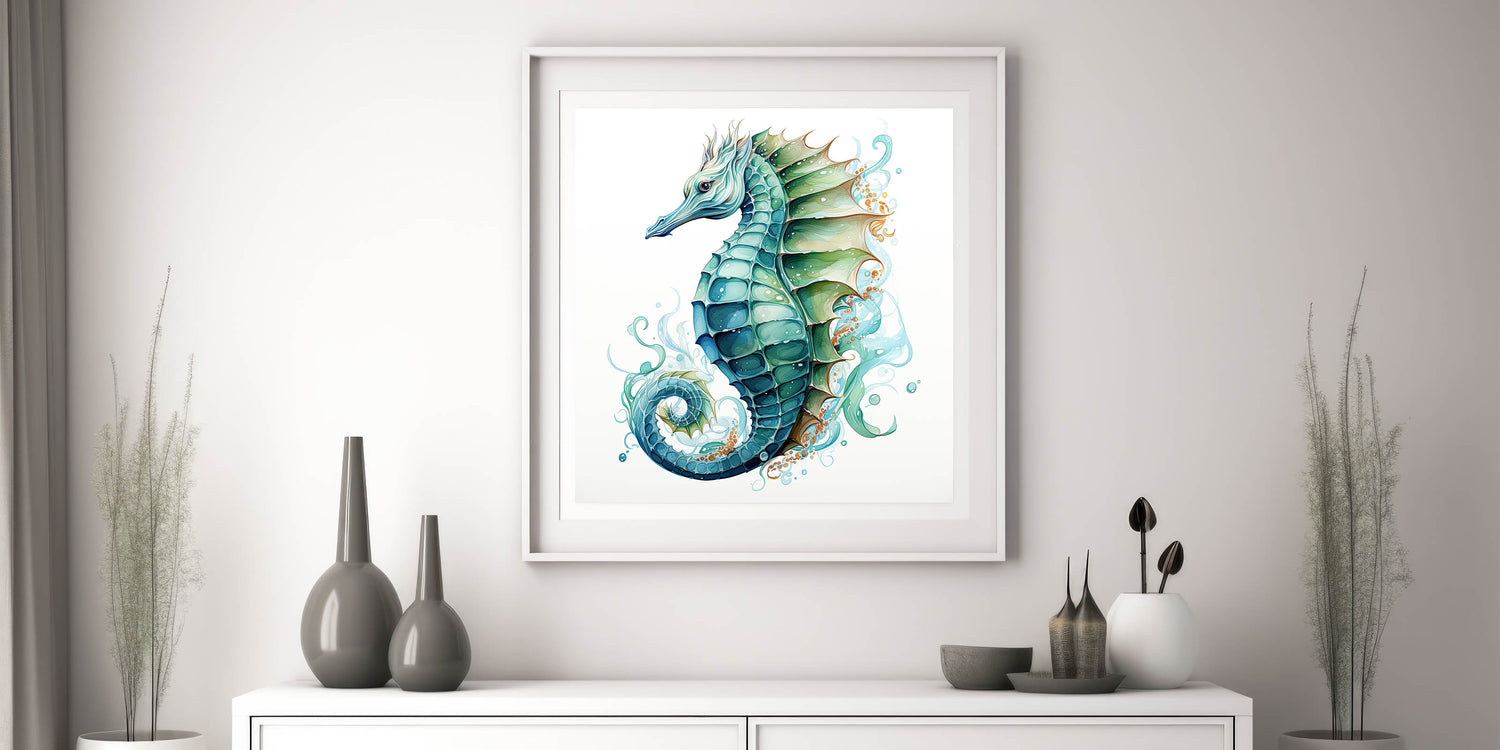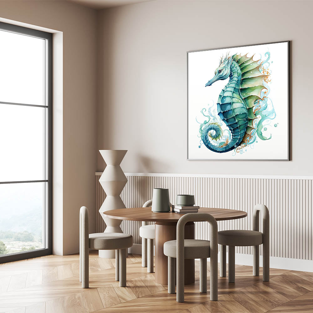 Immerse your space in the serene beauty of the ocean with this elegant seahorse wall art. The vibrant green and blue hues, combined with the intricate detailing of the seahorse, bring a sense of tranquility and natural elegance to any room. The delicate curves and fluid movement of the seahorse are beautifully complemented by the soft, swirling underwater elements that surround it, making this artwork a stunning focal point.