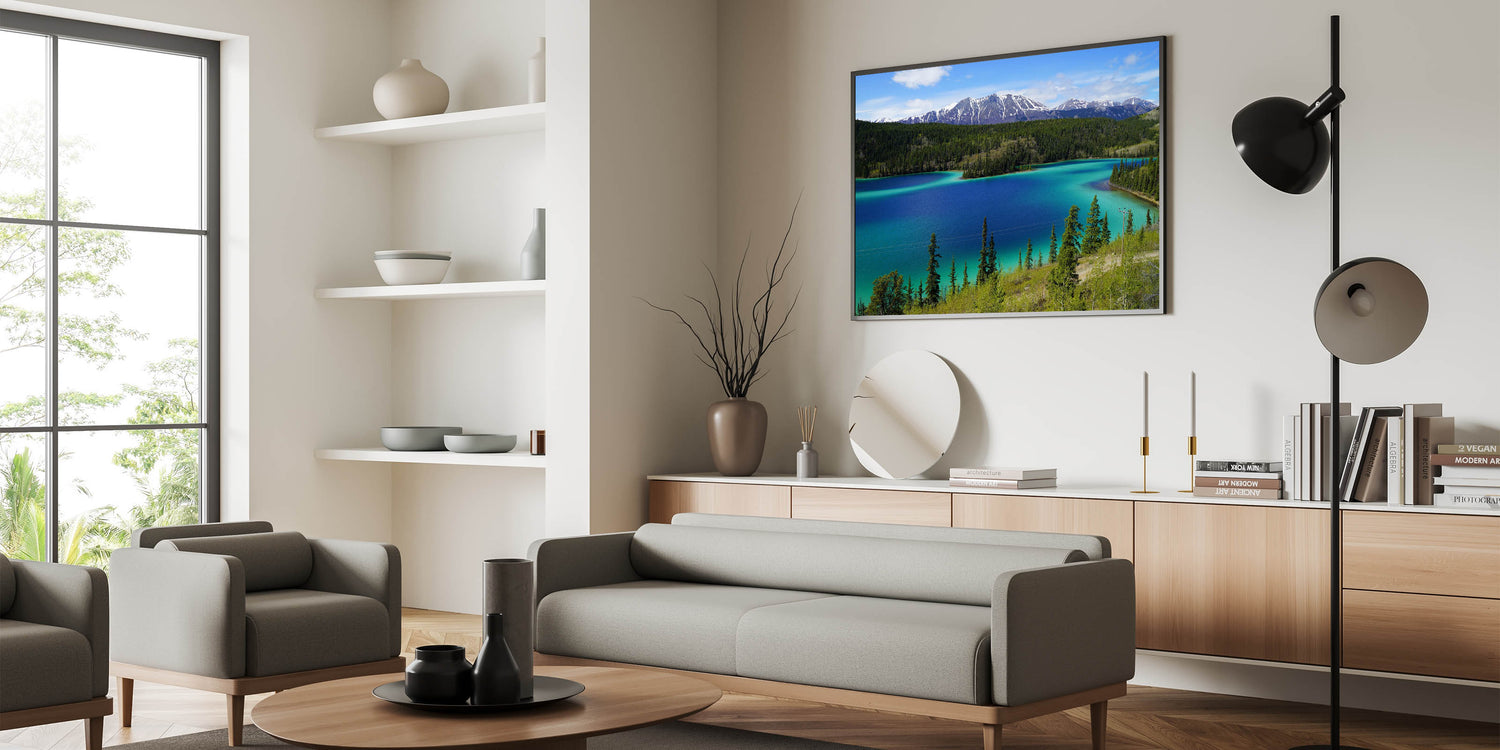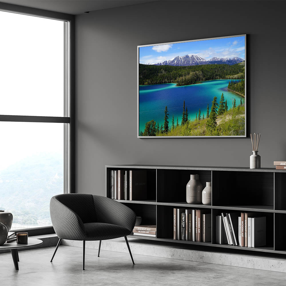 Discover the pristine beauty of Yukon's Emerald Waters with our canvas print, showcasing the vivid turquoise hues of a secluded lake encircled by lush green forests and majestic snow-capped mountains.
