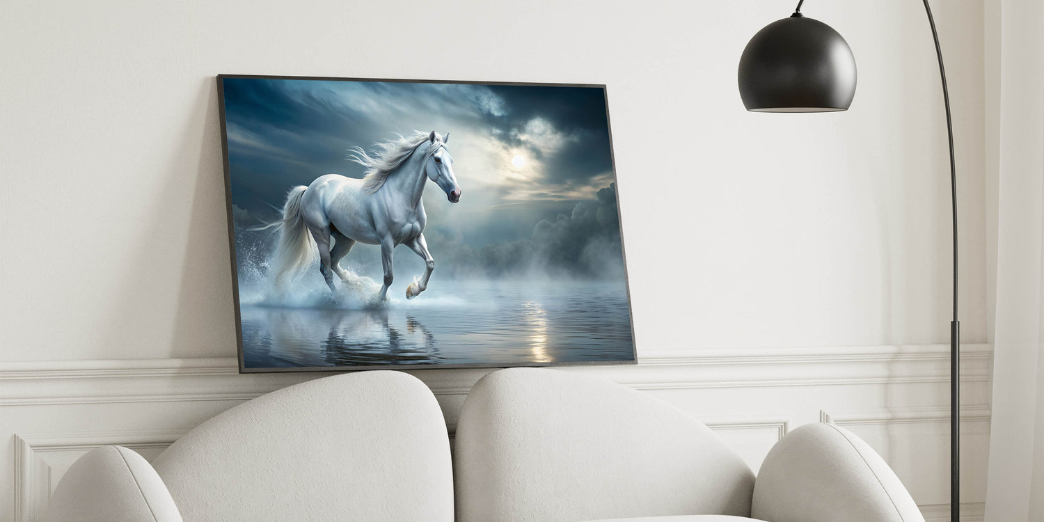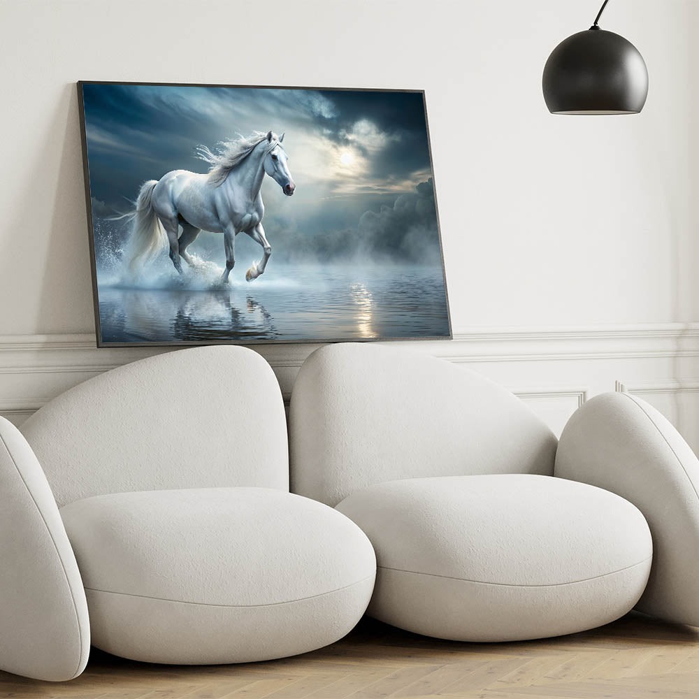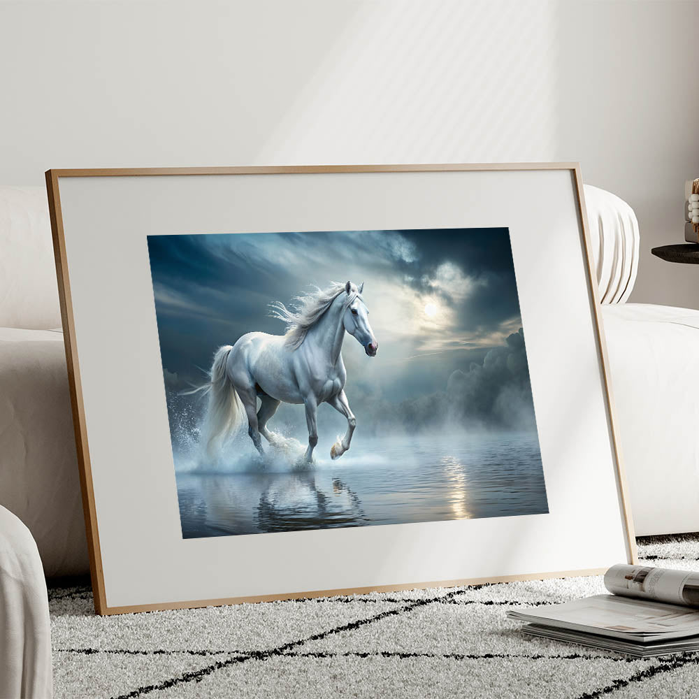 Step into a mystical world with this enchanting white horse wall art, where the ethereal beauty of a majestic horse meets the serene stillness of a misty water landscape. The soft hues of blue and white create a tranquil ambiance, making this artwork a perfect addition to any space that needs a touch of elegance and calm. The horse, captured in mid-stride, evokes a sense of freedom and grace, embodying the very essence of equestrian beauty.