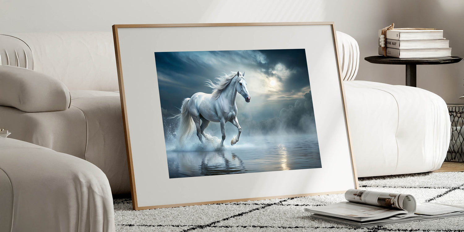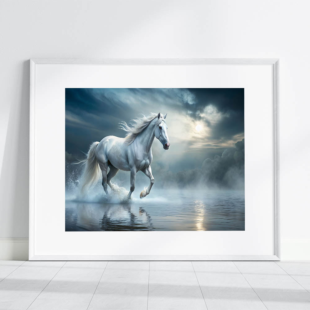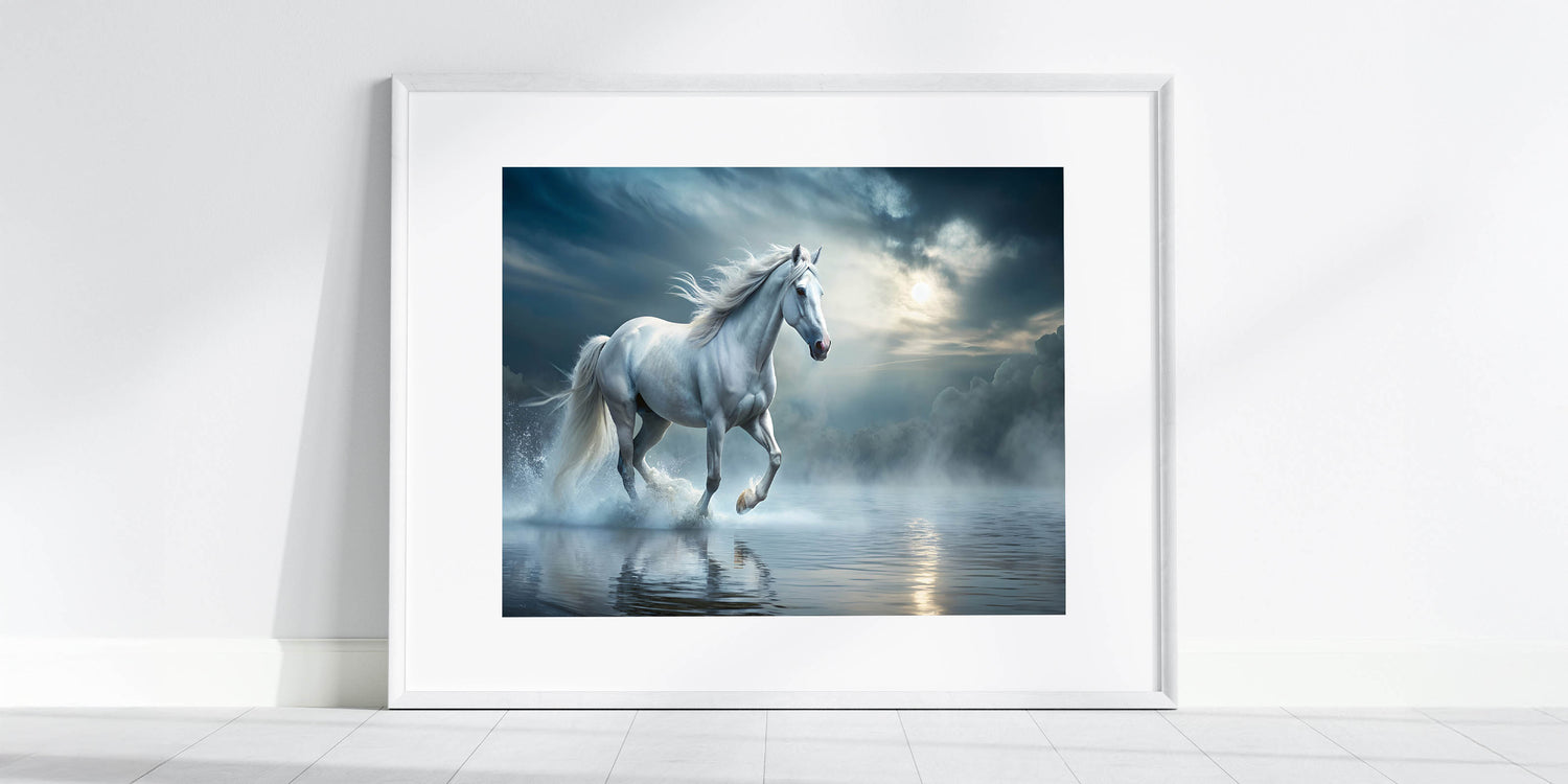 Step into a mystical world with this enchanting white horse wall art, where the ethereal beauty of a majestic horse meets the serene stillness of a misty water landscape. The soft hues of blue and white create a tranquil ambiance, making this artwork a perfect addition to any space that needs a touch of elegance and calm. The horse, captured in mid-stride, evokes a sense of freedom and grace, embodying the very essence of equestrian beauty.