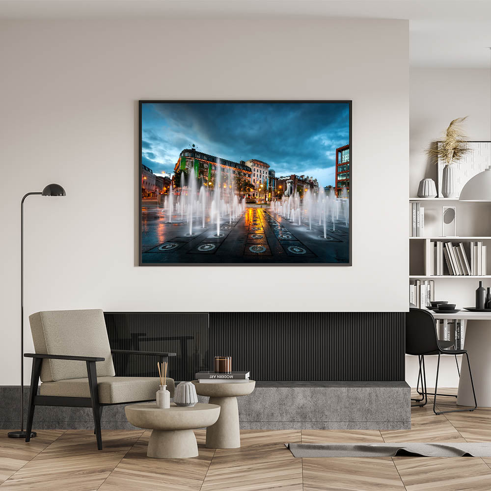 Capture the beauty of a stunning evening in the heart of England with this Piccadilly Circus canvas art. Featuring the elegant cityscape set against a dramatic sky, this artwork highlights the dynamic fountains that light up the square. The blend of architectural detail and the reflections in the water make it a striking addition to any space, perfect for those who love UK cityscapes.