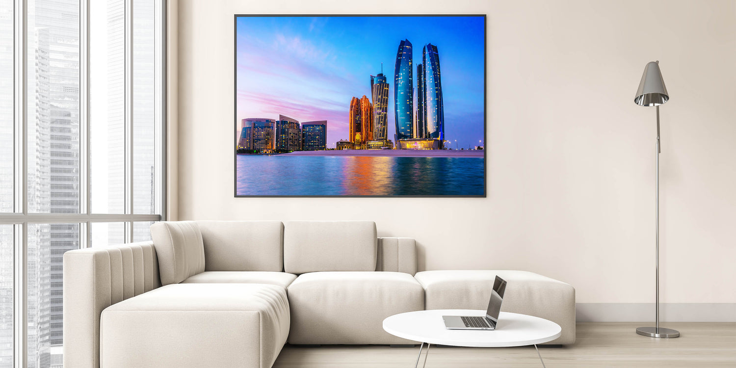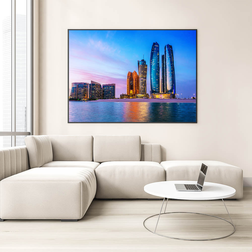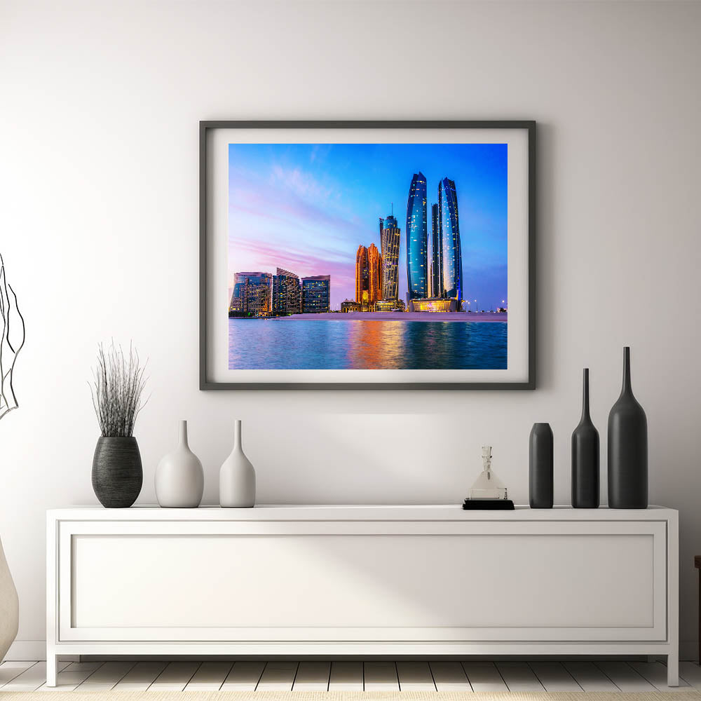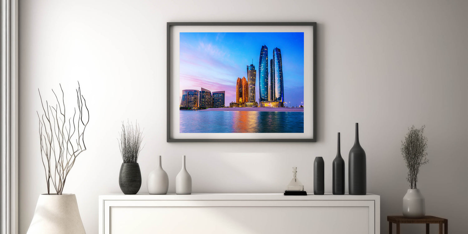- High-quality art print capturing the vibrant Abu Dhabi skyline and the majestic Etihad Towers