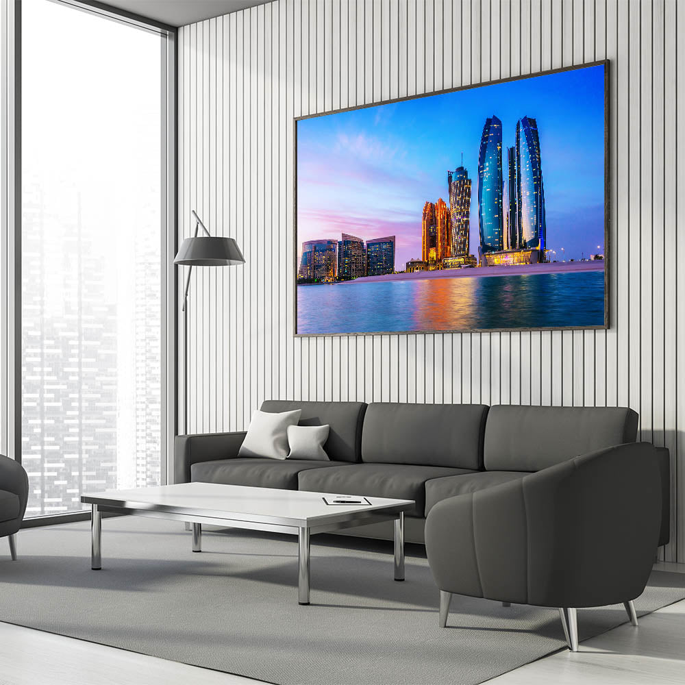 This vibrant cityscape wall art of Abu Dhabi brings the beauty of modern architecture and the serenity of the coast together in one beautiful piece. Whether for your living room, bedroom, or workspace, this print will enhance your décor with its striking mix of colors and sleek architectural lines.