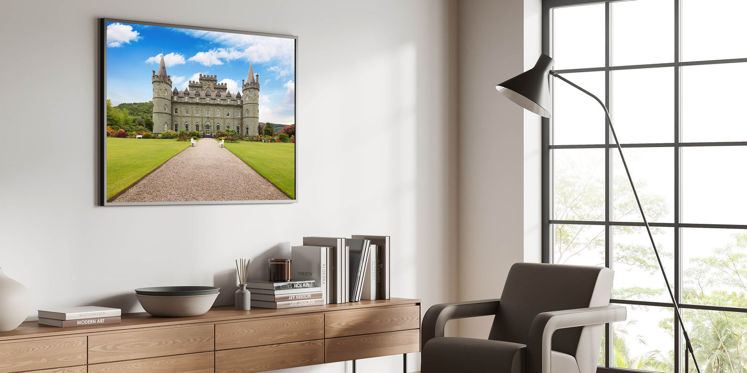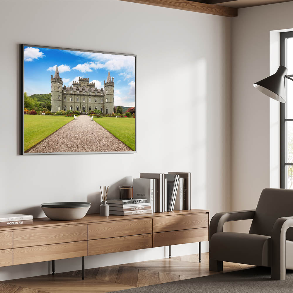 Enhance your space with the timeless beauty of this majestic castle wall art. This stunning print captures a grand European castle, surrounded by lush gardens and set against a brilliant blue sky. The meticulous details of the castle's architecture and the vibrant colors of the landscape create a serene and inviting scene, perfect for adding a touch of elegance to any room.