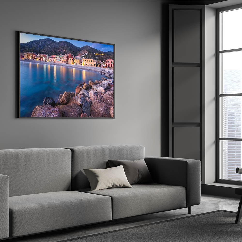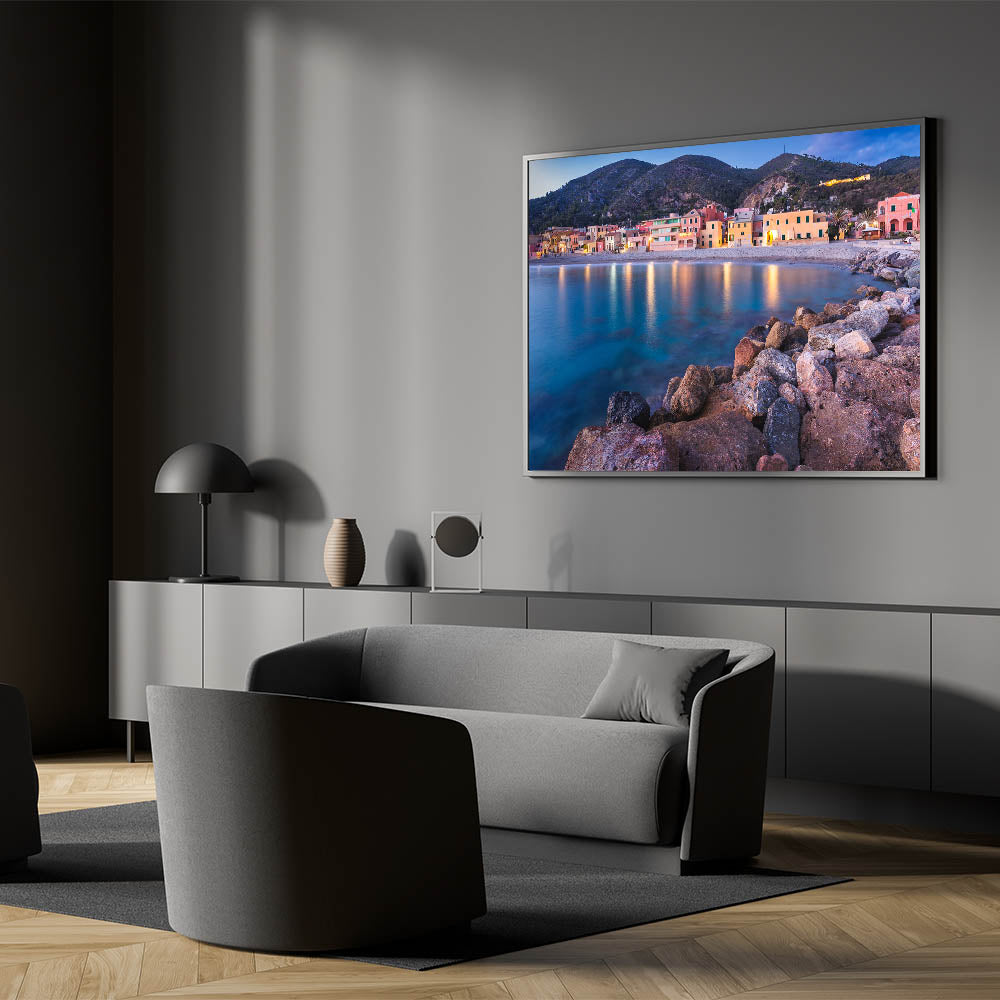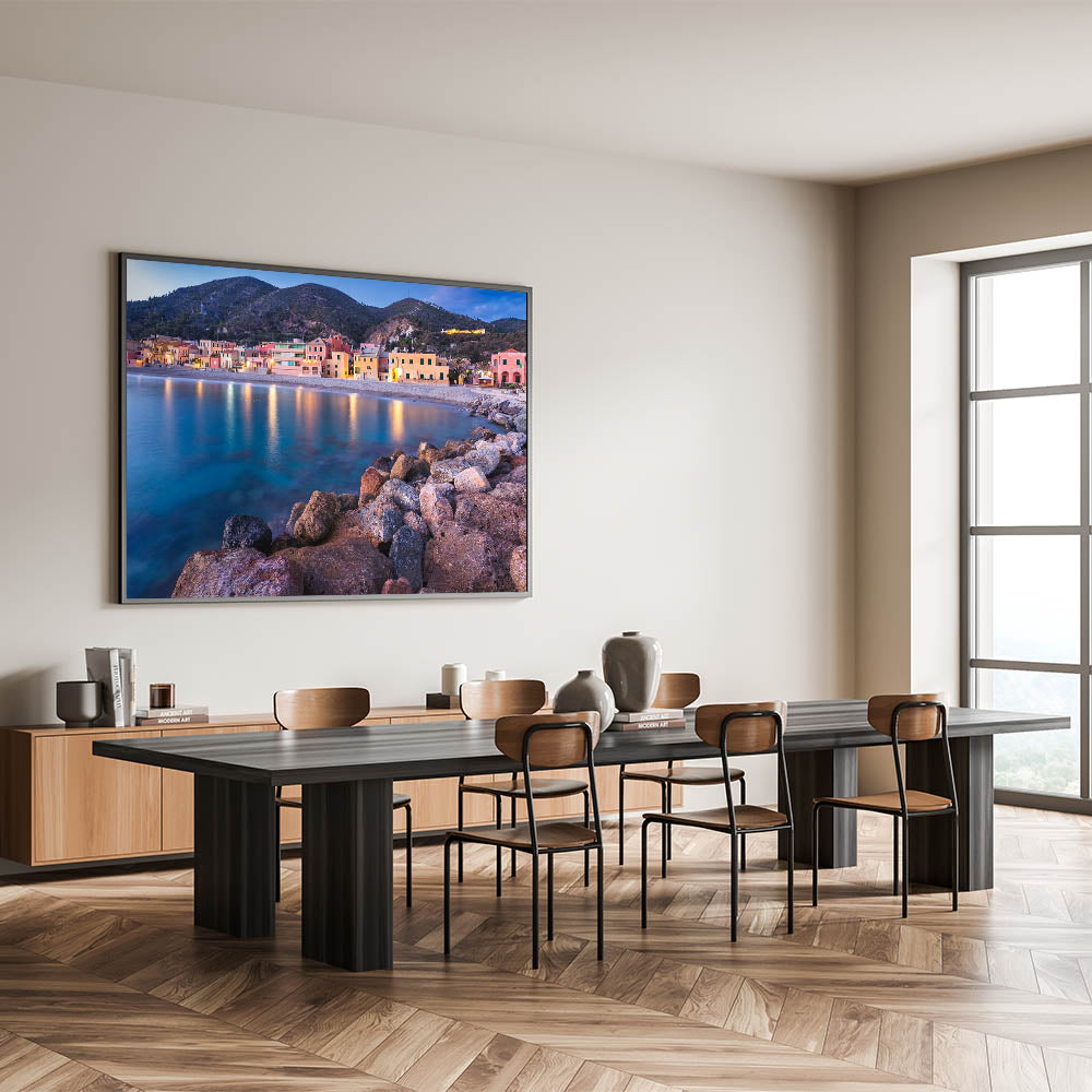 This Idyllic village canvas print invites you to relax and unwind with the calming beauty of a coastal evening. It's an ideal piece for those who love the sea and the peaceful charm of village life, making it a perfect addition to your art collection.
