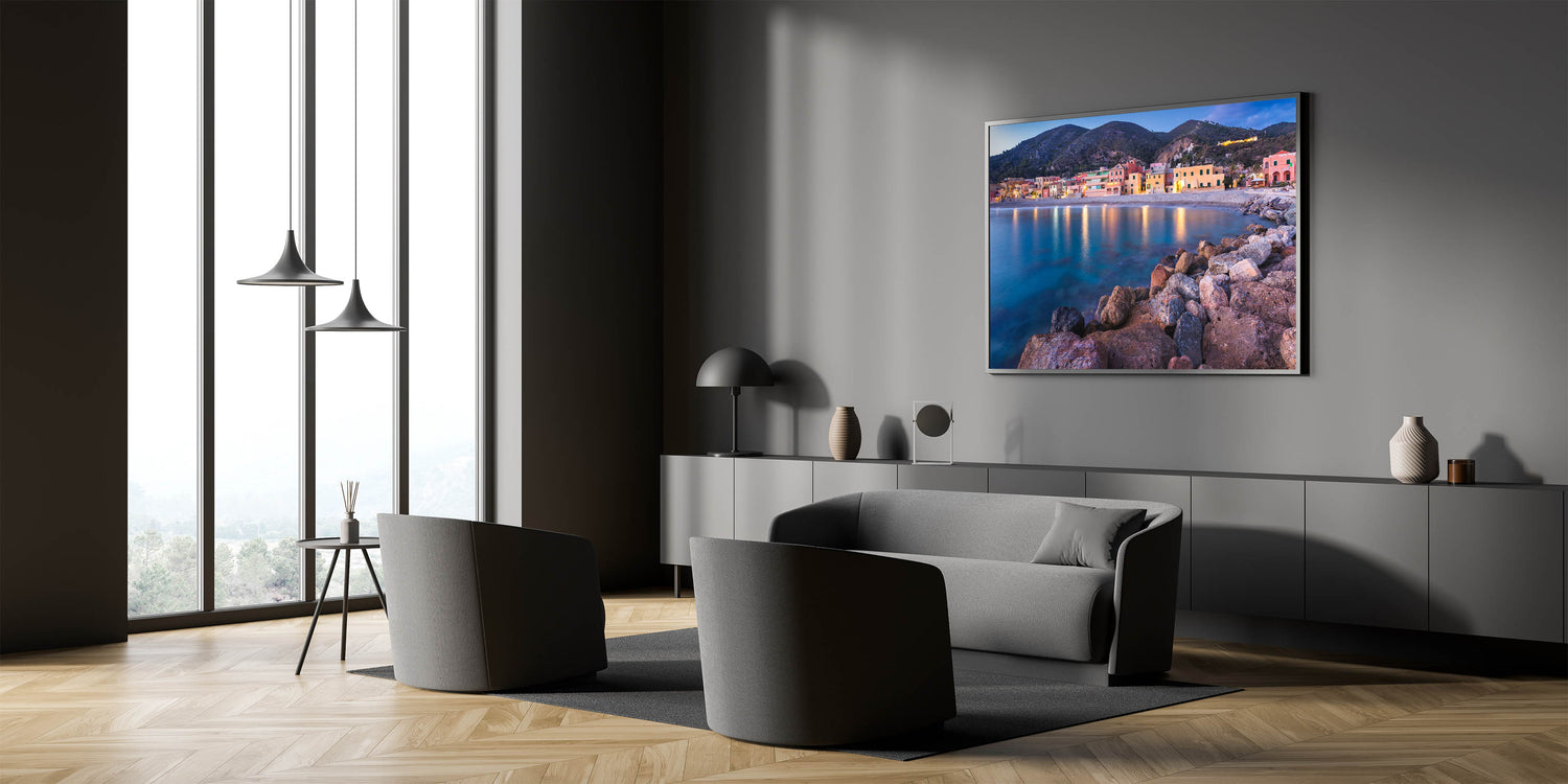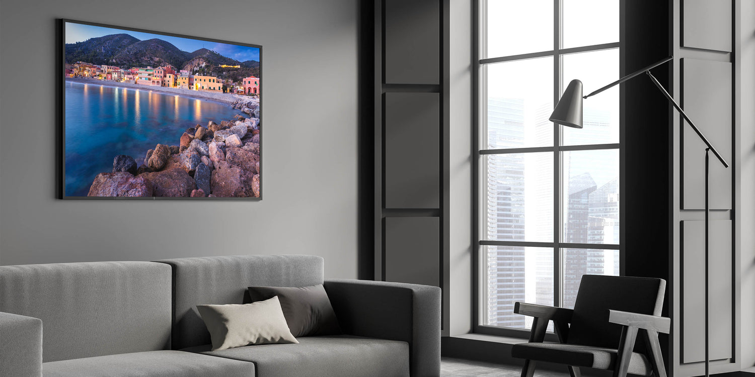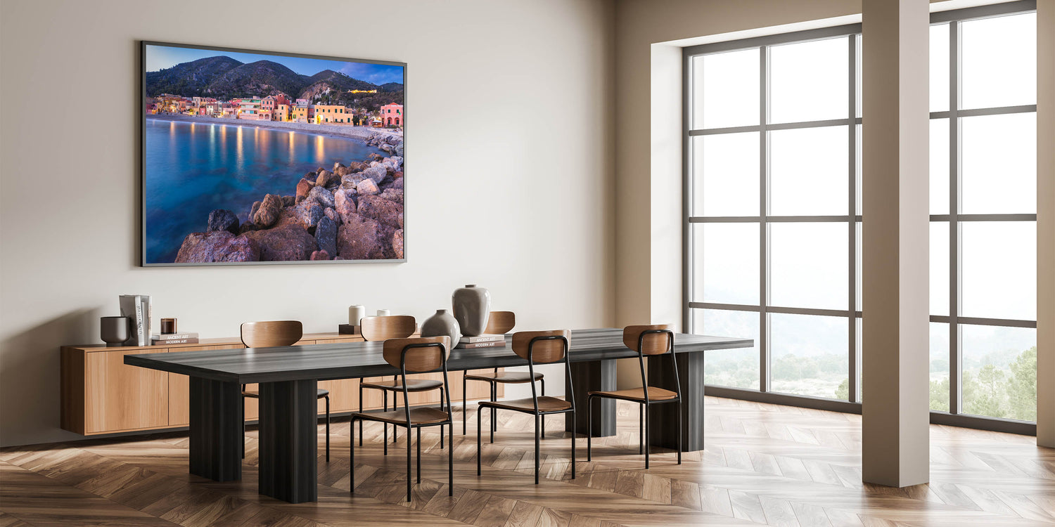 This Idyllic village canvas print invites you to relax and unwind with the calming beauty of a coastal evening. It's an ideal piece for those who love the sea and the peaceful charm of village life, making it a perfect addition to your art collection.