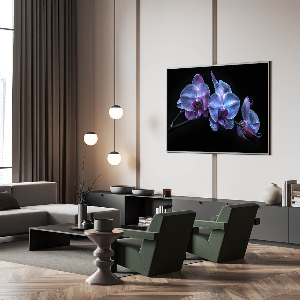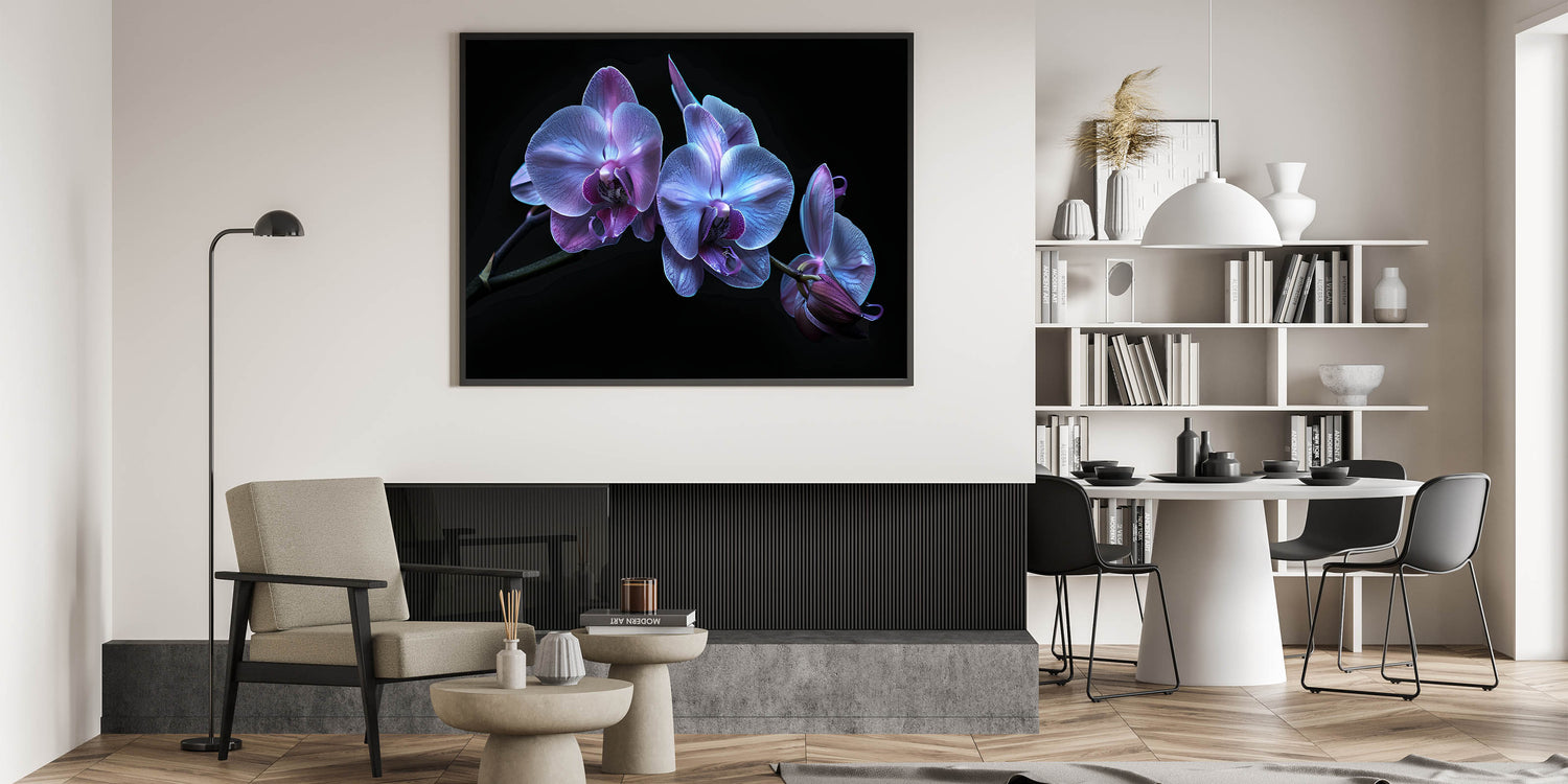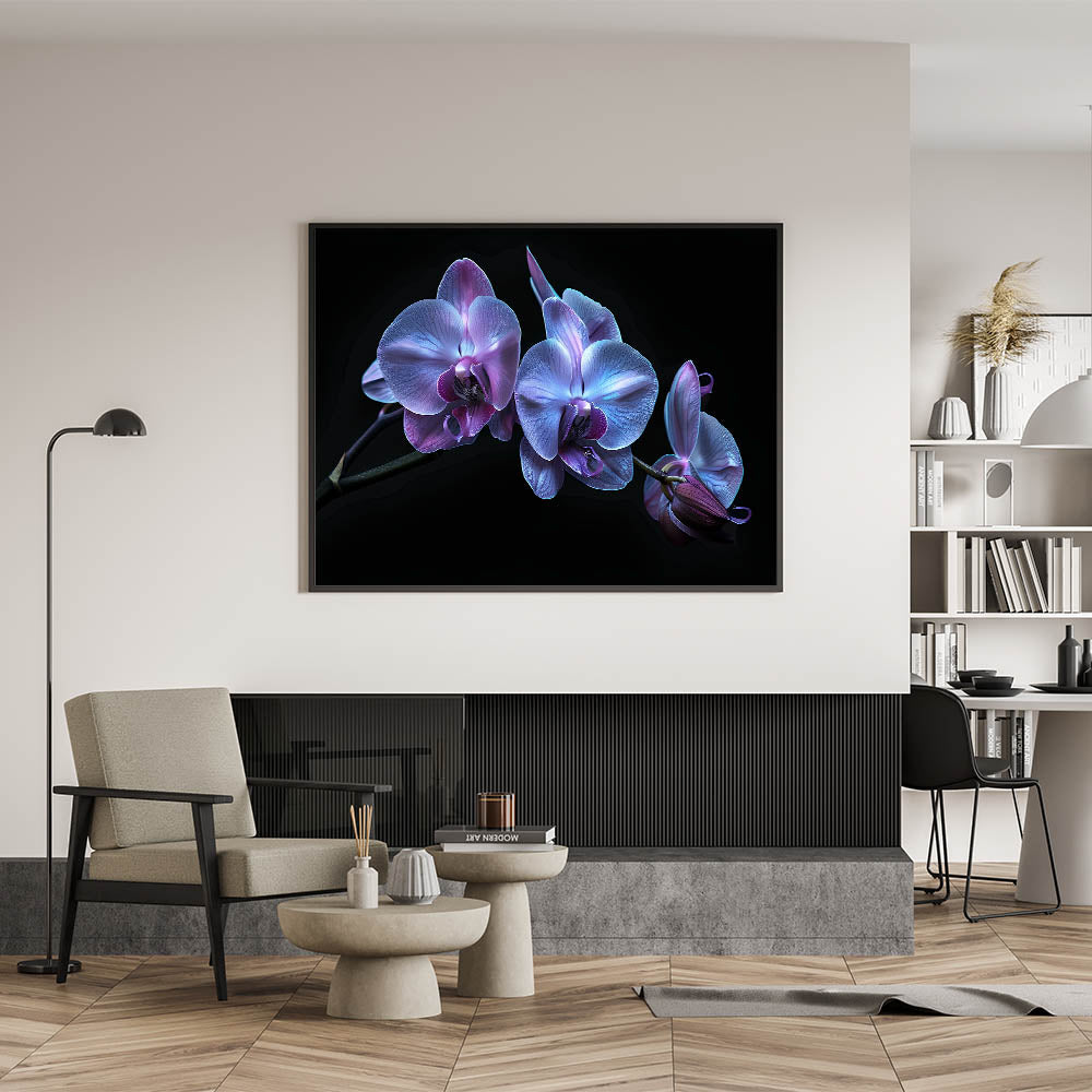 Add a touch of elegance to your home with this mesmerizing Blue Orchid Flower Wall Art. Featuring a stunning close-up of delicate orchid petals in soft blue and purple hues, this artwork is perfect for those looking to bring the beauty of nature indoors. The deep, rich tones contrast beautifully against the black background, creating a dramatic yet sophisticated statement piece for any room.