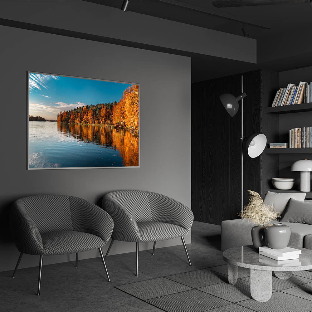 This scenic Finland art print showcases the peaceful beauty of Nordic nature during autumn, offering a calming view of Finland’s natural splendor. With high-quality printing on your chosen material, this artwork will elevate your home’s décor and provide a touch of seasonal charm.