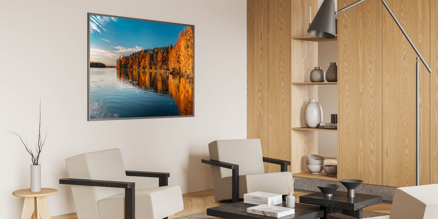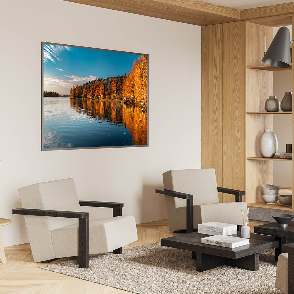 Capture the magic of Finland’s autumn with this stunning wall art, featuring a serene lake surrounded by vibrant orange and red foliage. This Finnish nature canvas brings the beauty of the Nordic landscape into your home, perfect for those who love the changing seasons and peaceful waterscapes. Whether for your living room, office, or bedroom, this artwork adds warmth and color to any space.