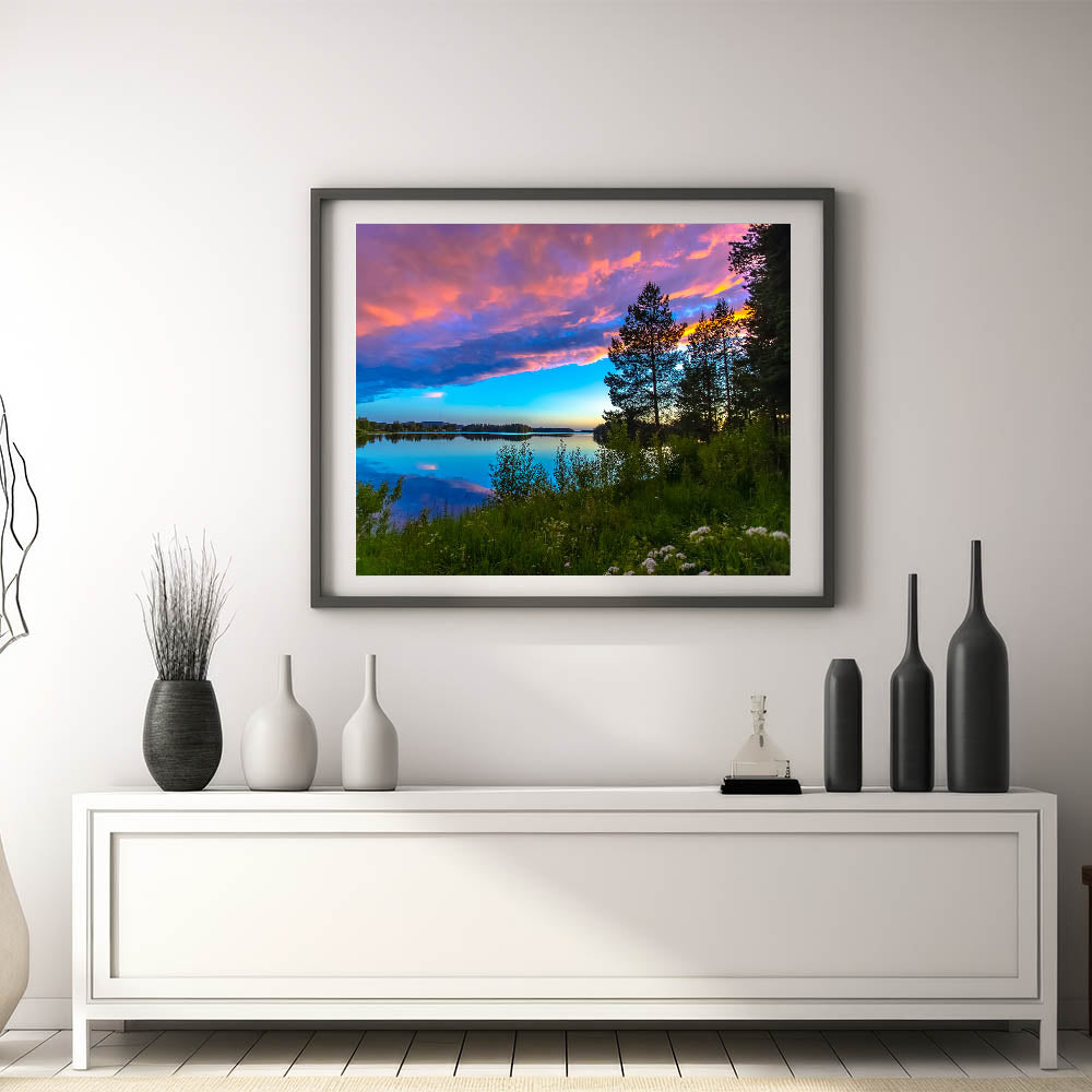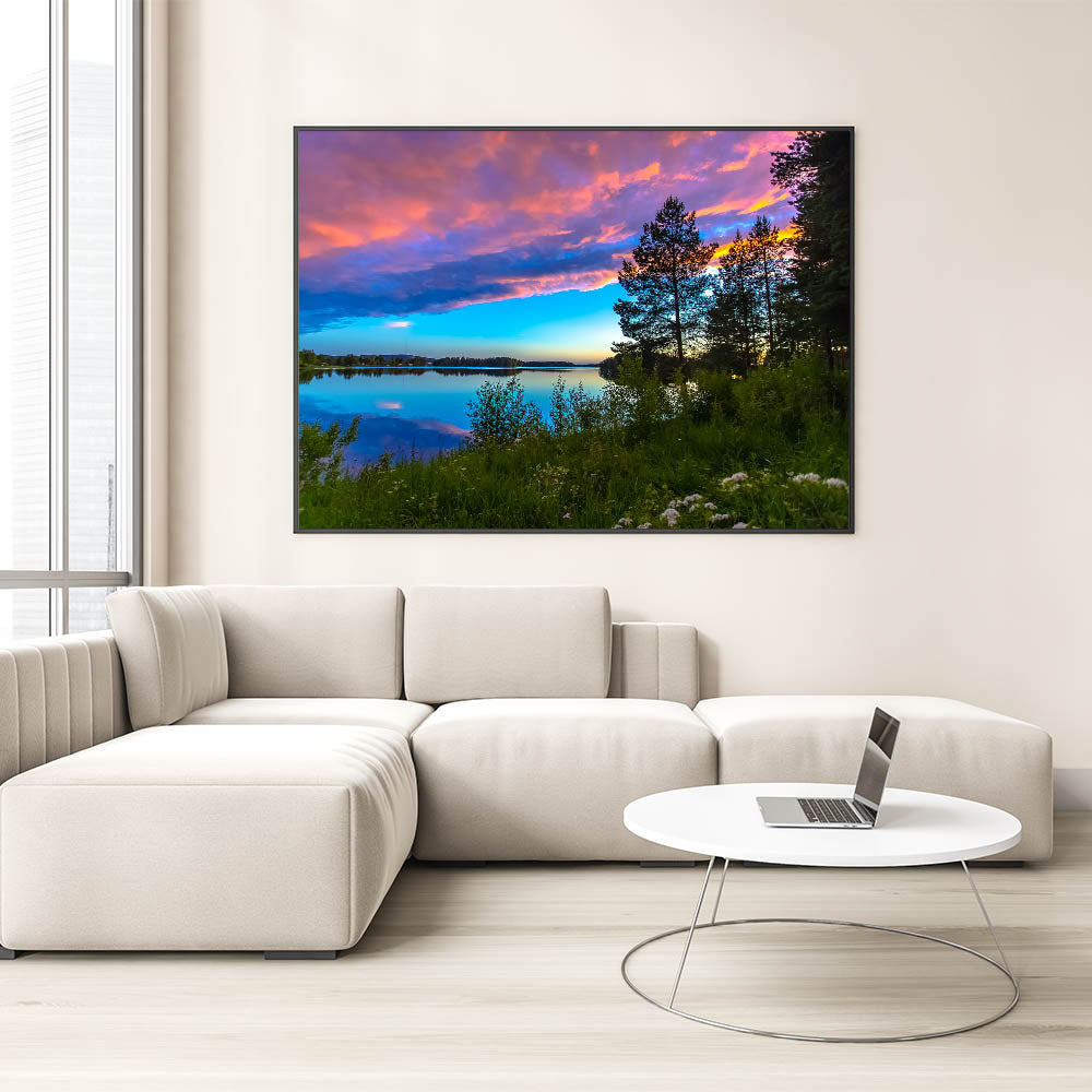 Transform your space with the vibrant beauty of Finland’s natural landscapes through this stunning wall art. This artwork captures the magic of a colorful sunset over a calm lake, with the sky bathed in rich hues of pink, purple, and blue. The peaceful lake reflects the stunning colors, while the trees and greenery along the shore add a touch of tranquility. This scenic piece is perfect for nature lovers and anyone seeking a bold, colorful focal point for their home or office.