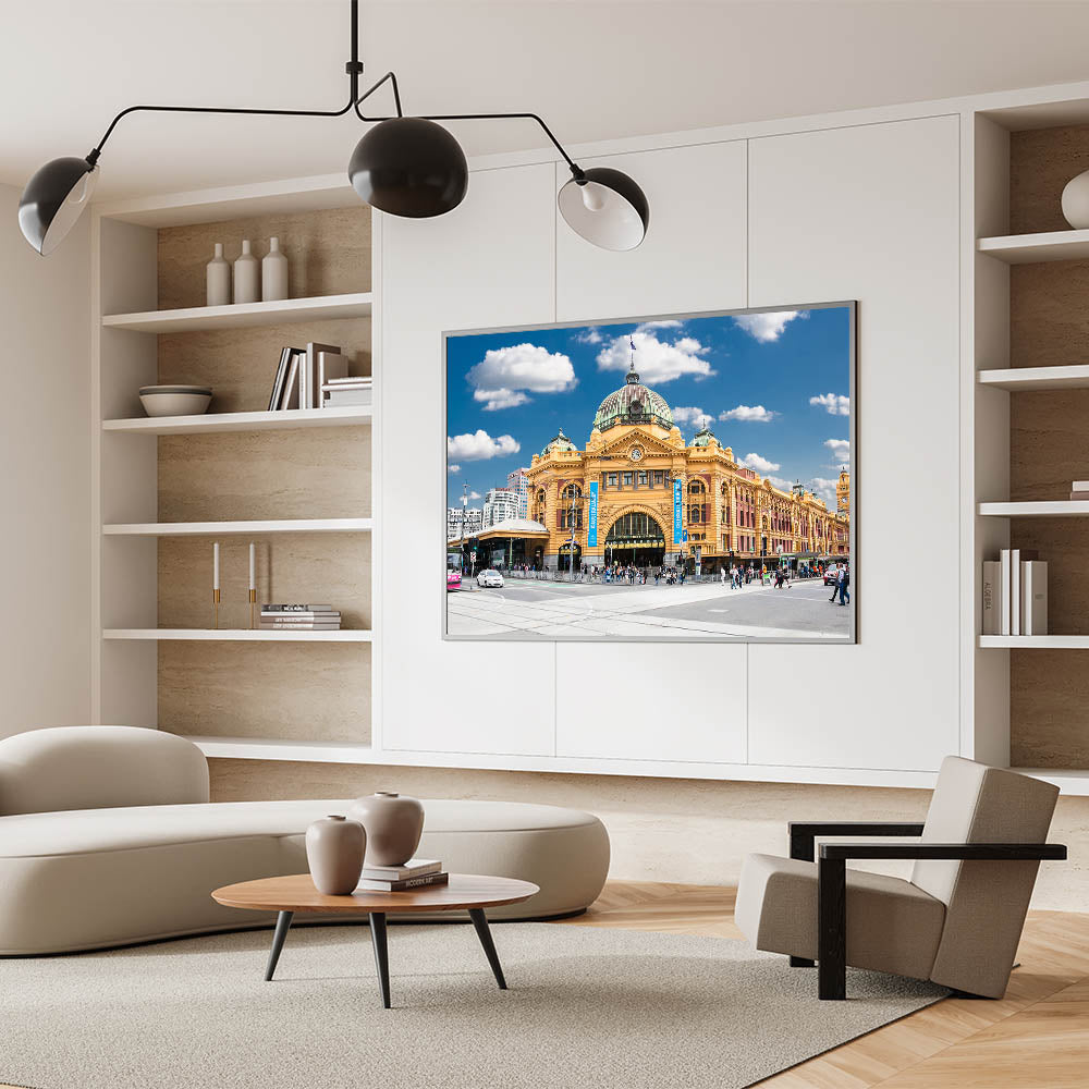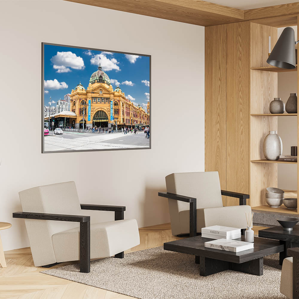 Celebrate the iconic beauty of Melbourne with this stunning wall art of Flinders Street Station. This landmark image captures the vibrant architecture of the historic station set against a bright blue sky with bustling city life below. Perfect for those who admire urban scenes, this artwork brings a touch of Melbourne’s rich history and modern vibrancy into your home decor. Whether you're a fan of cityscapes or historic landmarks, this piece will instantly add character to any space.